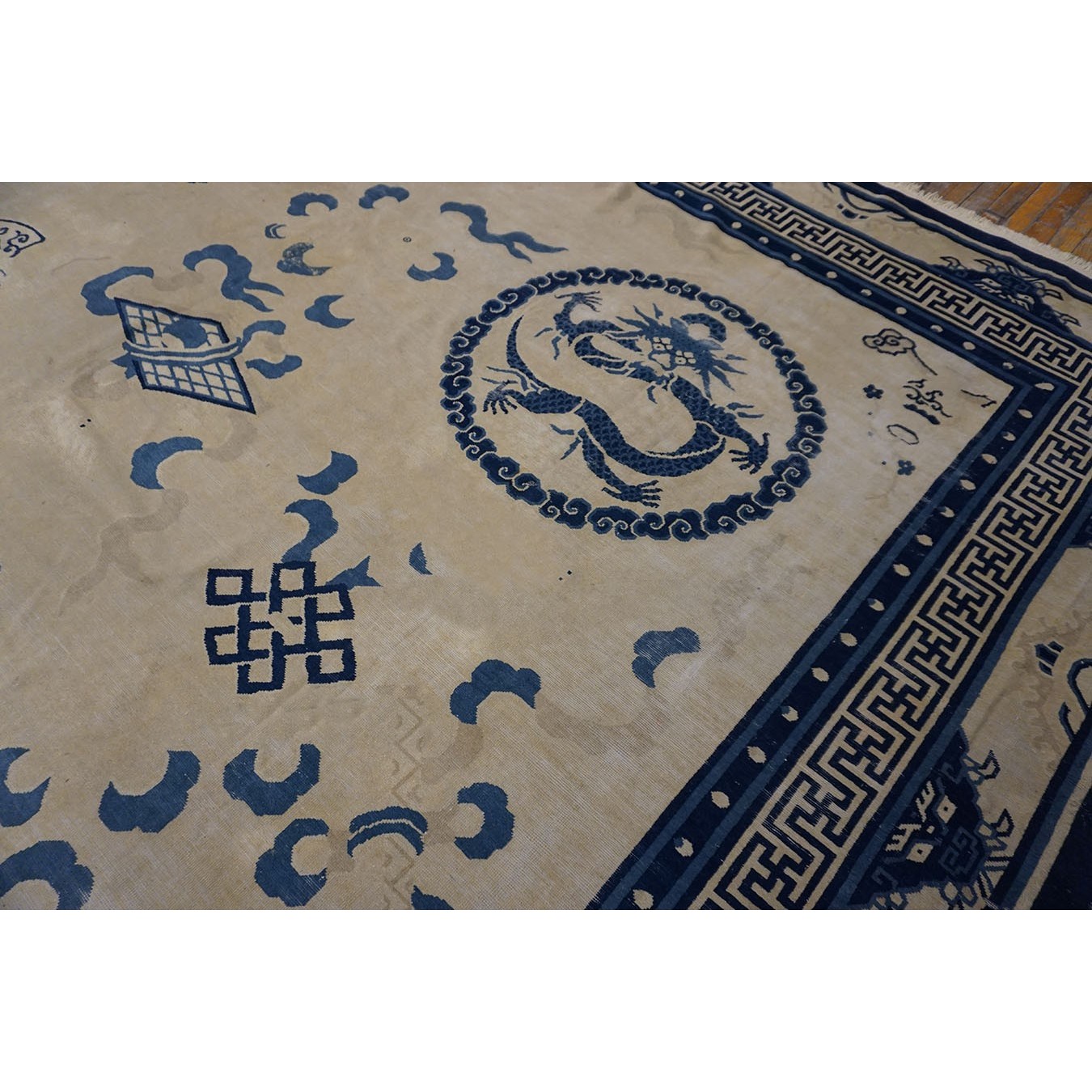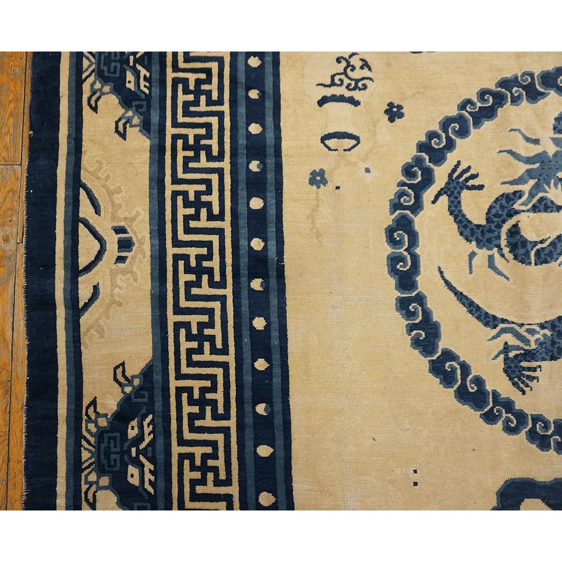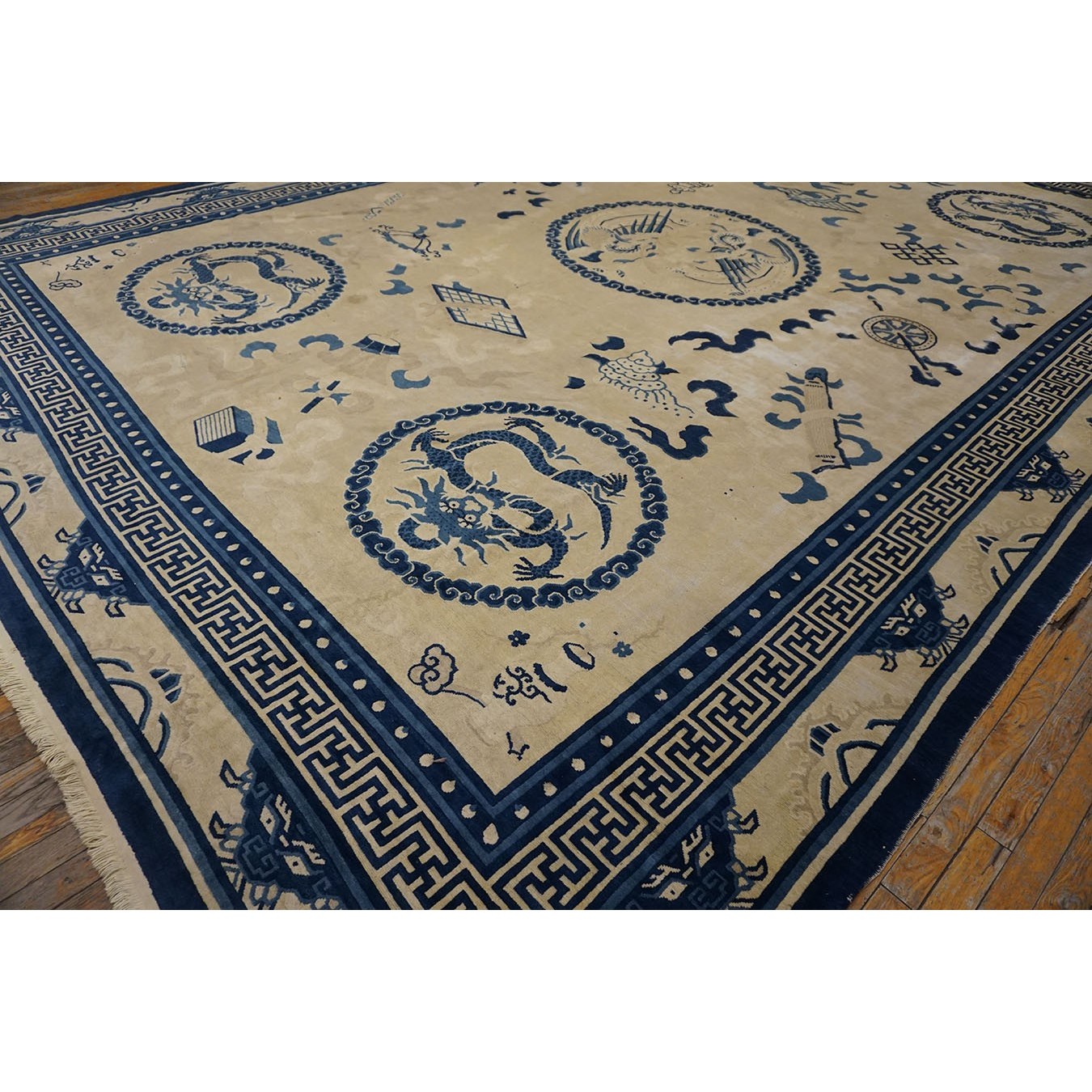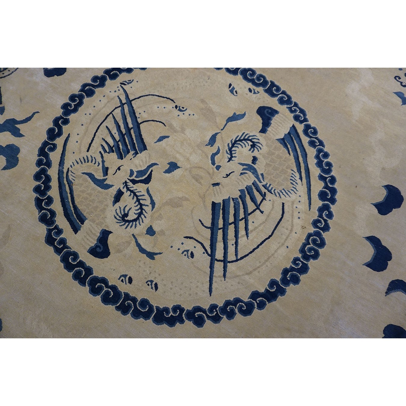 DescriptionChineseCarpets made in China proper. See entries Ningshia, Peking, Art Deco. Chinese - PekingThe commercial Peking carpet is a later 19th century development, begun by importing weaves from Ningshia (see entry) to create and export industry aimed at Western markets. The foundation is cotton and the pile is a good quality carpet wool which takes dyes particularly well. The neat medium weave is in Persian (asymmetric) knots. Designs are strictly Chinese and the whole motif repertoire of Chinese art is employed. Blue and white is the most popular color combination and red is particularly rare. Sizes tend to 9 x 12 and larger, and few small pieces appear. For a short time in the early 1920s Persian designs were woven to capitalize on the death of new Iranian goods. The industry decimated by the Communist Revolution relocated to the Pearl River area. There is a good supply of antique carpets at reasonable prices. | |