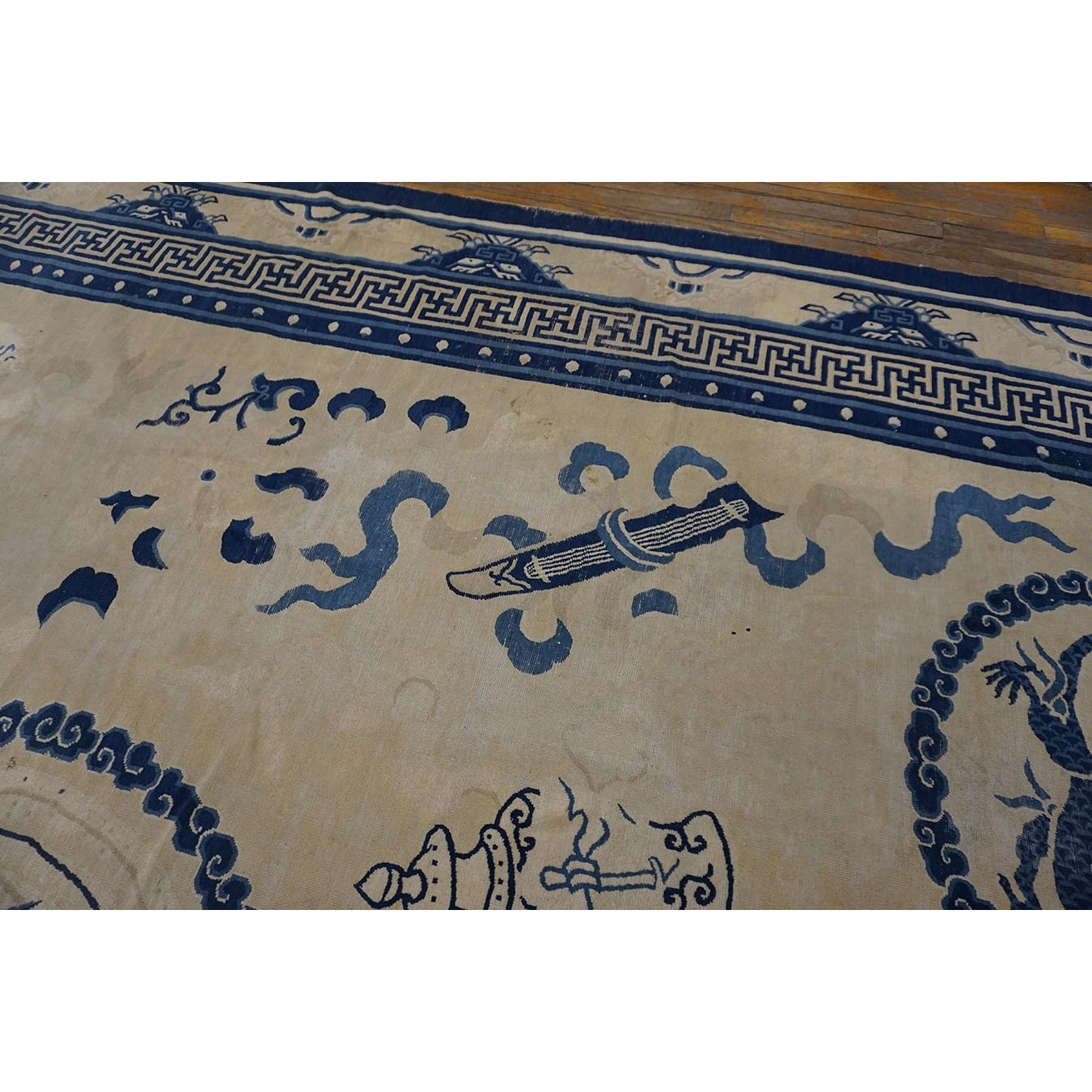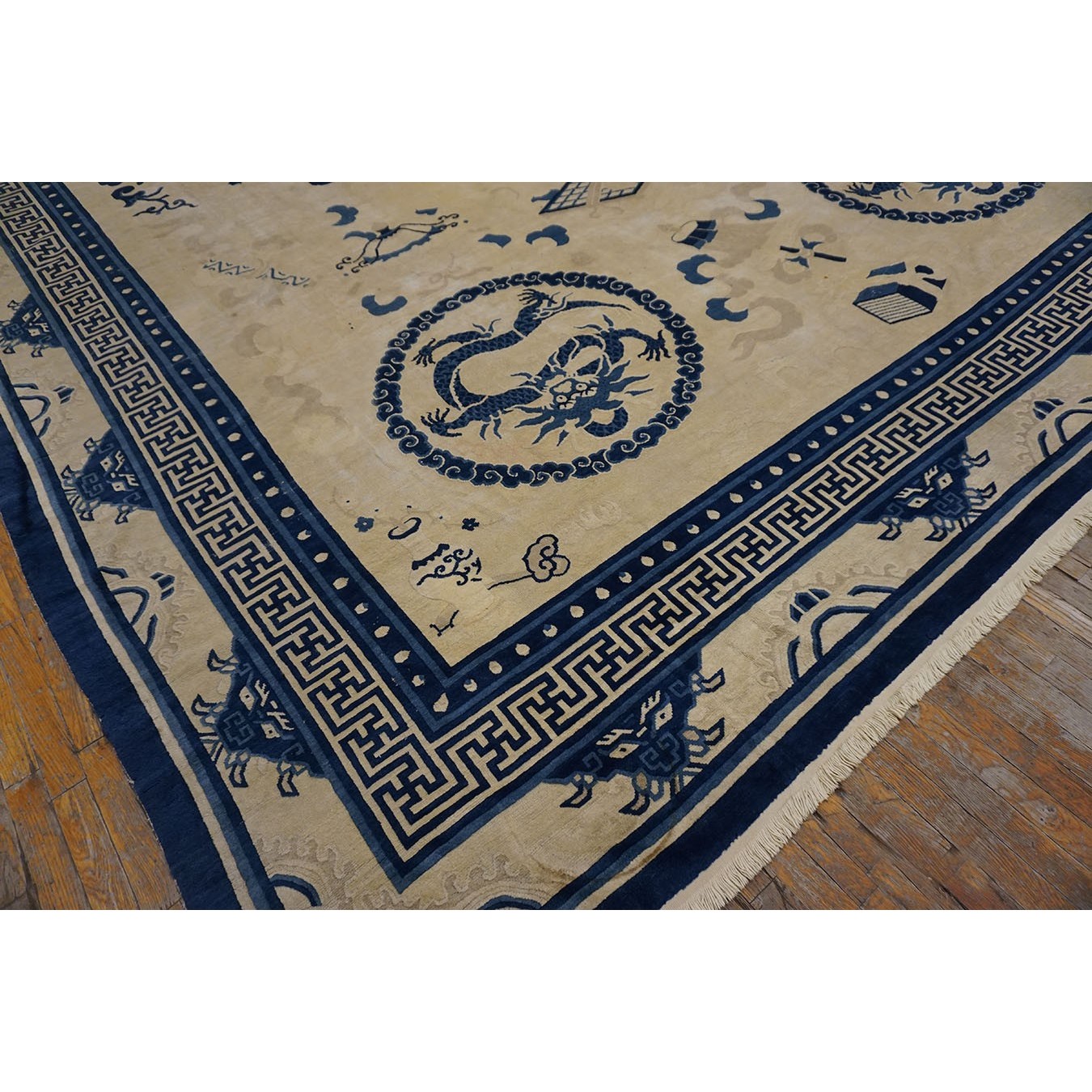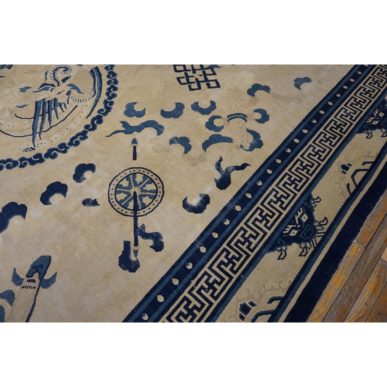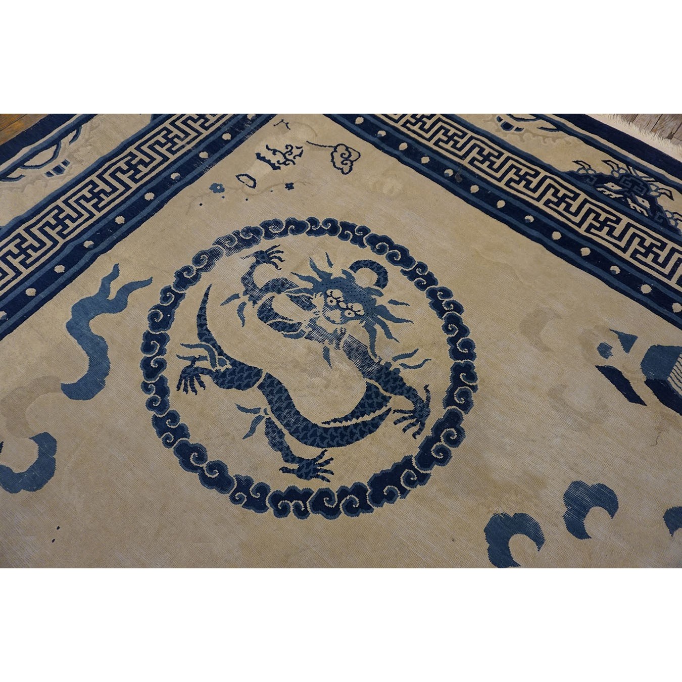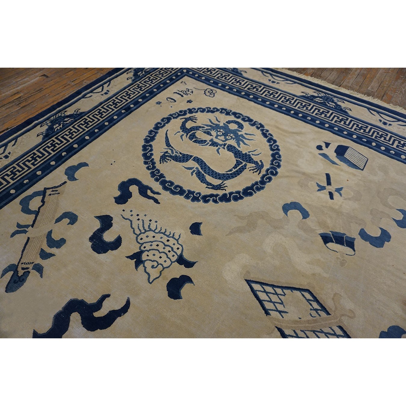 DescriptionChineseCarpets made in China proper. See entries Ningshia, Peking, Art Deco. Chinese - PekingThe commercial Peking carpet is a later 19th century development, begun by importing weaves from Ningshia (see entry) to create and export industry aimed at Western markets. The foundation is cotton and the pile is a good quality carpet wool which takes dyes particularly well. The neat medium weave is in Persian (asymmetric) knots. Designs are strictly Chinese and the whole motif repertoire of Chinese art is employed. Blue and white is the most popular color combination and red is particularly rare. Sizes tend to 9 x 12 and larger, and few small pieces appear. For a short time in the early 1920s Persian designs were woven to capitalize on the death of new Iranian goods. The industry decimated by the Communist Revolution relocated to the Pearl River area. There is a good supply of antique carpets at reasonable prices. | |