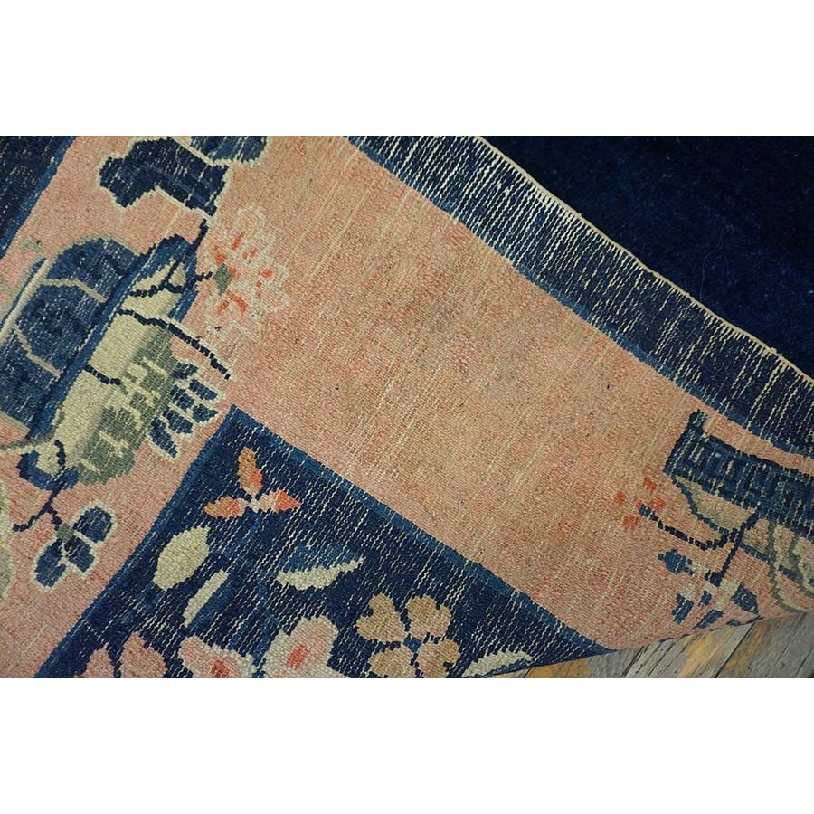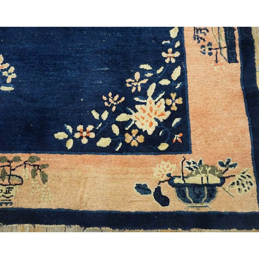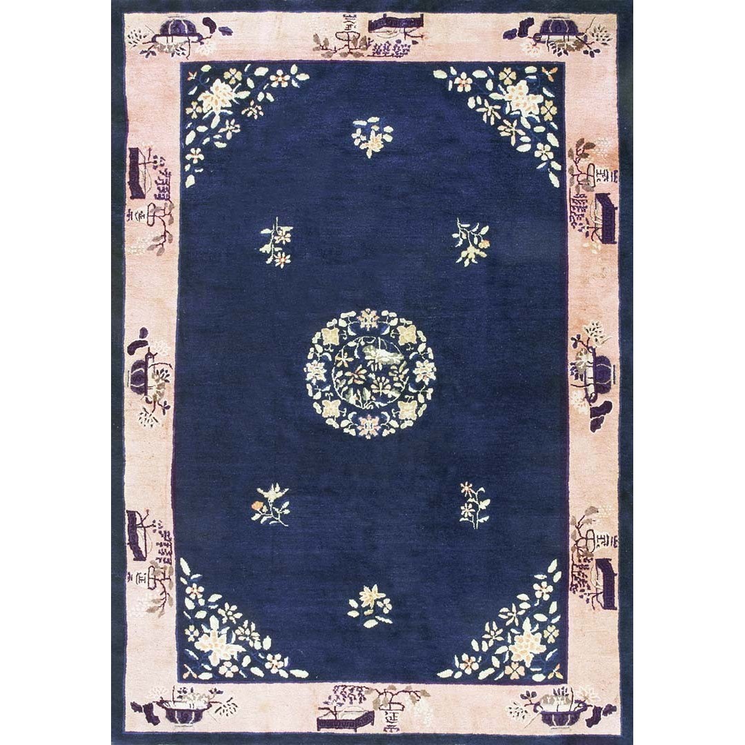 DescriptionChineseCarpets made in China proper. See entries Ningshia, Peking, Art Deco. Chinese - PekingThe commercial Peking carpet is a later 19th century development, begun by importing weaves from Ningshia (see entry) to create and export industry aimed at Western markets. The foundation is cotton and the pile is a good quality carpet wool which takes dyes particularly well. The neat medium weave is in Persian (asymmetric) knots. Designs are strictly Chinese and the whole motif repertoire of Chinese art is employed. Blue and white is the most popular color combination and red is particularly rare. Sizes tend to 9 x 12 and larger, and few small pieces appear. For a short time in the early 1920s Persian designs were woven to capitalize on the death of new Iranian goods. The industry decimated by the Communist Revolution relocated to the Pearl River area. There is a good supply of antique carpets at reasonable prices. | |