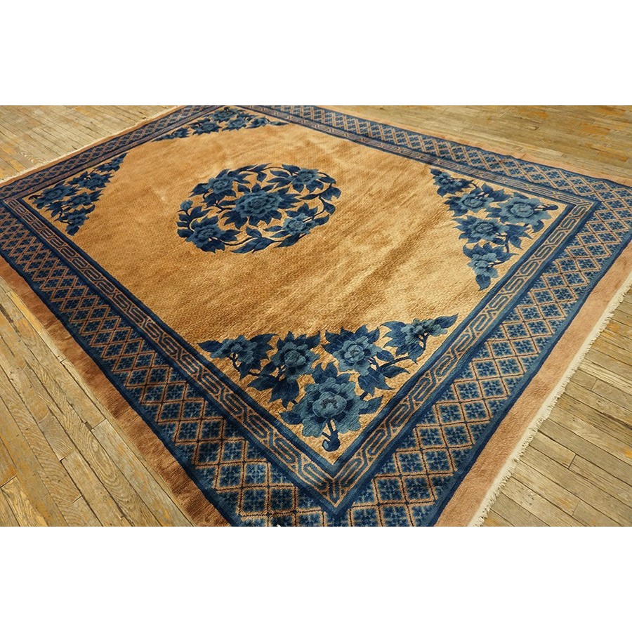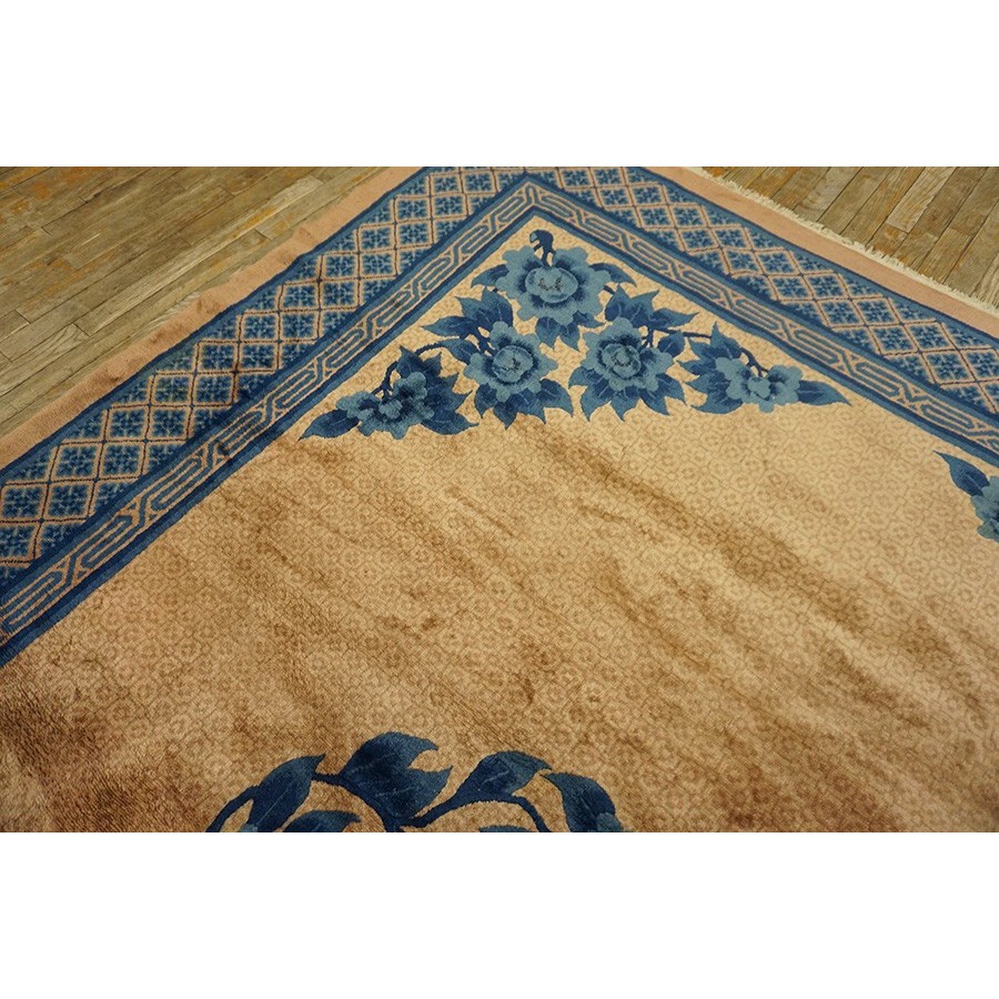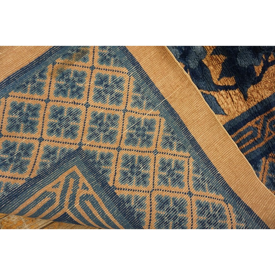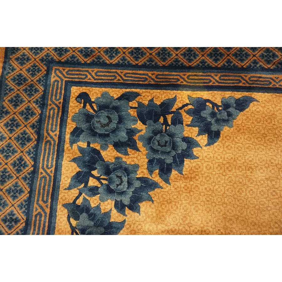 DescriptionChineseCarpets made in China proper. See entries Ningshia, Peking, Art Deco. Chinese - PekingThe commercial Peking carpet is a later 19th century development, begun by importing weaves from Ningshia (see entry) to create and export industry aimed at Western markets. The foundation is cotton and the pile is a good quality carpet wool which takes dyes particularly well. The neat medium weave is in Persian (asymmetric) knots. Designs are strictly Chinese and the whole motif repertoire of Chinese art is employed. Blue and white is the most popular color combination and red is particularly rare. Sizes tend to 9 x 12 and larger, and few small pieces appear. For a short time in the early 1920s Persian designs were woven to capitalize on the death of new Iranian goods. The industry decimated by the Communist Revolution relocated to the Pearl River area. There is a good supply of antique carpets at reasonable prices. | |