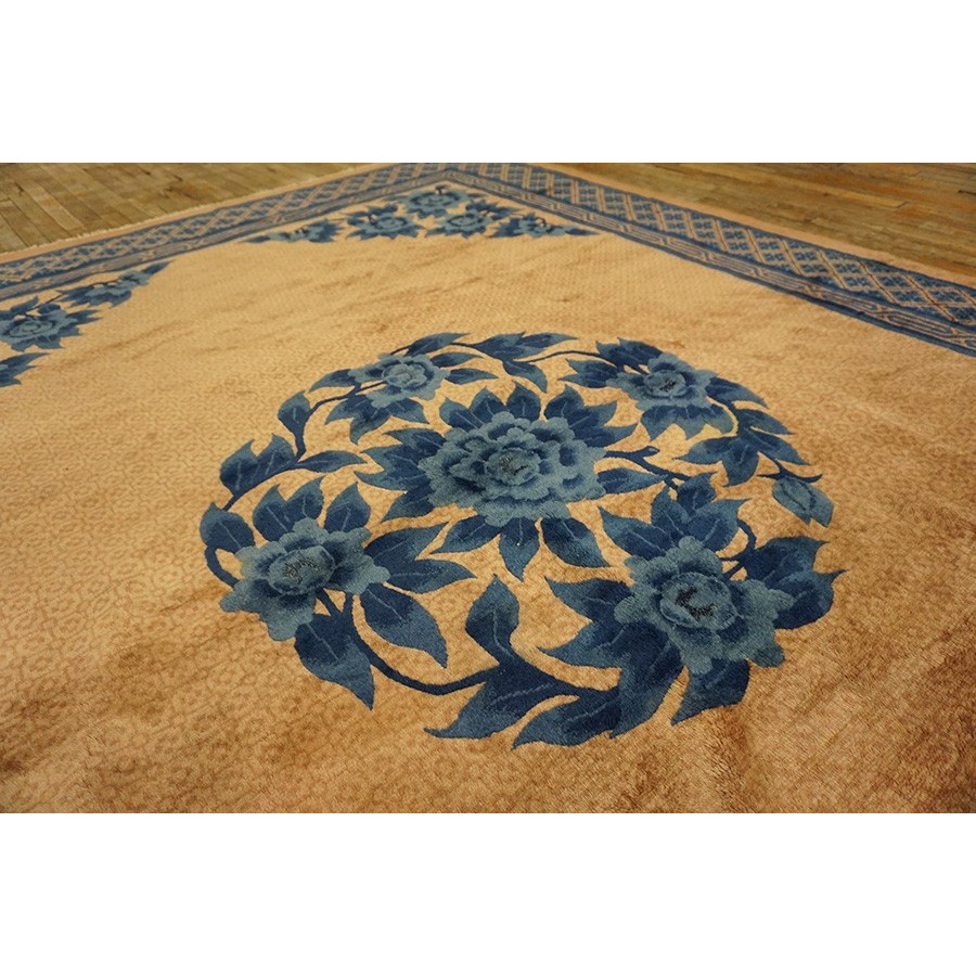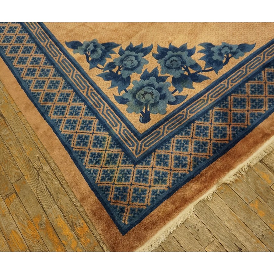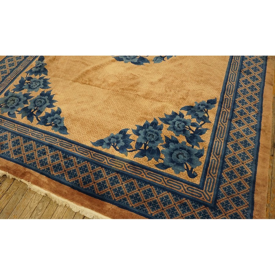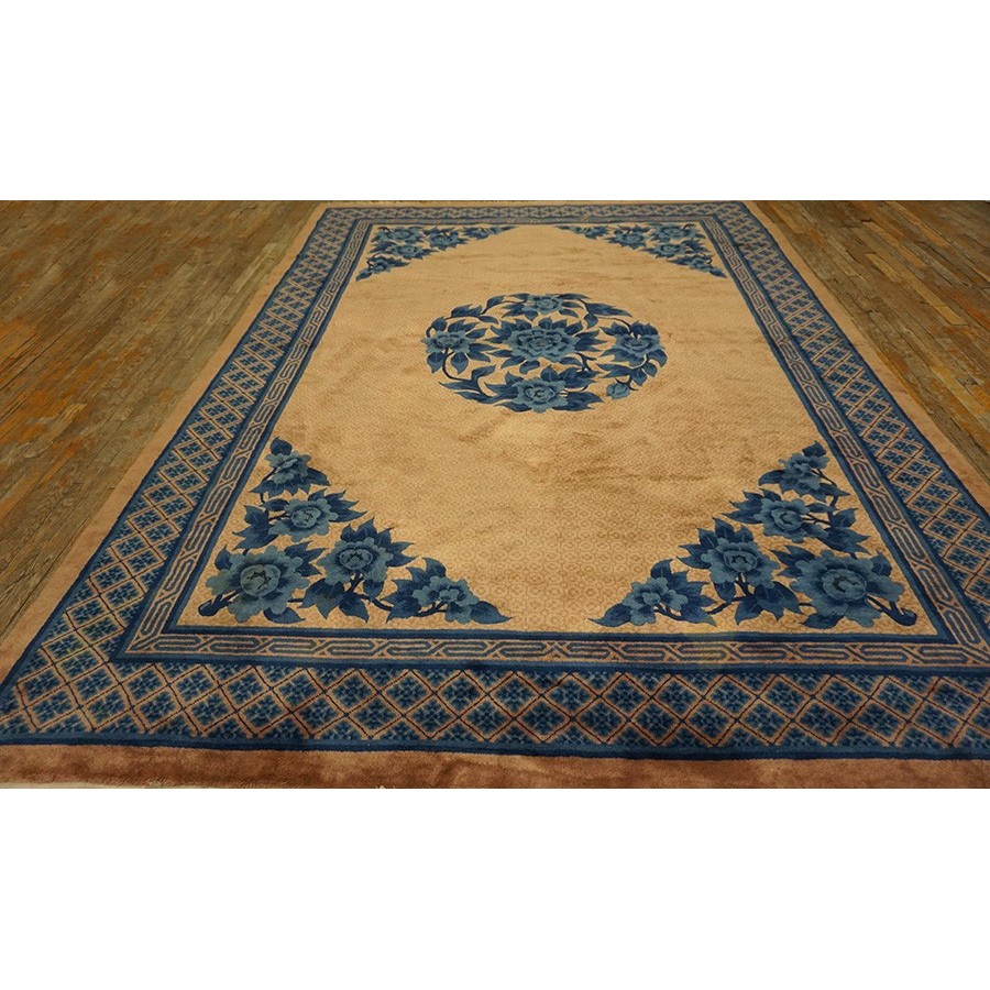 DescriptionChineseCarpets made in China proper. See entries Ningshia, Peking, Art Deco. Chinese - PekingThe commercial Peking carpet is a later 19th century development, begun by importing weaves from Ningshia (see entry) to create and export industry aimed at Western markets. The foundation is cotton and the pile is a good quality carpet wool which takes dyes particularly well. The neat medium weave is in Persian (asymmetric) knots. Designs are strictly Chinese and the whole motif repertoire of Chinese art is employed. Blue and white is the most popular color combination and red is particularly rare. Sizes tend to 9 x 12 and larger, and few small pieces appear. For a short time in the early 1920s Persian designs were woven to capitalize on the death of new Iranian goods. The industry decimated by the Communist Revolution relocated to the Pearl River area. There is a good supply of antique carpets at reasonable prices. | |