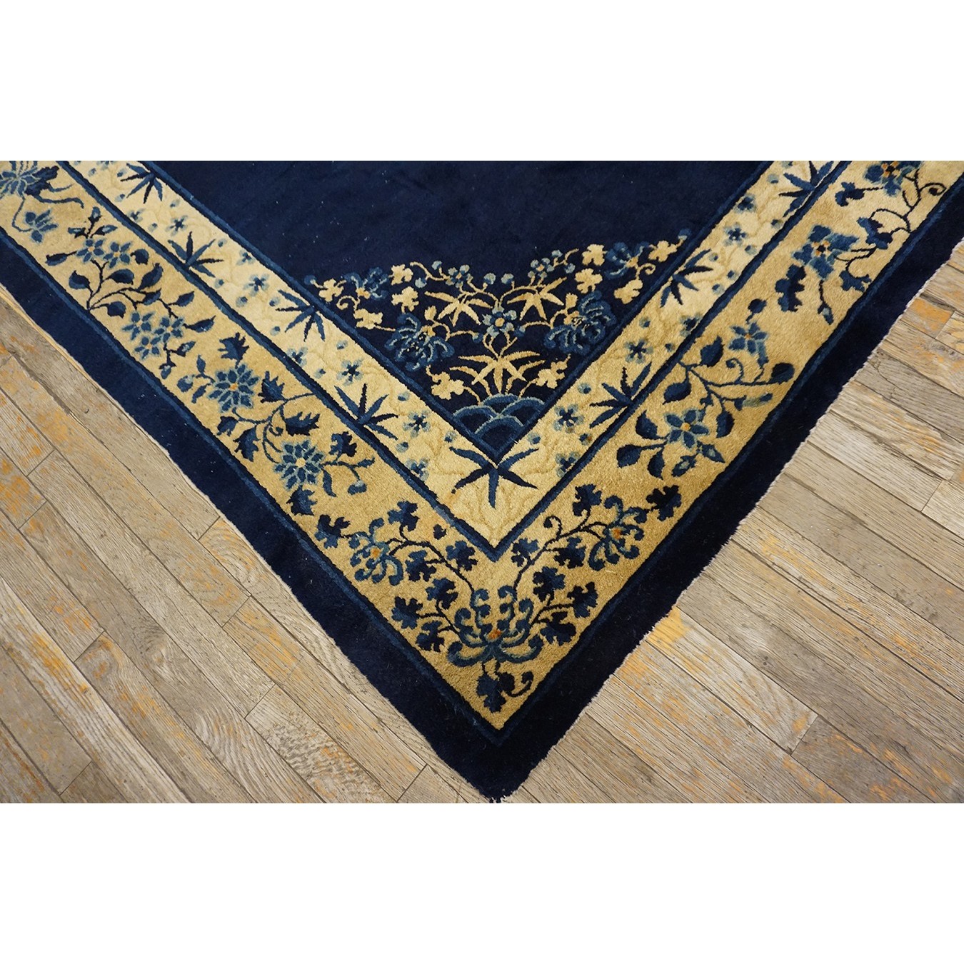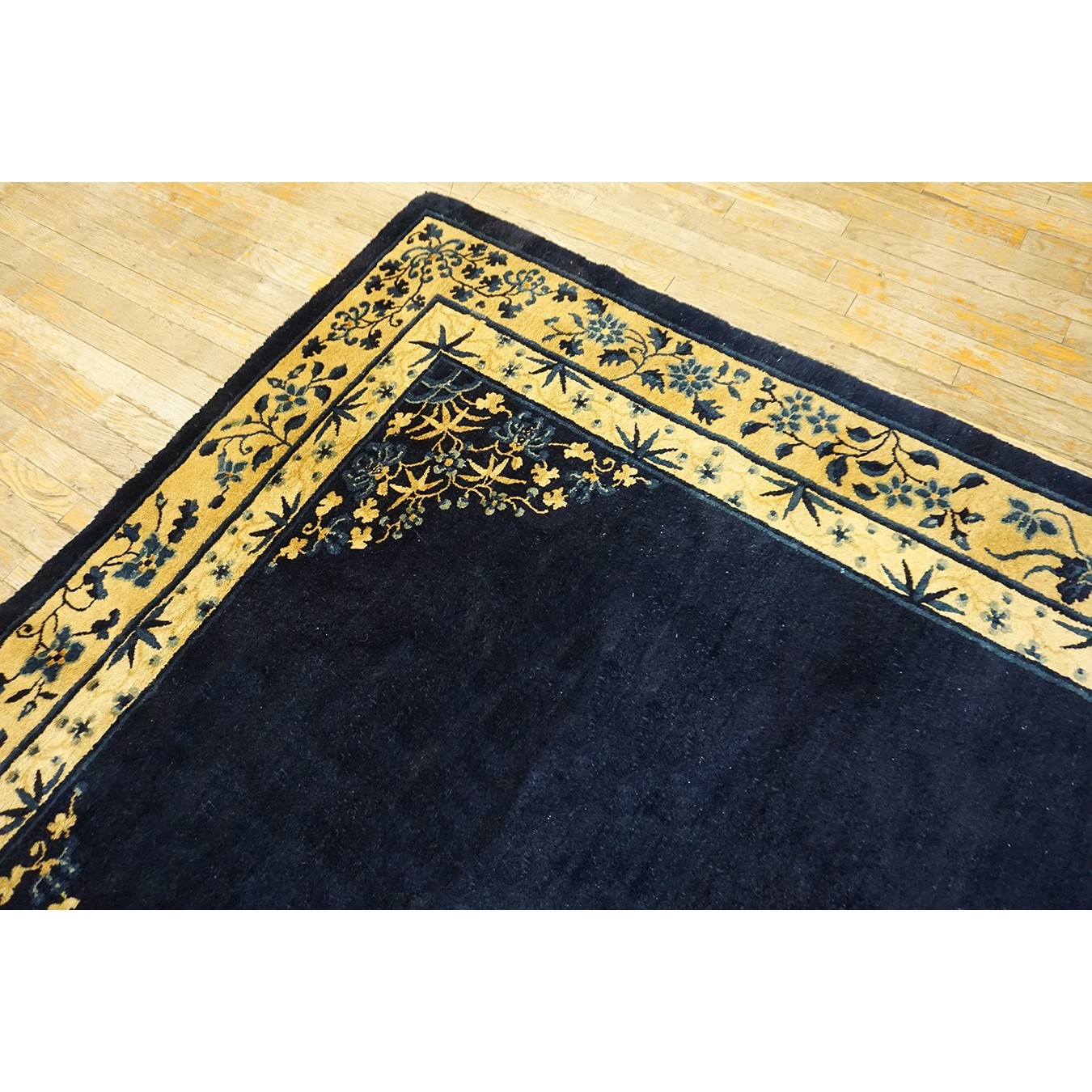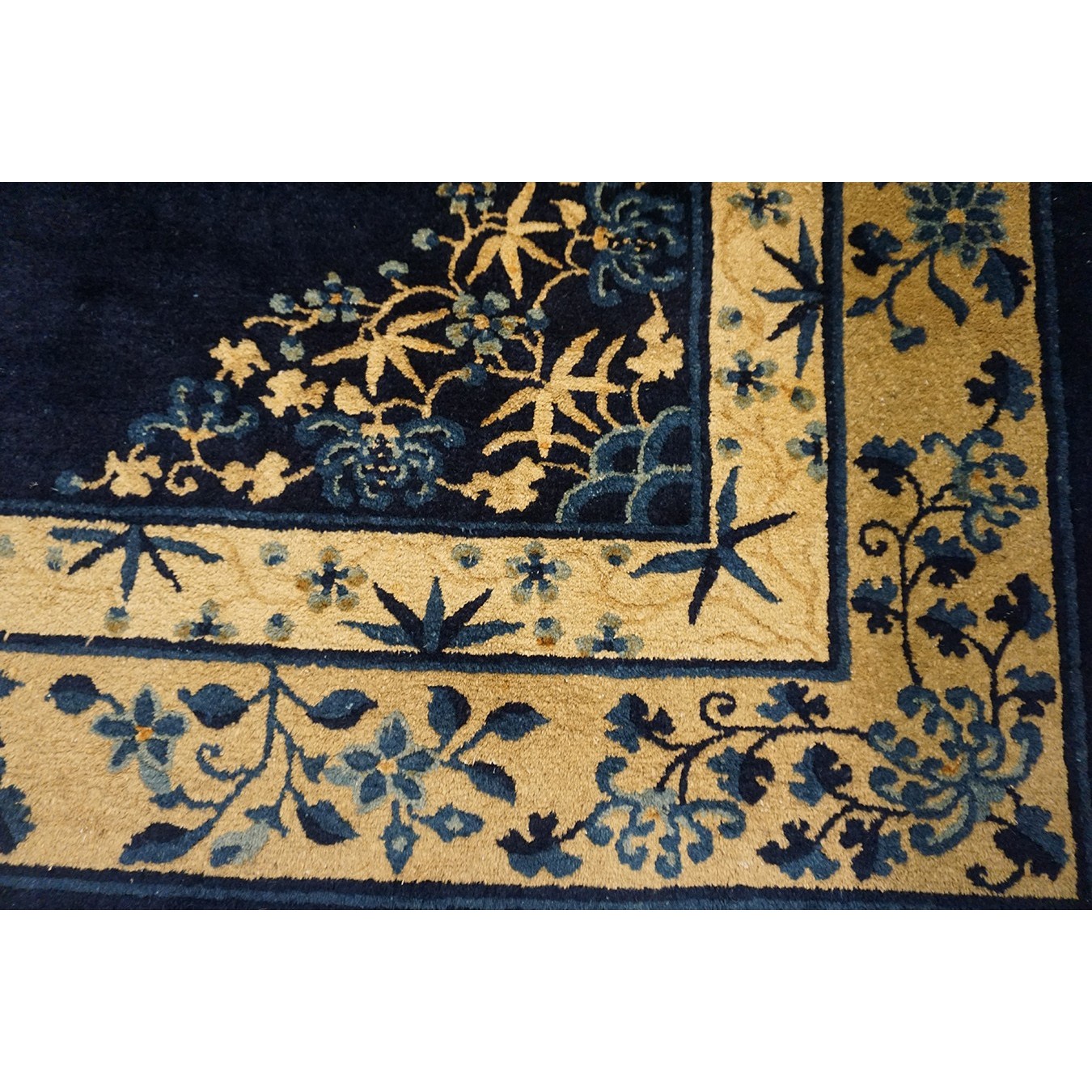 DescriptionChineseCarpets made in China proper. See entries Ningshia, Peking, Art Deco. Chinese - PekingThe commercial Peking carpet is a later 19th century development, begun by importing weaves from Ningshia (see entry) to create and export industry aimed at Western markets. The foundation is cotton and the pile is a good quality carpet wool which takes dyes particularly well. The neat medium weave is in Persian (asymmetric) knots. Designs are strictly Chinese and the whole motif repertoire of Chinese art is employed. Blue and white is the most popular color combination and red is particularly rare. Sizes tend to 9 x 12 and larger, and few small pieces appear. For a short time in the early 1920s Persian designs were woven to capitalize on the death of new Iranian goods. The industry decimated by the Communist Revolution relocated to the Pearl River area. There is a good supply of antique carpets at reasonable prices. | |