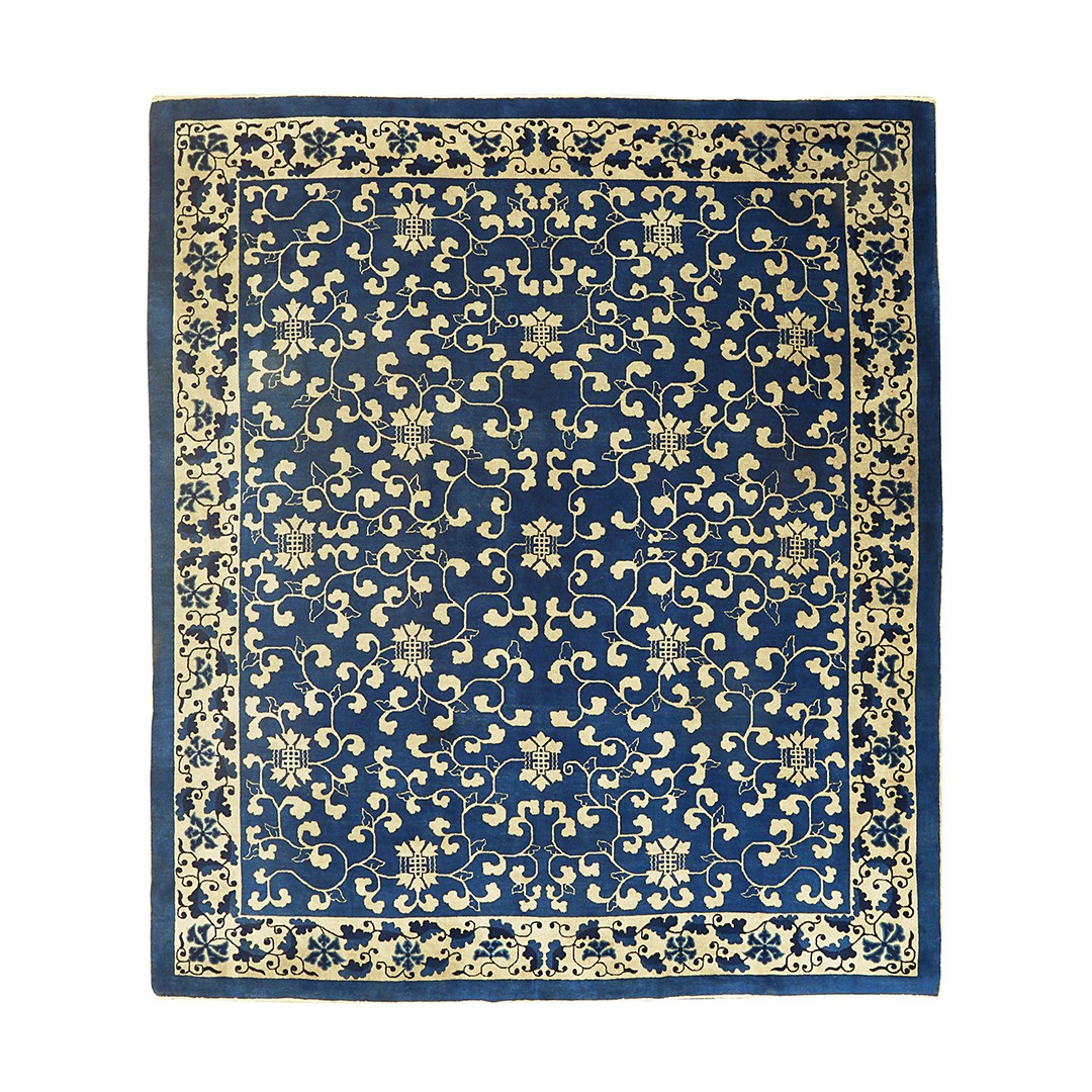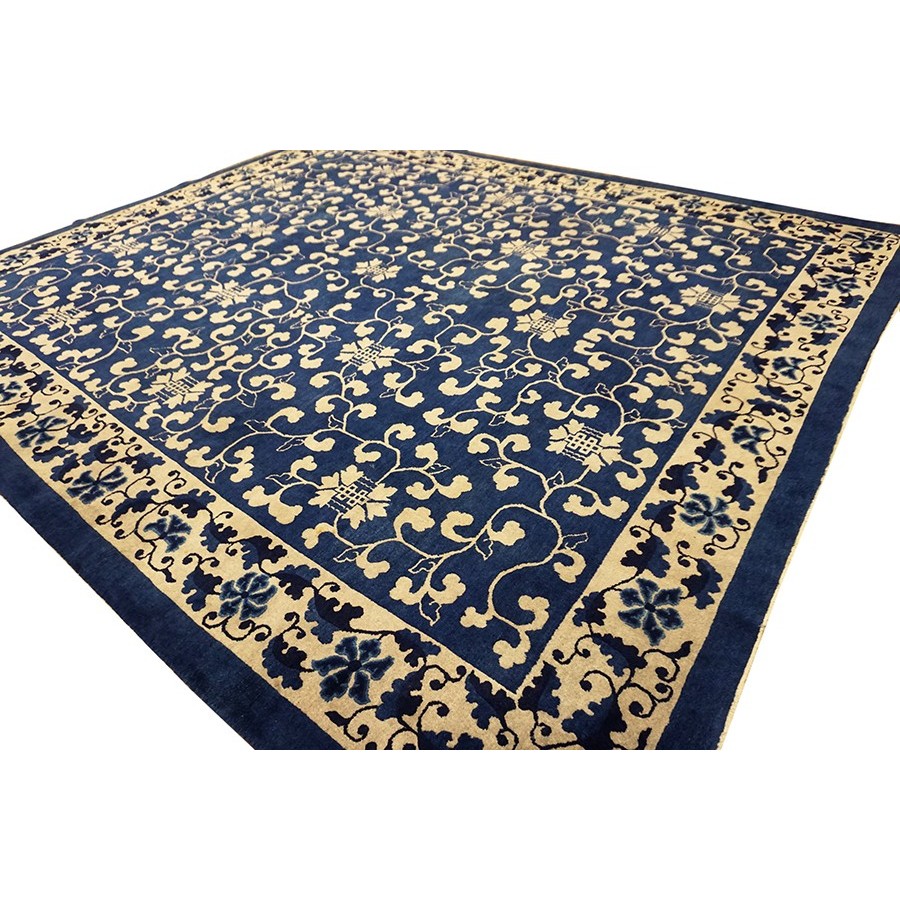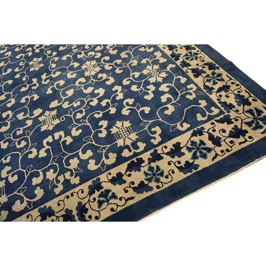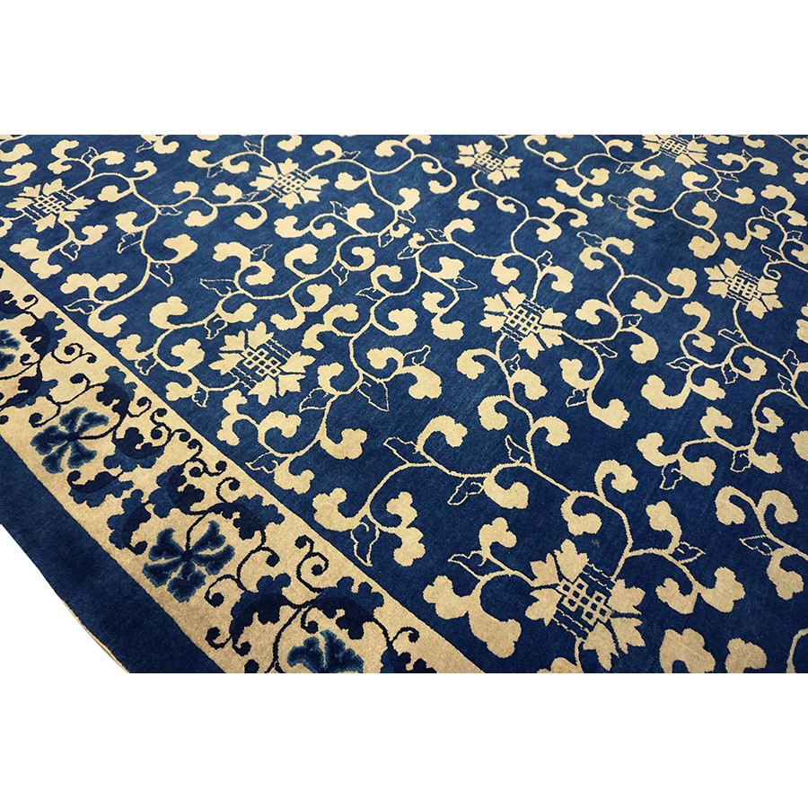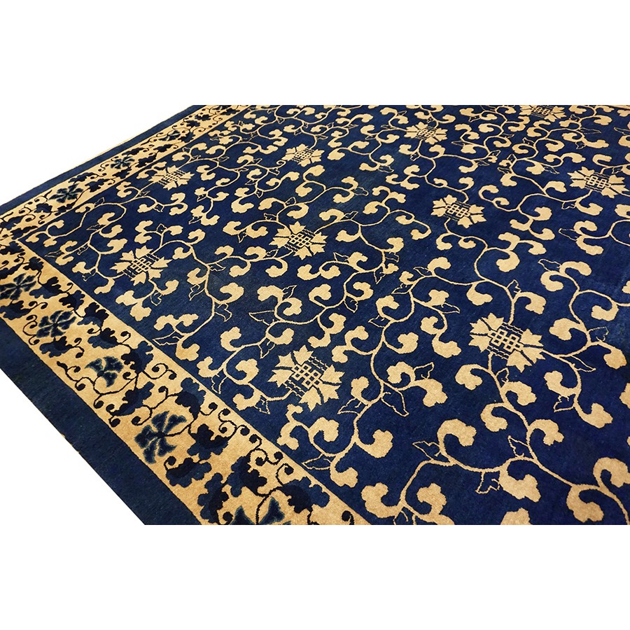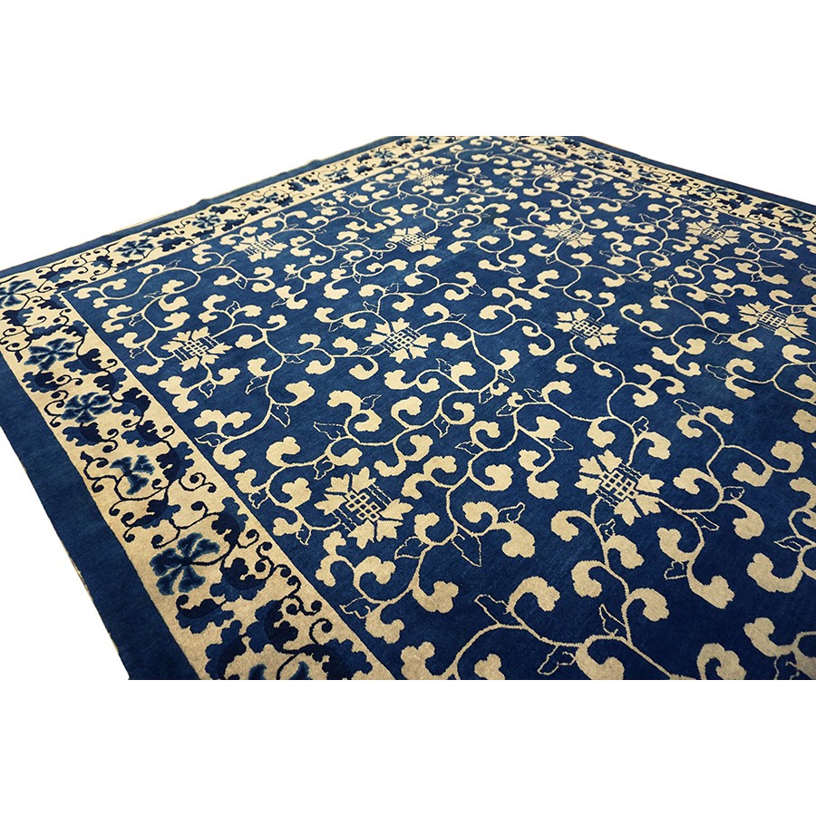 DescriptionChineseCarpets made in China proper. See entries Ningshia, Peking, Art Deco. Chinese - PekingThe commercial Peking carpet is a later 19th century development, begun by importing weaves from Ningshia (see entry) to create and export industry aimed at Western markets. The foundation is cotton and the pile is a good quality carpet wool which takes dyes particularly well. The neat medium weave is in Persian (asymmetric) knots. Designs are strictly Chinese and the whole motif repertoire of Chinese art is employed. Blue and white is the most popular color combination and red is particularly rare. Sizes tend to 9 x 12 and larger, and few small pieces appear. For a short time in the early 1920s Persian designs were woven to capitalize on the death of new Iranian goods. The industry decimated by the Communist Revolution relocated to the Pearl River area. There is a good supply of antique carpets at reasonable prices. | |