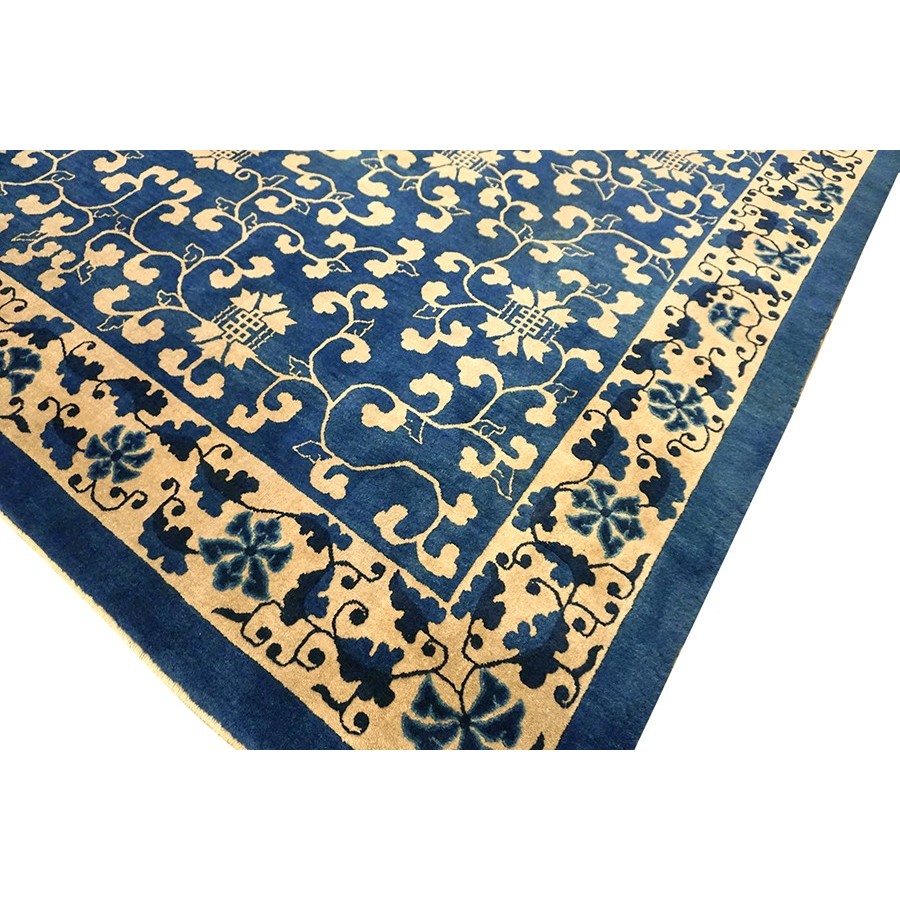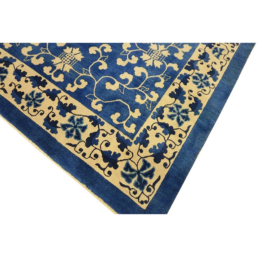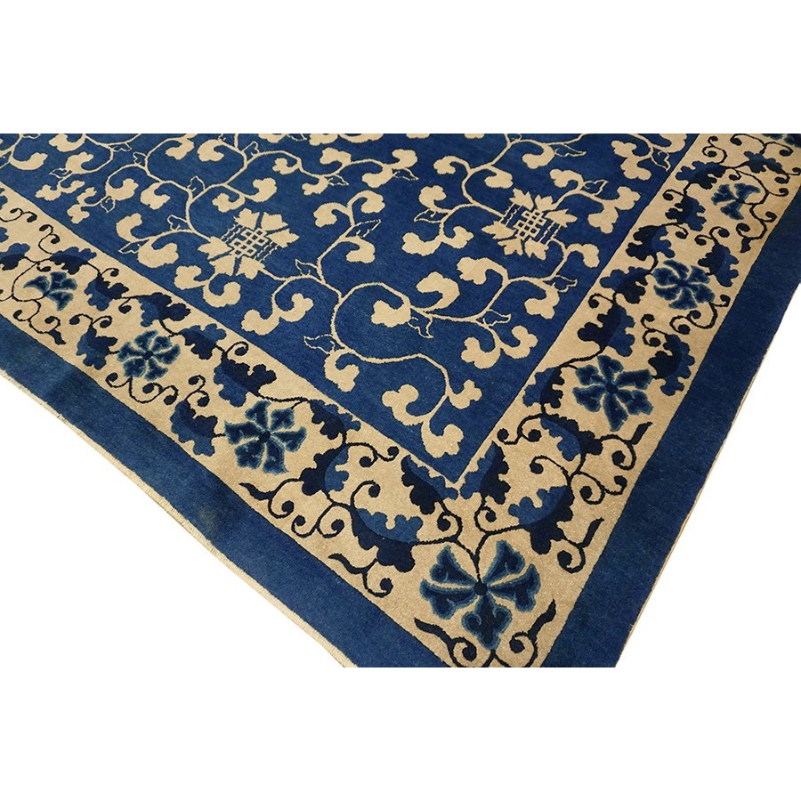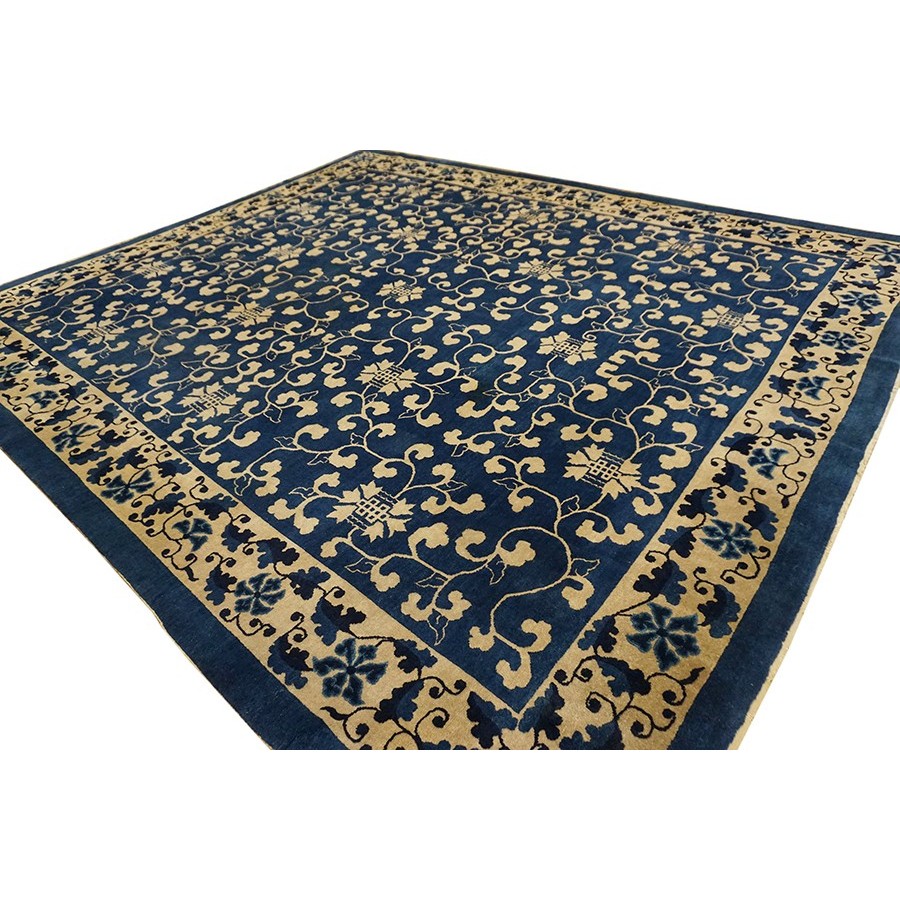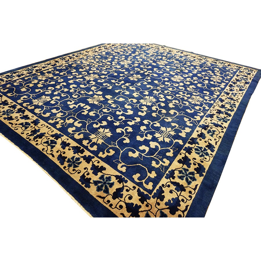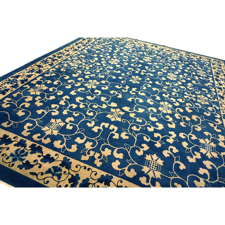 DescriptionChineseCarpets made in China proper. See entries Ningshia, Peking, Art Deco. Chinese - PekingThe commercial Peking carpet is a later 19th century development, begun by importing weaves from Ningshia (see entry) to create and export industry aimed at Western markets. The foundation is cotton and the pile is a good quality carpet wool which takes dyes particularly well. The neat medium weave is in Persian (asymmetric) knots. Designs are strictly Chinese and the whole motif repertoire of Chinese art is employed. Blue and white is the most popular color combination and red is particularly rare. Sizes tend to 9 x 12 and larger, and few small pieces appear. For a short time in the early 1920s Persian designs were woven to capitalize on the death of new Iranian goods. The industry decimated by the Communist Revolution relocated to the Pearl River area. There is a good supply of antique carpets at reasonable prices. | |