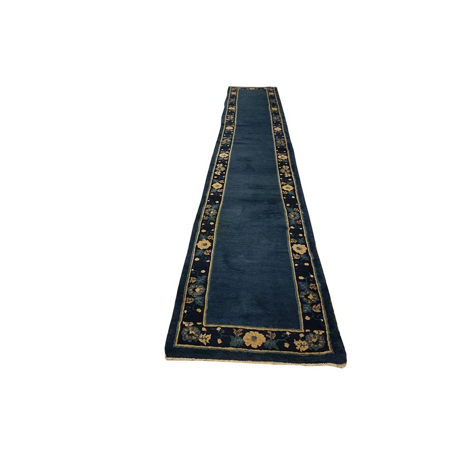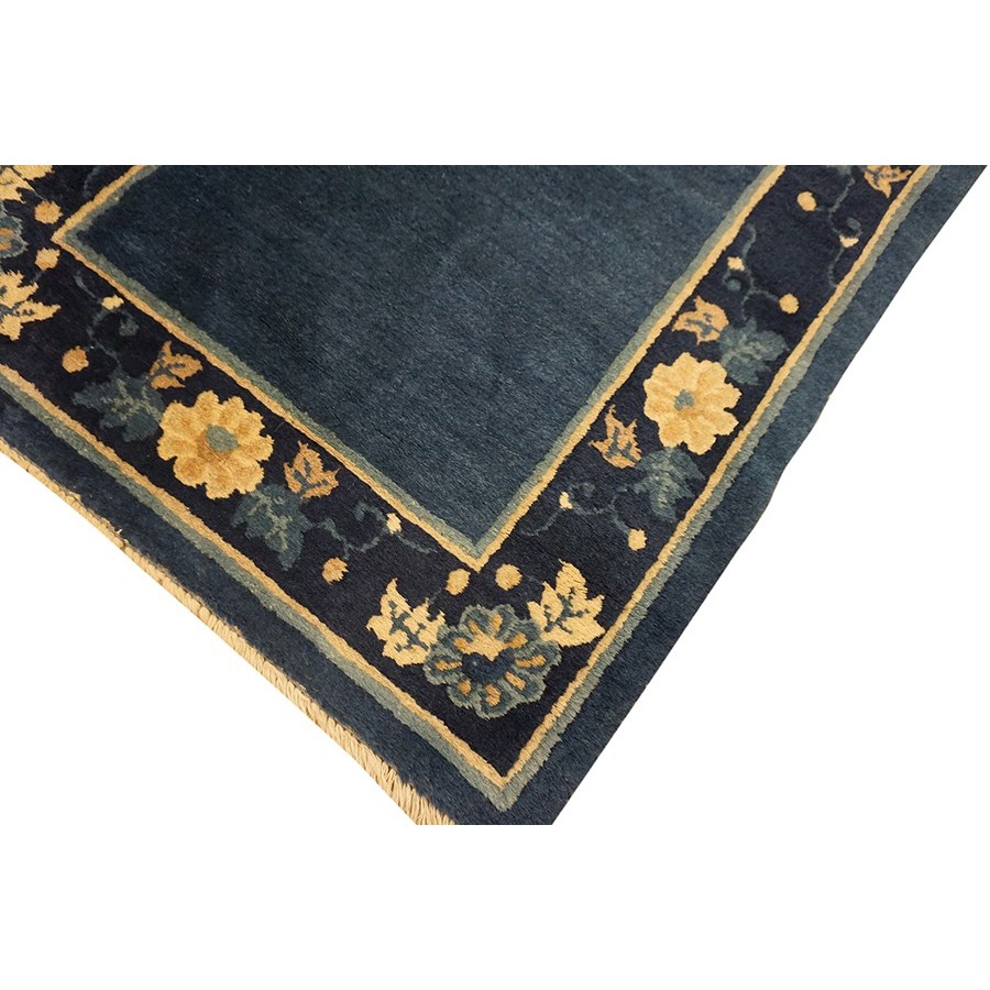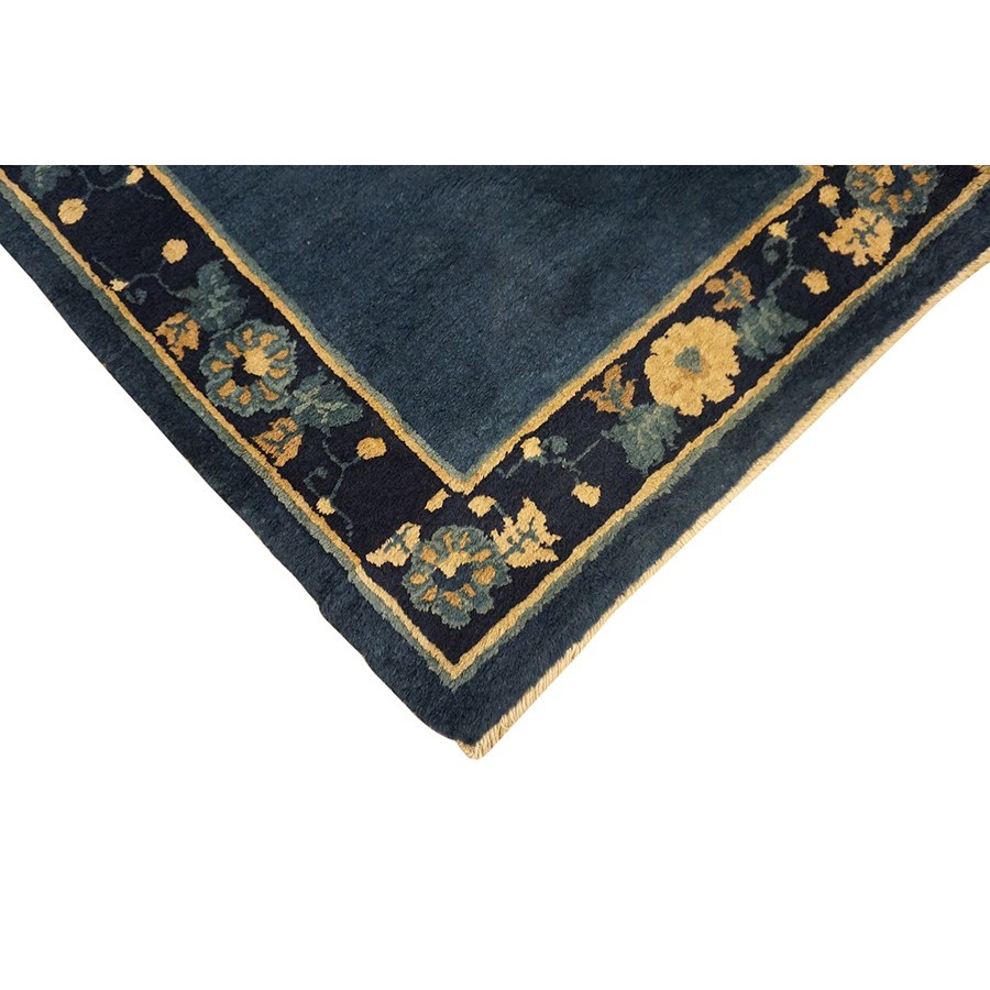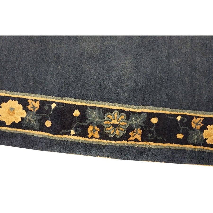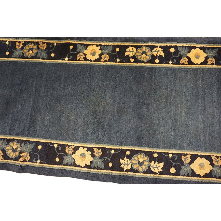DescriptionChineseCarpets made in China proper. See entries Ningshia, Peking, Art Deco. Chinese - PekingThe commercial Peking carpet is a later 19th century development, begun by importing weaves from Ningshia (see entry) to create and export industry aimed at Western markets. The foundation is cotton and the pile is a good quality carpet wool which takes dyes particularly well. The neat medium weave is in Persian (asymmetric) knots. Designs are strictly Chinese and the whole motif repertoire of Chinese art is employed. Blue and white is the most popular color combination and red is particularly rare. Sizes tend to 9 x 12 and larger, and few small pieces appear. For a short time in the early 1920s Persian designs were woven to capitalize on the death of new Iranian goods. The industry decimated by the Communist Revolution relocated to the Pearl River area. There is a good supply of antique carpets at reasonable prices. | |