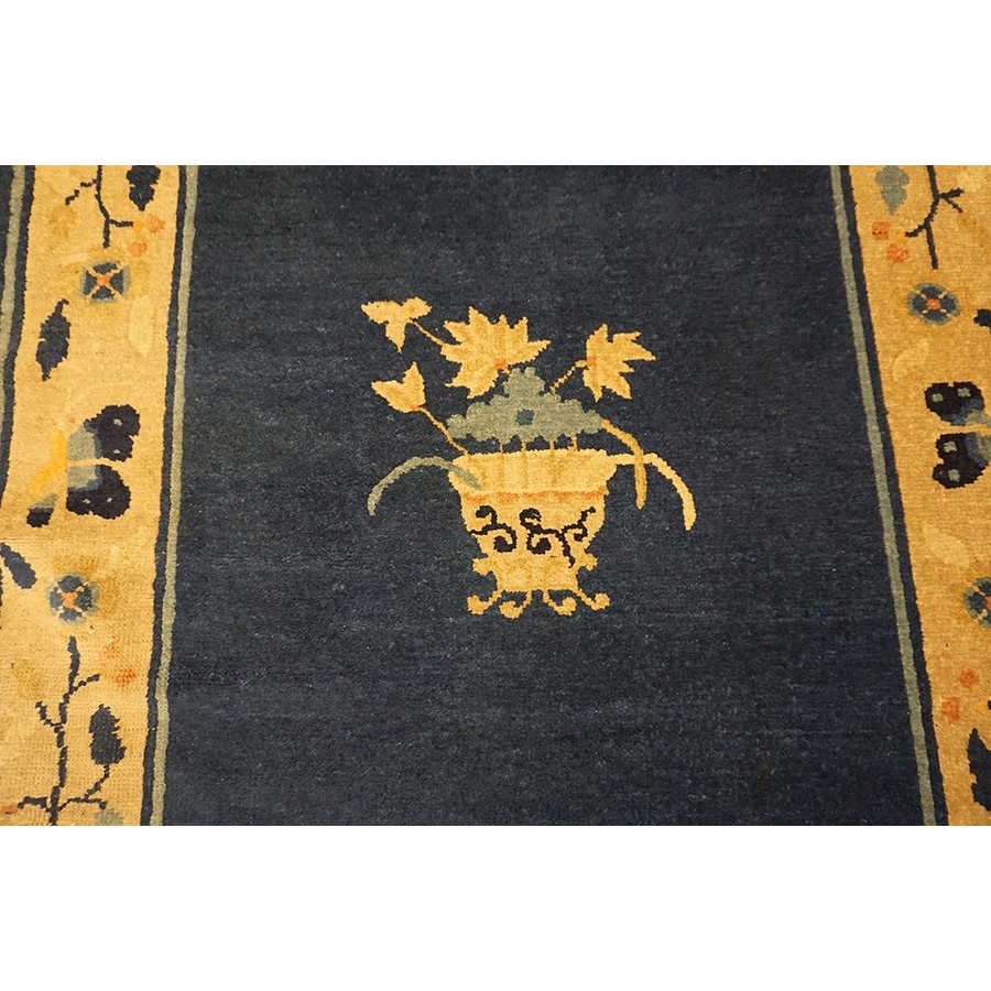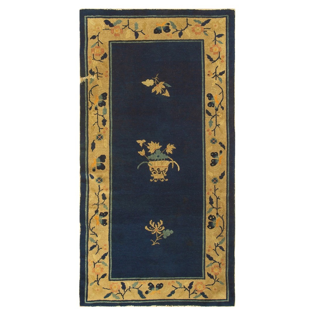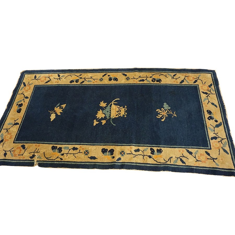 DescriptionChineseCarpets made in China proper. See entries Ningshia, Peking, Art Deco. Chinese - PekingThe commercial Peking carpet is a later 19th century development, begun by importing weaves from Ningshia (see entry) to create and export industry aimed at Western markets. The foundation is cotton and the pile is a good quality carpet wool which takes dyes particularly well. The neat medium weave is in Persian (asymmetric) knots. Designs are strictly Chinese and the whole motif repertoire of Chinese art is employed. Blue and white is the most popular color combination and red is particularly rare. Sizes tend to 9 x 12 and larger, and few small pieces appear. For a short time in the early 1920s Persian designs were woven to capitalize on the death of new Iranian goods. The industry decimated by the Communist Revolution relocated to the Pearl River area. There is a good supply of antique carpets at reasonable prices. | |