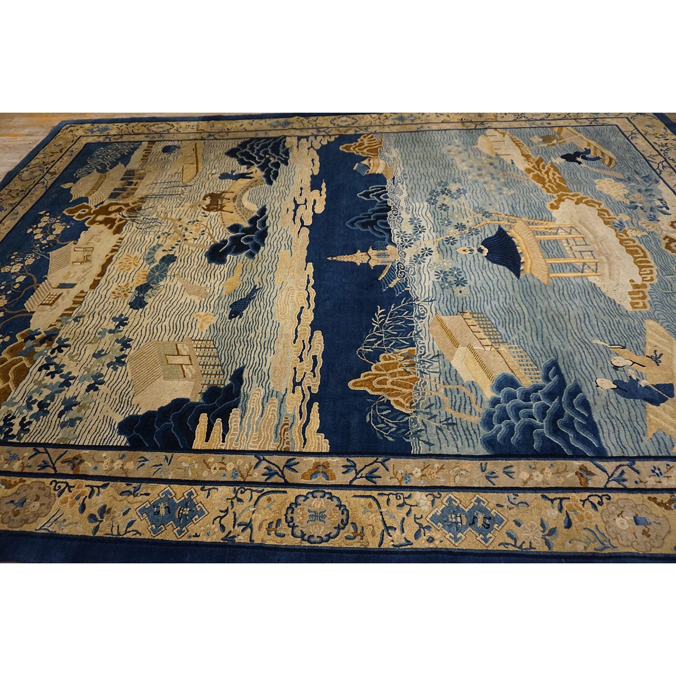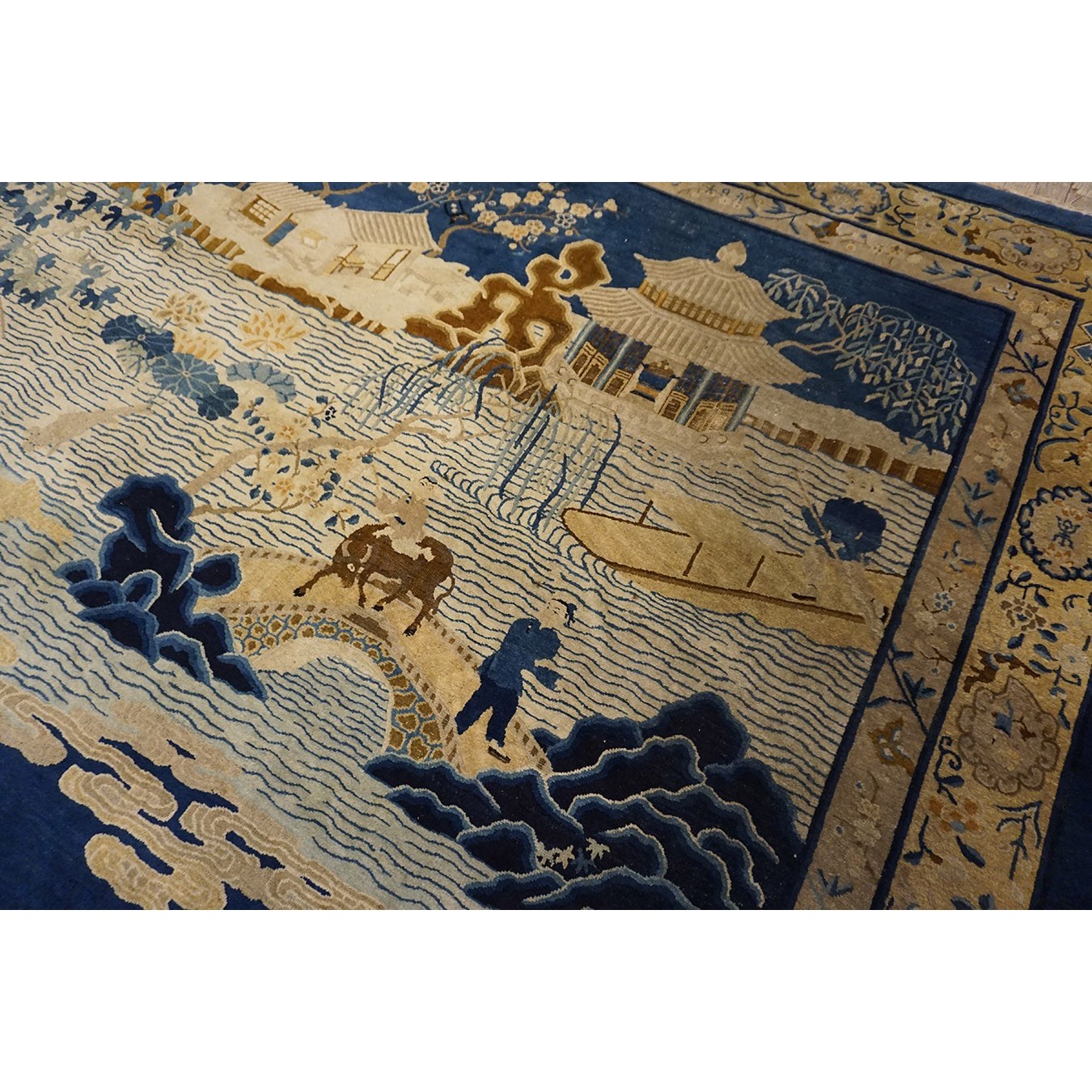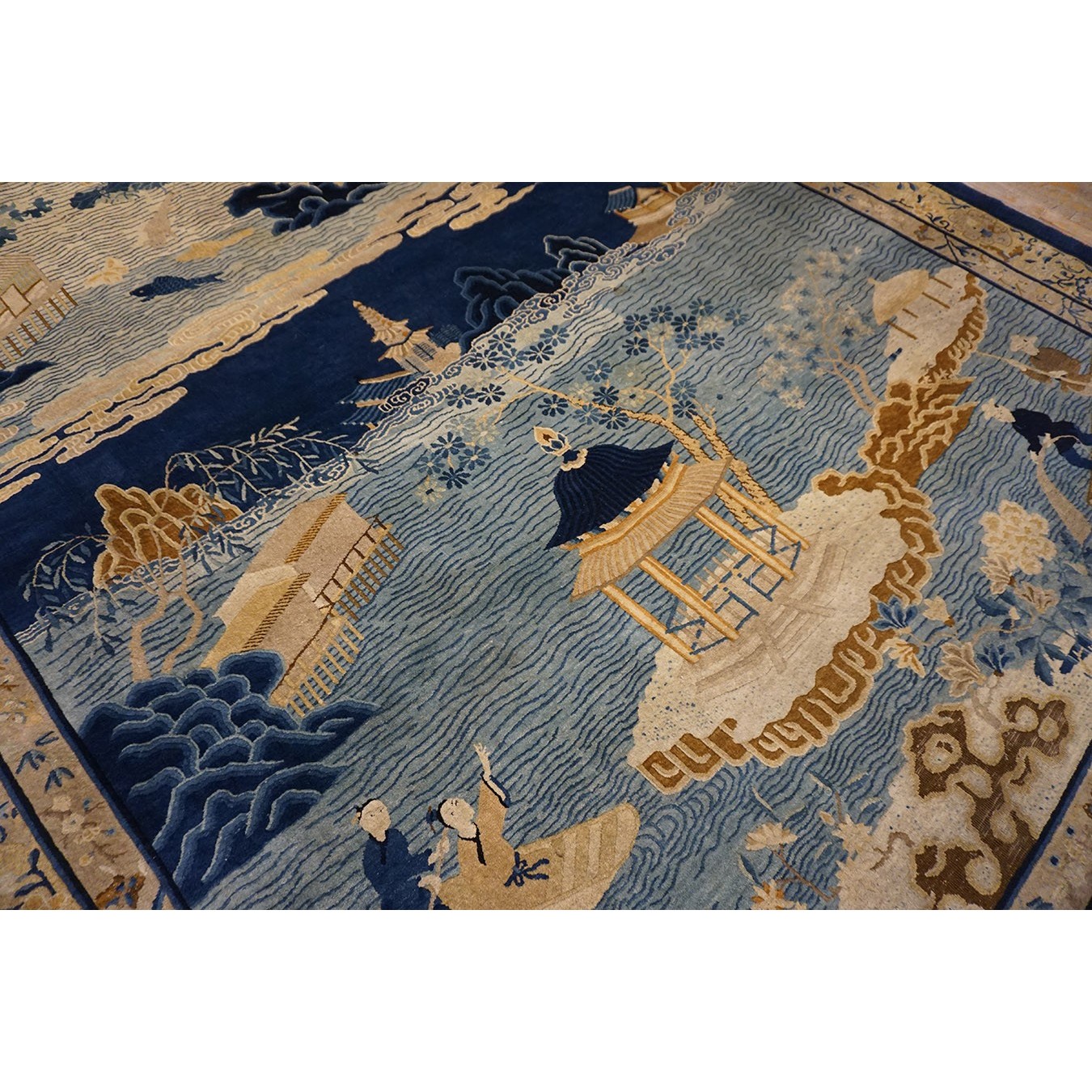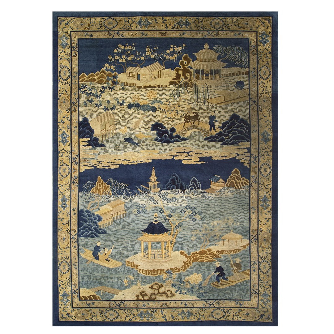 DescriptionChineseCarpets made in China proper. See entries Ningshia, Peking, Art Deco. Chinese - PekingThe commercial Peking carpet is a later 19th century development, begun by importing weaves from Ningshia (see entry) to create and export industry aimed at Western markets. The foundation is cotton and the pile is a good quality carpet wool which takes dyes particularly well. The neat medium weave is in Persian (asymmetric) knots. Designs are strictly Chinese and the whole motif repertoire of Chinese art is employed. Blue and white is the most popular color combination and red is particularly rare. Sizes tend to 9 x 12 and larger, and few small pieces appear. For a short time in the early 1920s Persian designs were woven to capitalize on the death of new Iranian goods. The industry decimated by the Communist Revolution relocated to the Pearl River area. There is a good supply of antique carpets at reasonable prices. | |