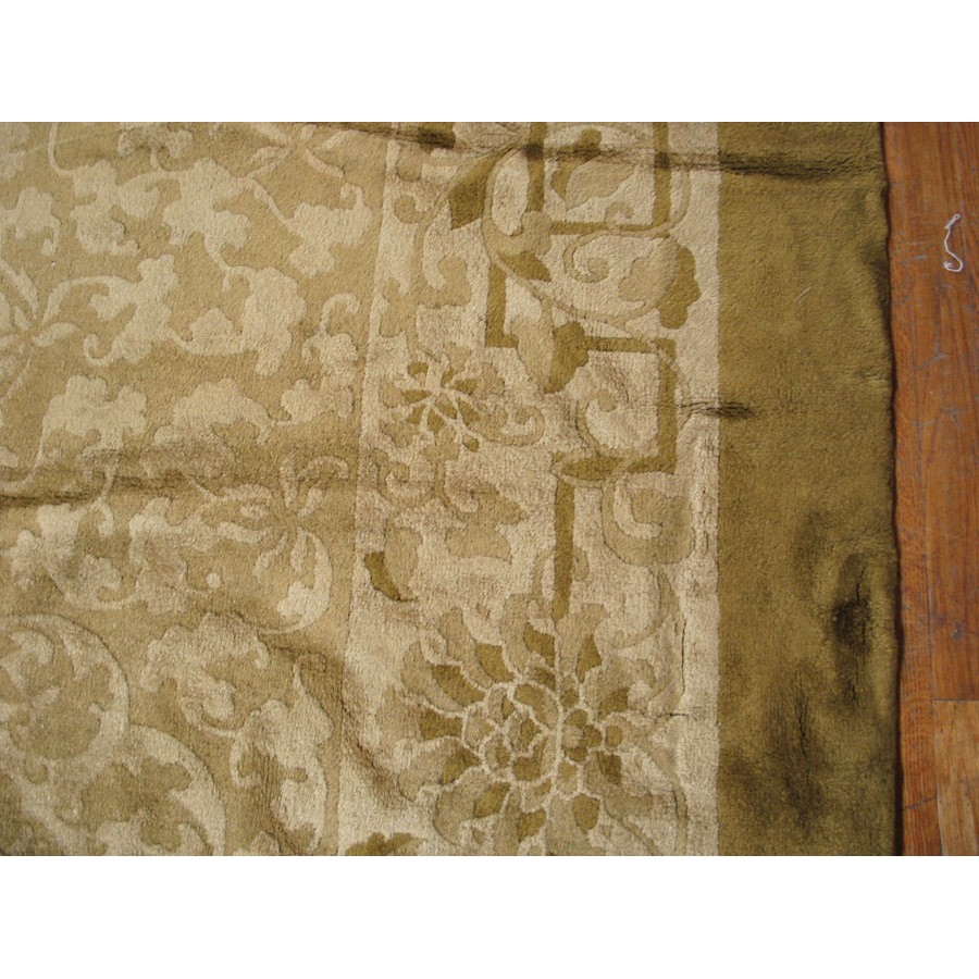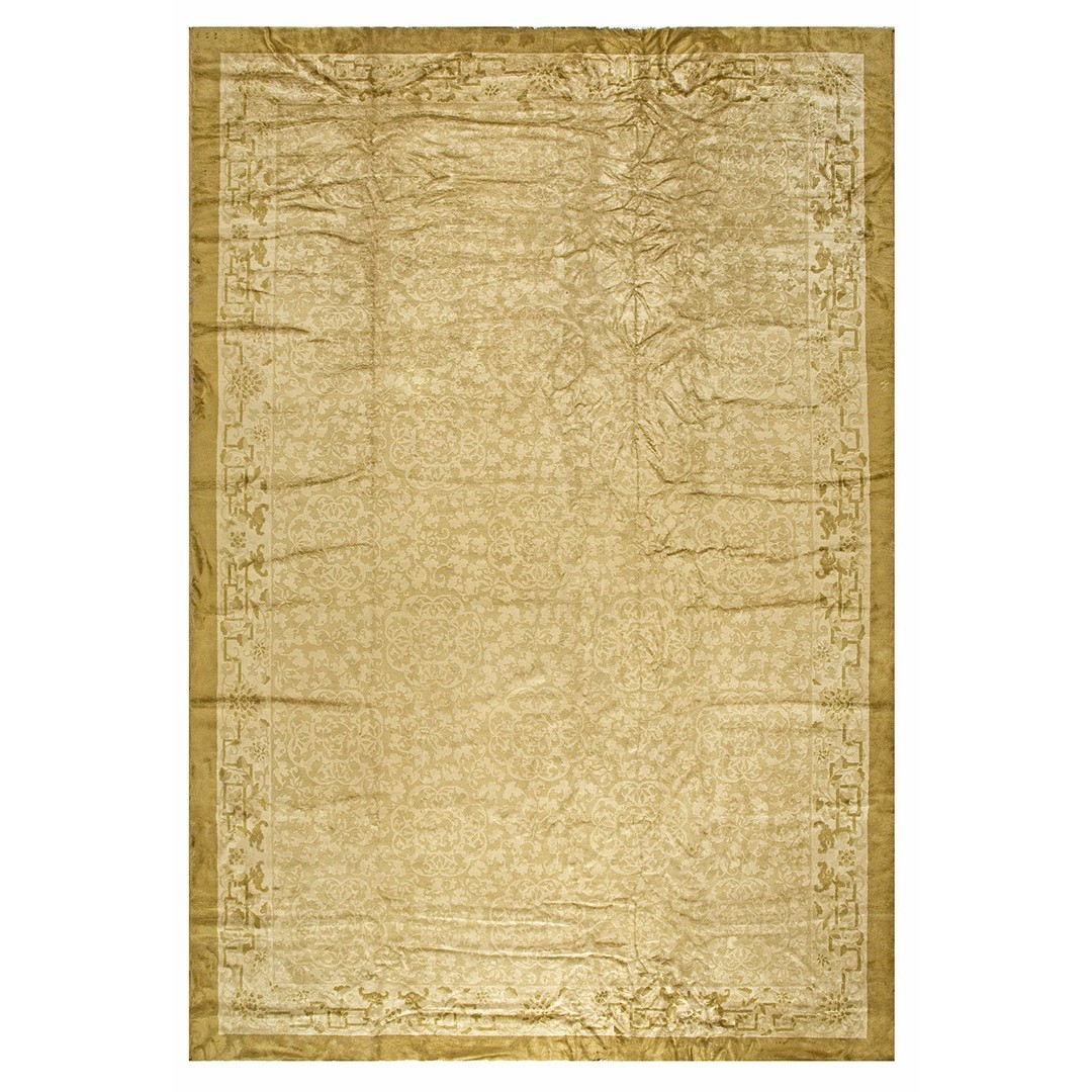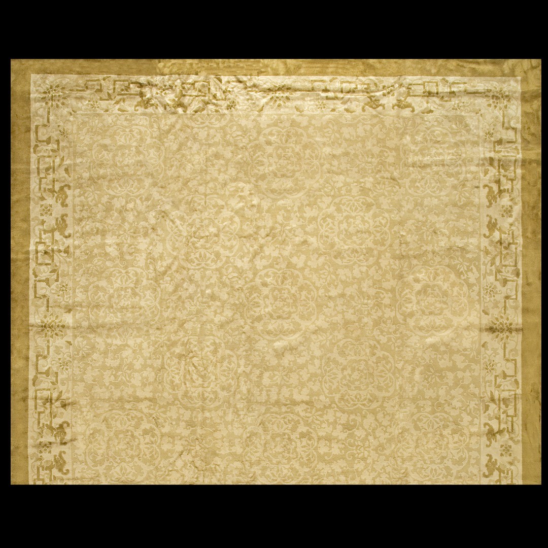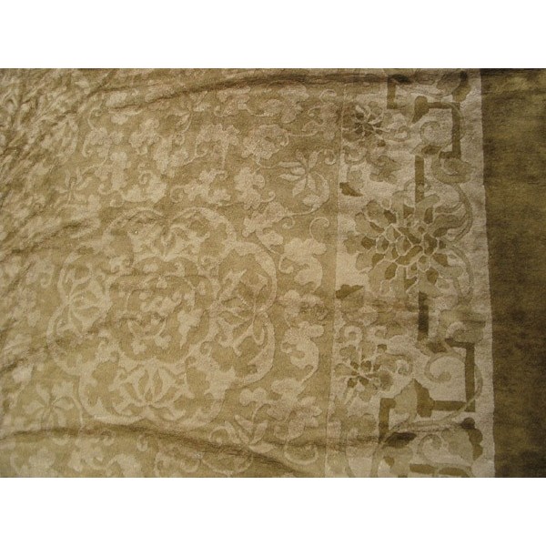 DescriptionChineseCarpets made in China proper. See entries Ningshia, Peking, Art Deco. Chinese - PekingThe commercial Peking carpet is a later 19th century development, begun by importing weaves from Ningshia (see entry) to create and export industry aimed at Western markets. The foundation is cotton and the pile is a good quality carpet wool which takes dyes particularly well. The neat medium weave is in Persian (asymmetric) knots. Designs are strictly Chinese and the whole motif repertoire of Chinese art is employed. Blue and white is the most popular color combination and red is particularly rare. Sizes tend to 9 x 12 and larger, and few small pieces appear. For a short time in the early 1920s Persian designs were woven to capitalize on the death of new Iranian goods. The industry decimated by the Communist Revolution relocated to the Pearl River area. There is a good supply of antique carpets at reasonable prices. | |