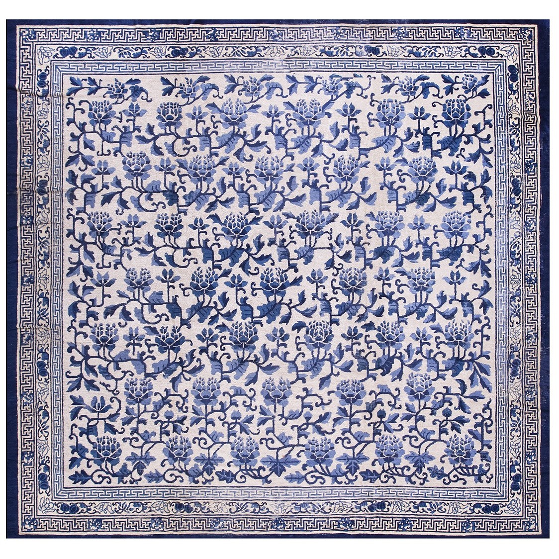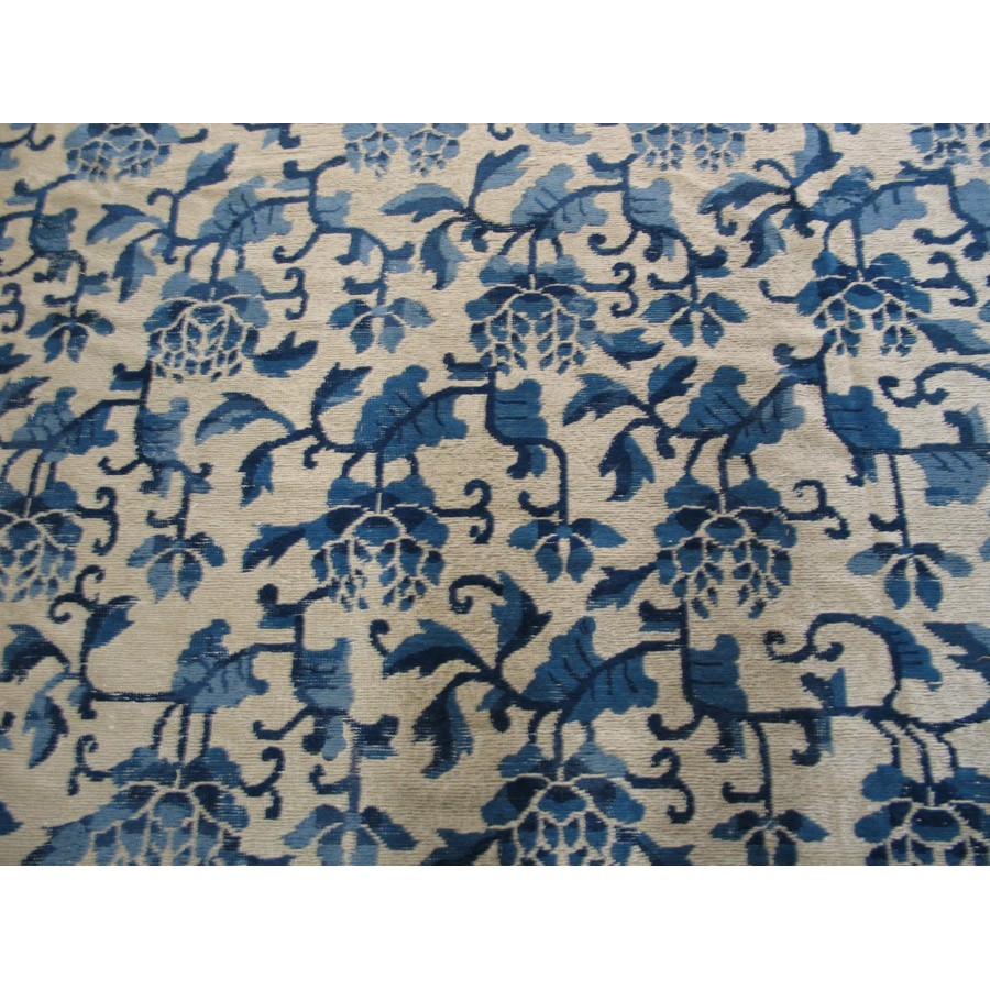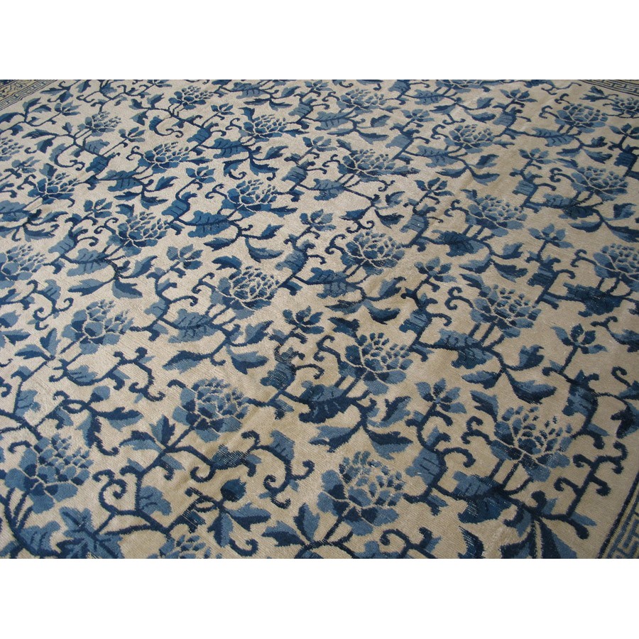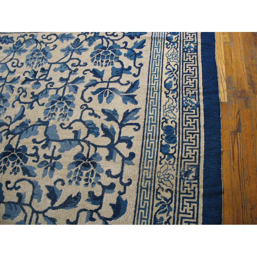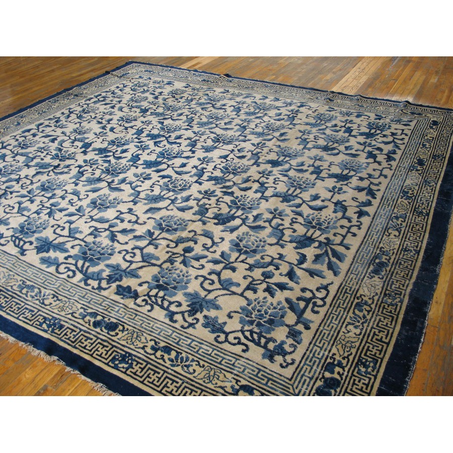 DescriptionChineseCarpets made in China proper. See entries Ningshia, Peking, Art Deco. Chinese - PekingThe commercial Peking carpet is a later 19th century development, begun by importing weaves from Ningshia (see entry) to create and export industry aimed at Western markets. The foundation is cotton and the pile is a good quality carpet wool which takes dyes particularly well. The neat medium weave is in Persian (asymmetric) knots. Designs are strictly Chinese and the whole motif repertoire of Chinese art is employed. Blue and white is the most popular color combination and red is particularly rare. Sizes tend to 9 x 12 and larger, and few small pieces appear. For a short time in the early 1920s Persian designs were woven to capitalize on the death of new Iranian goods. The industry decimated by the Communist Revolution relocated to the Pearl River area. There is a good supply of antique carpets at reasonable prices. | |