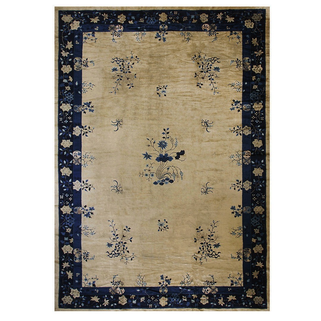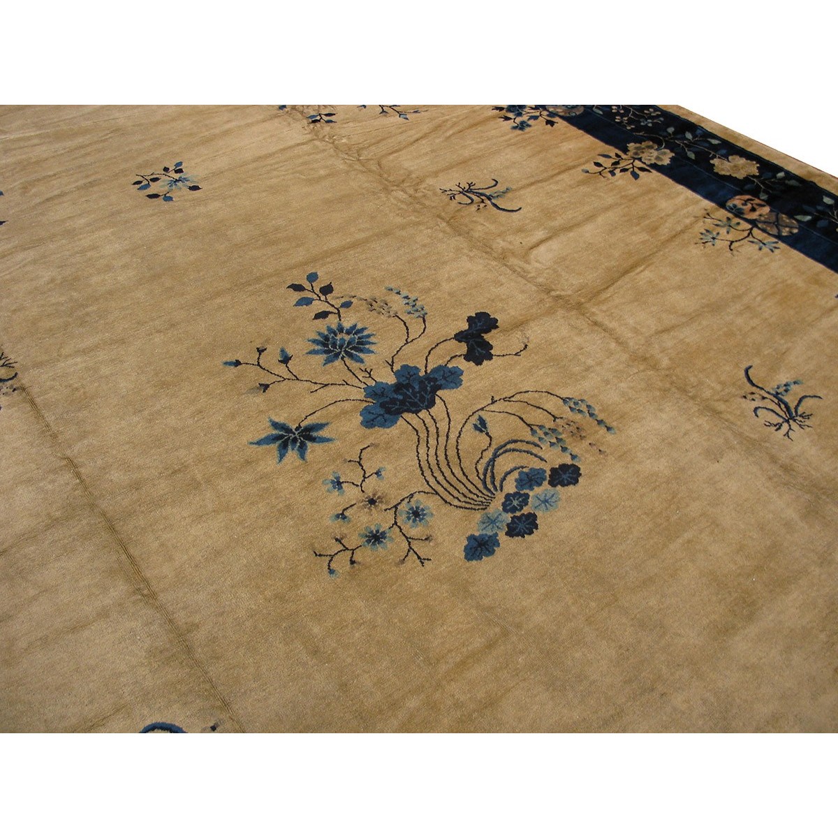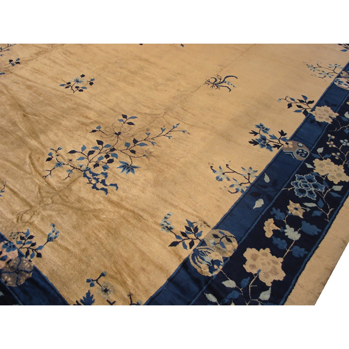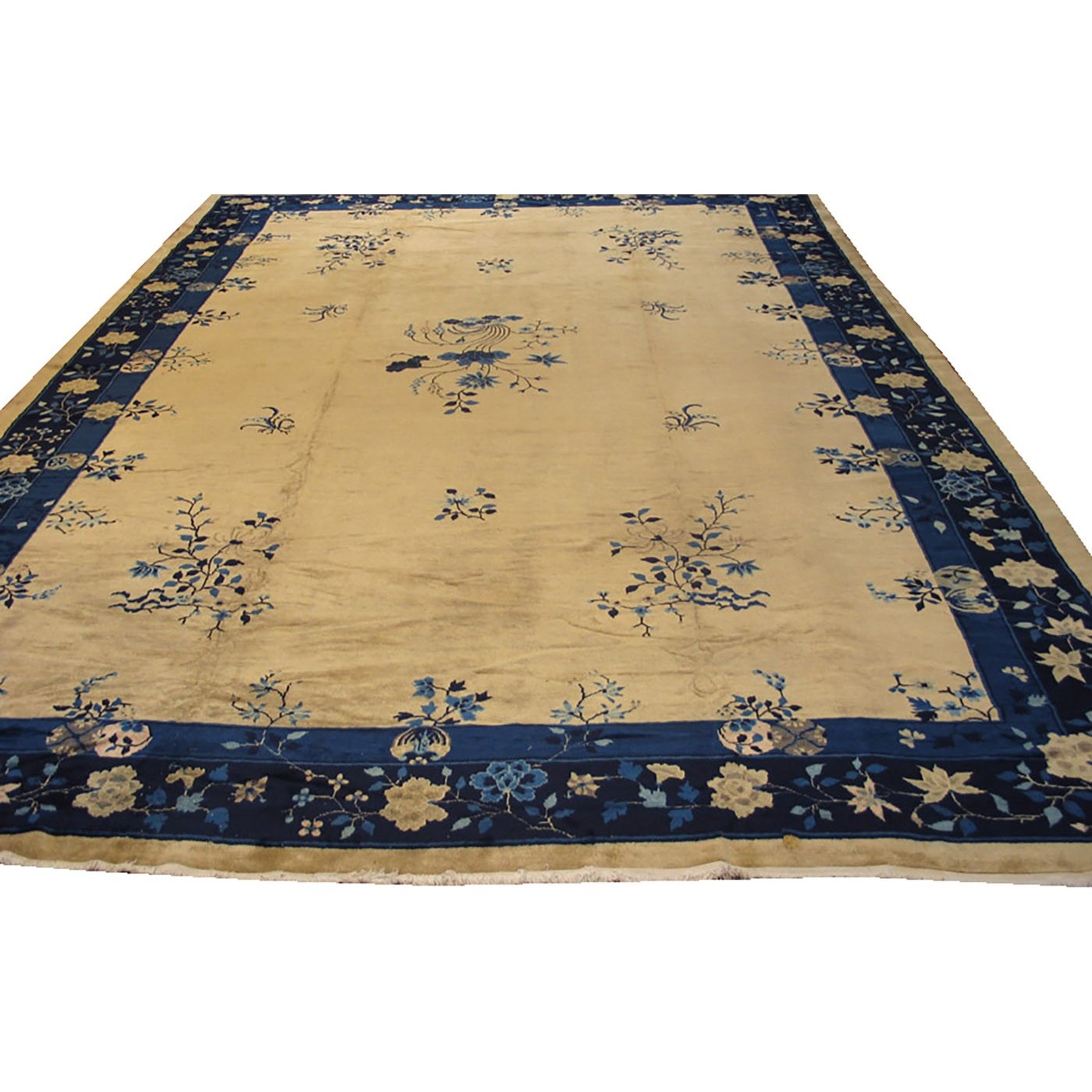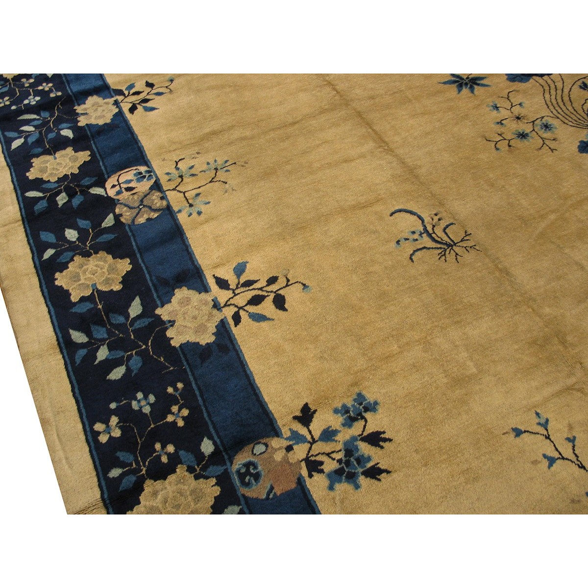 DescriptionChineseCarpets made in China proper. See entries Ningshia, Peking, Art Deco. Chinese - PekingThe commercial Peking carpet is a later 19th century development, begun by importing weaves from Ningshia (see entry) to create and export industry aimed at Western markets. The foundation is cotton and the pile is a good quality carpet wool which takes dyes particularly well. The neat medium weave is in Persian (asymmetric) knots. Designs are strictly Chinese and the whole motif repertoire of Chinese art is employed. Blue and white is the most popular color combination and red is particularly rare. Sizes tend to 9 x 12 and larger, and few small pieces appear. For a short time in the early 1920s Persian designs were woven to capitalize on the death of new Iranian goods. The industry decimated by the Communist Revolution relocated to the Pearl River area. There is a good supply of antique carpets at reasonable prices. | |