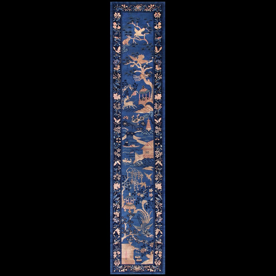 DescriptionChineseCarpets made in China proper. See entries Ningshia, Peking, Art Deco. Chinese - PekingThe commercial Peking carpet is a later 19th century development, begun by importing weaves from Ningshia (see entry) to create and export industry aimed at Western markets. The foundation is cotton and the pile is a good quality carpet wool which takes dyes particularly well. The neat medium weave is in Persian (asymmetric) knots. Designs are strictly Chinese and the whole motif repertoire of Chinese art is employed. Blue and white is the most popular color combination and red is particularly rare. Sizes tend to 9 x 12 and larger, and few small pieces appear. For a short time in the early 1920s Persian designs were woven to capitalize on the death of new Iranian goods. The industry decimated by the Communist Revolution relocated to the Pearl River area. There is a good supply of antique carpets at reasonable prices. | |