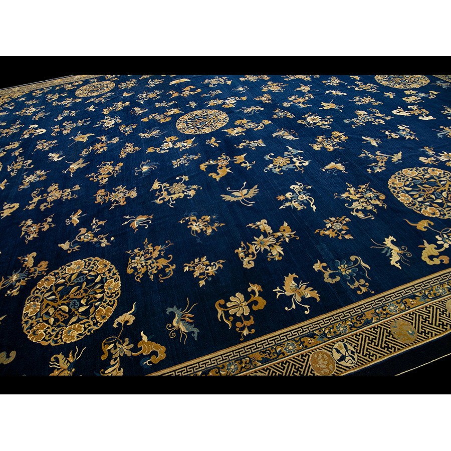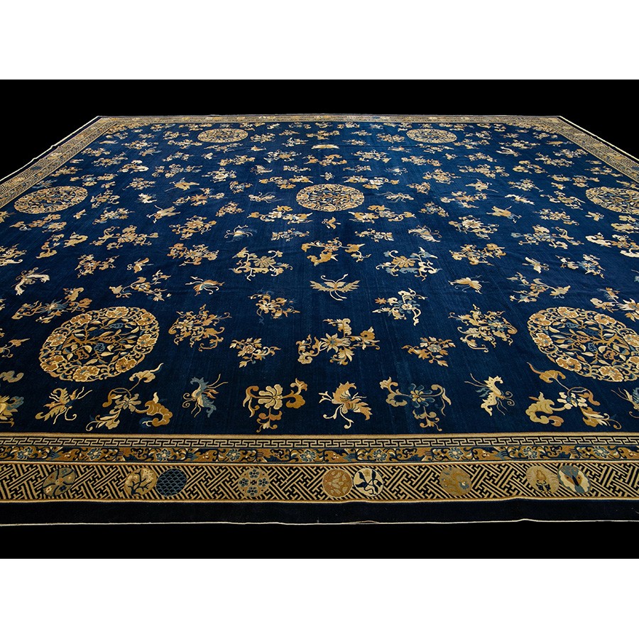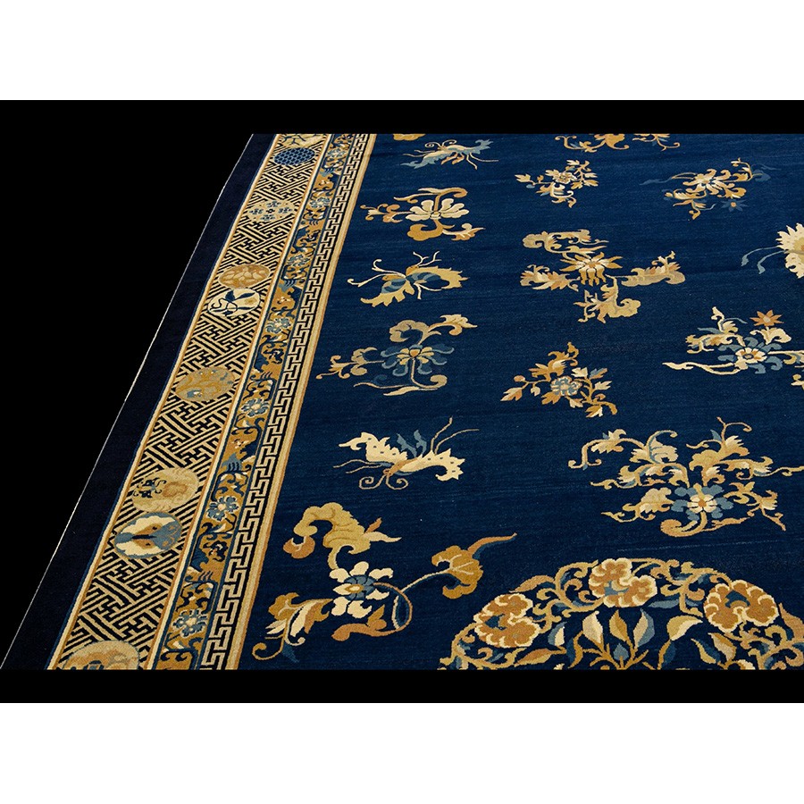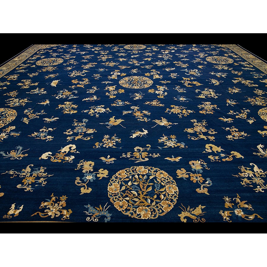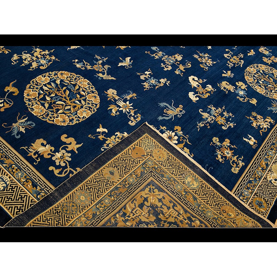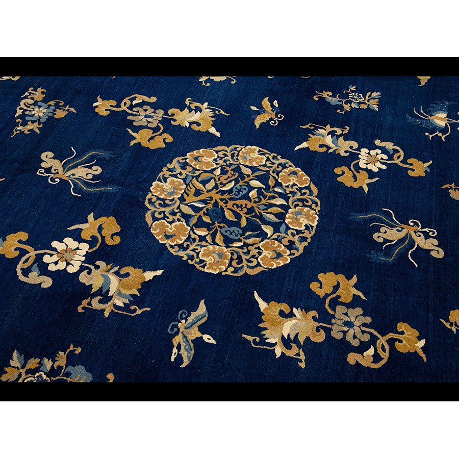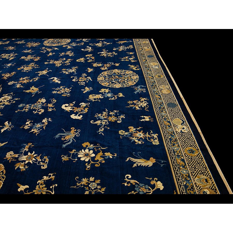 DescriptionChineseCarpets made in China proper. See entries Ningshia, Peking, Art Deco. Chinese - PekingThe commercial Peking carpet is a later 19th century development, begun by importing weaves from Ningshia (see entry) to create and export industry aimed at Western markets. The foundation is cotton and the pile is a good quality carpet wool which takes dyes particularly well. The neat medium weave is in Persian (asymmetric) knots. Designs are strictly Chinese and the whole motif repertoire of Chinese art is employed. Blue and white is the most popular color combination and red is particularly rare. Sizes tend to 9 x 12 and larger, and few small pieces appear. For a short time in the early 1920s Persian designs were woven to capitalize on the death of new Iranian goods. The industry decimated by the Communist Revolution relocated to the Pearl River area. There is a good supply of antique carpets at reasonable prices. | |