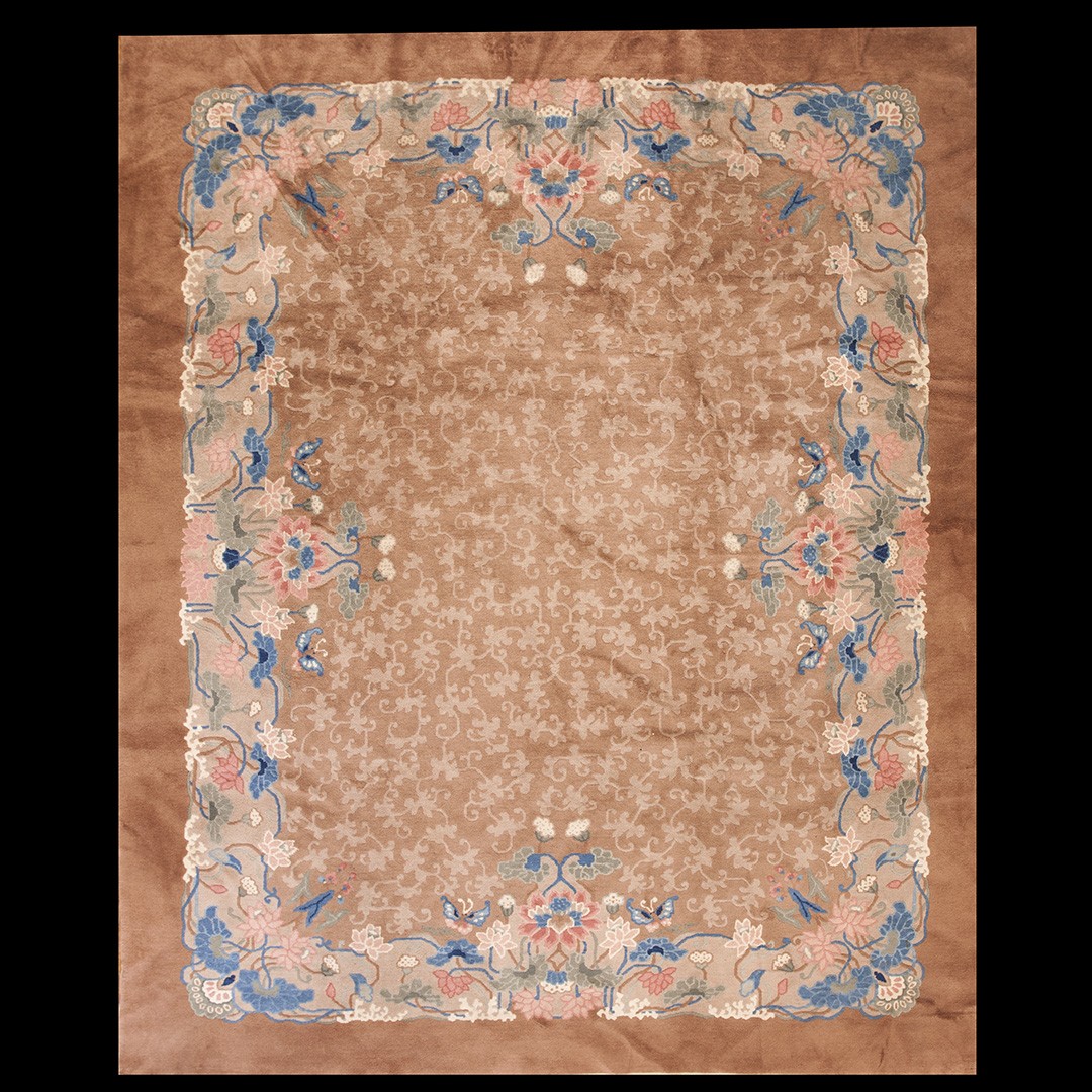 DescriptionChineseCarpets made in China proper. See entries Ningshia, Peking, Art Deco. Chinese - PekingThe commercial Peking carpet is a later 19th century development, begun by importing weaves from Ningshia (see entry) to create and export industry aimed at Western markets. The foundation is cotton and the pile is a good quality carpet wool which takes dyes particularly well. The neat medium weave is in Persian (asymmetric) knots. Designs are strictly Chinese and the whole motif repertoire of Chinese art is employed. Blue and white is the most popular color combination and red is particularly rare. Sizes tend to 9 x 12 and larger, and few small pieces appear. For a short time in the early 1920s Persian designs were woven to capitalize on the death of new Iranian goods. The industry decimated by the Communist Revolution relocated to the Pearl River area. There is a good supply of antique carpets at reasonable prices. | |