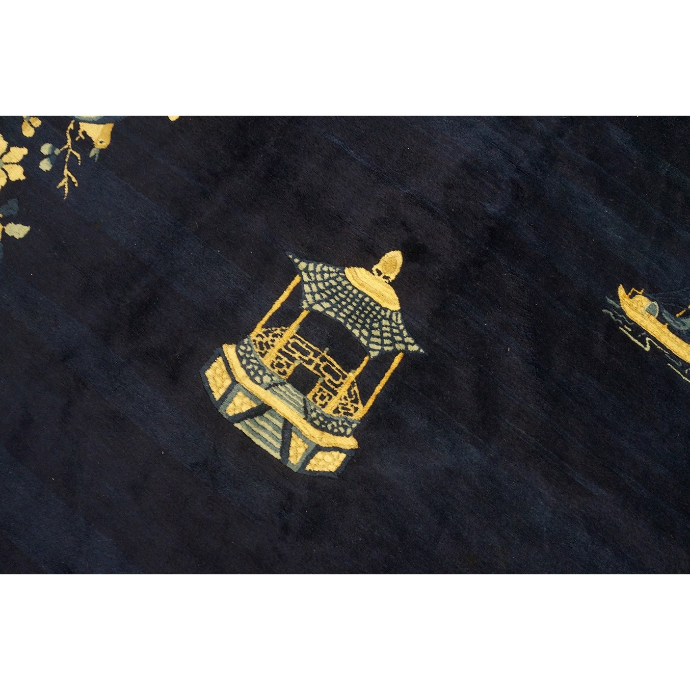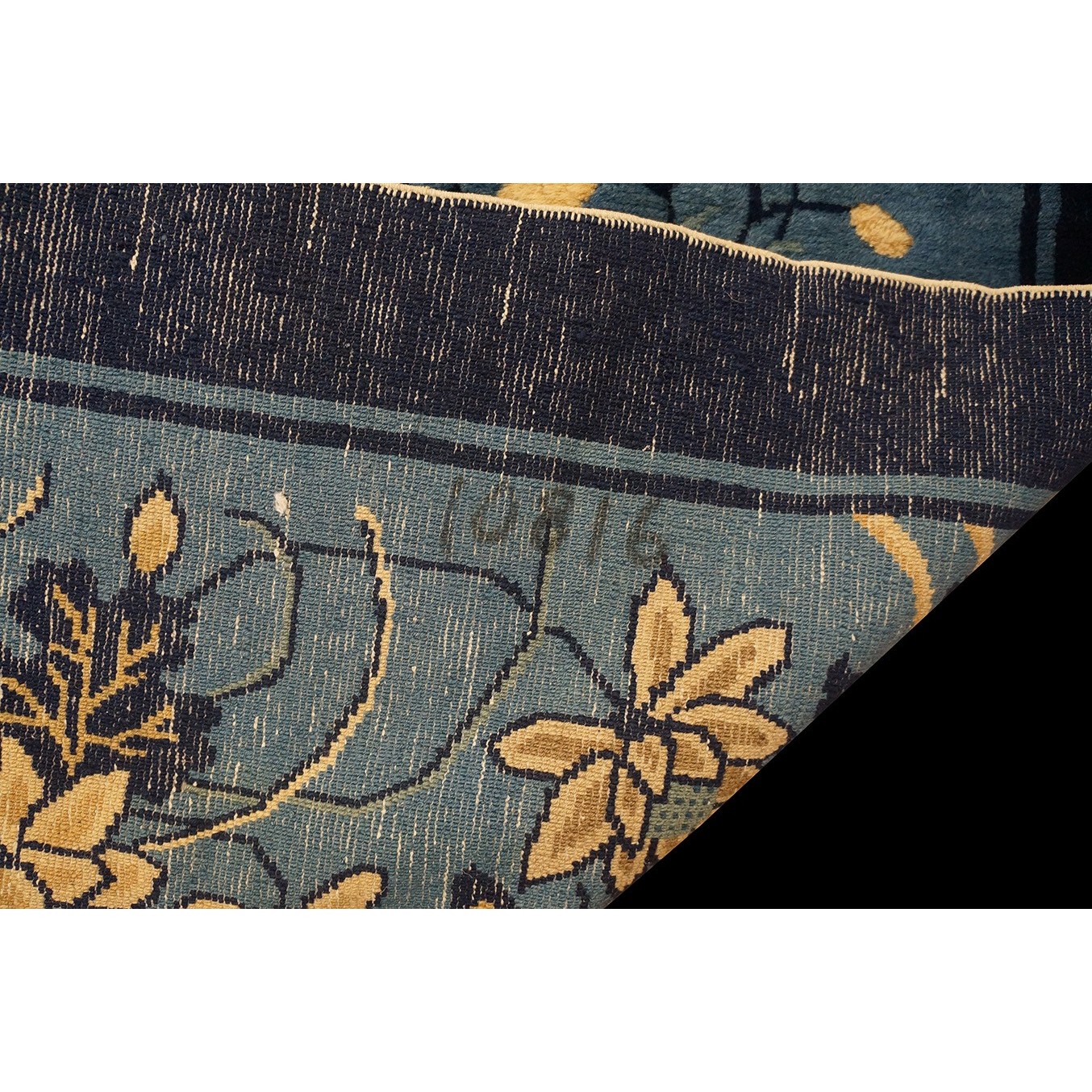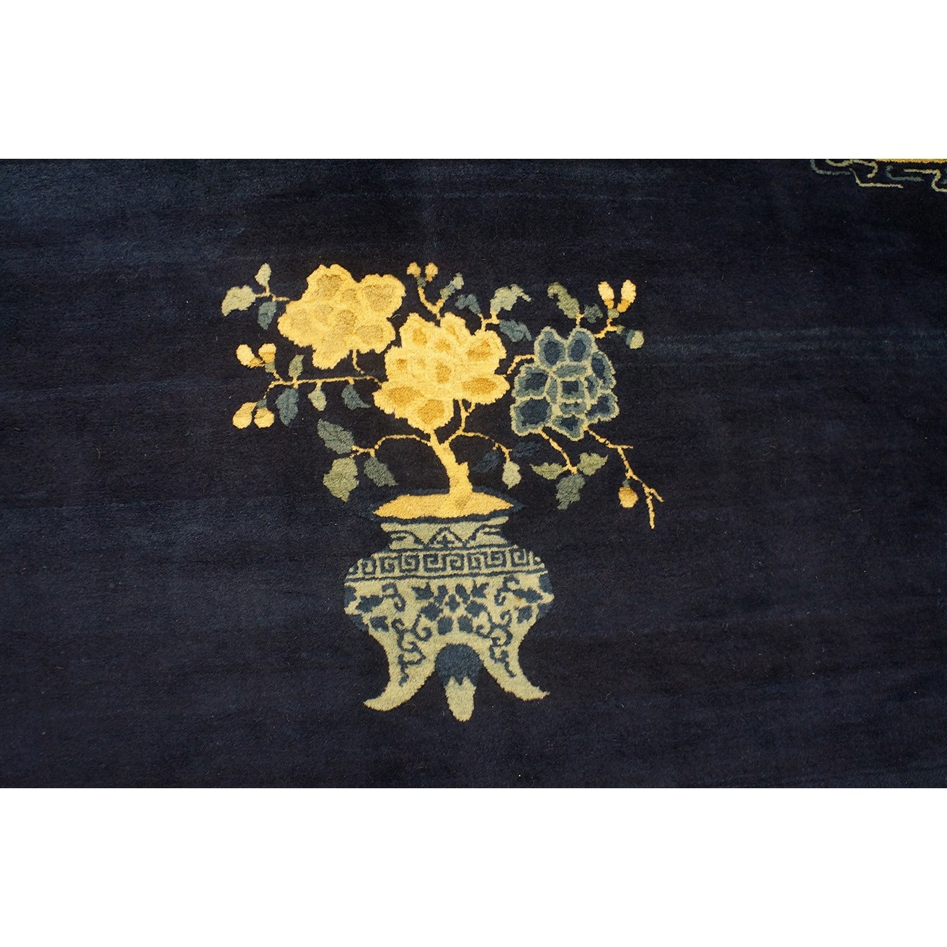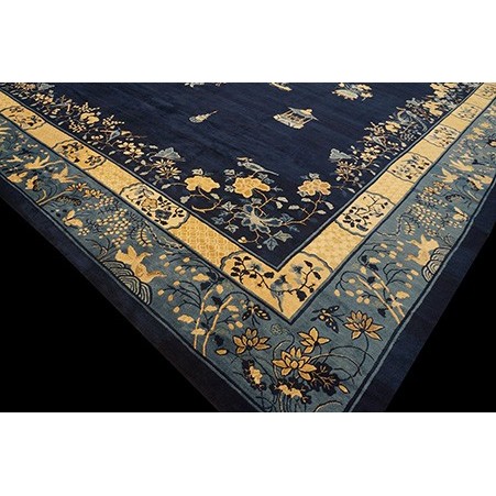 DescriptionChineseCarpets made in China proper. See entries Ningshia, Peking, Art Deco. Chinese - PekingThe commercial Peking carpet is a later 19th century development, begun by importing weaves from Ningshia (see entry) to create and export industry aimed at Western markets. The foundation is cotton and the pile is a good quality carpet wool which takes dyes particularly well. The neat medium weave is in Persian (asymmetric) knots. Designs are strictly Chinese and the whole motif repertoire of Chinese art is employed. Blue and white is the most popular color combination and red is particularly rare. Sizes tend to 9 x 12 and larger, and few small pieces appear. For a short time in the early 1920s Persian designs were woven to capitalize on the death of new Iranian goods. The industry decimated by the Communist Revolution relocated to the Pearl River area. There is a good supply of antique carpets at reasonable prices. | |