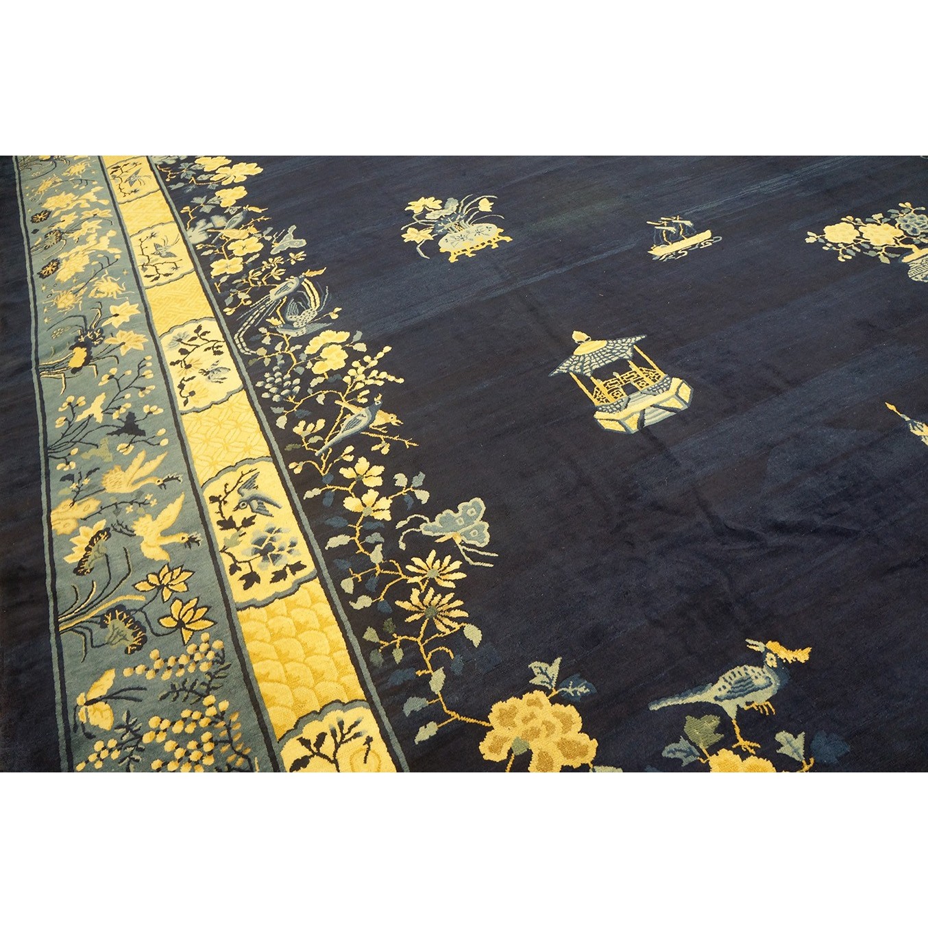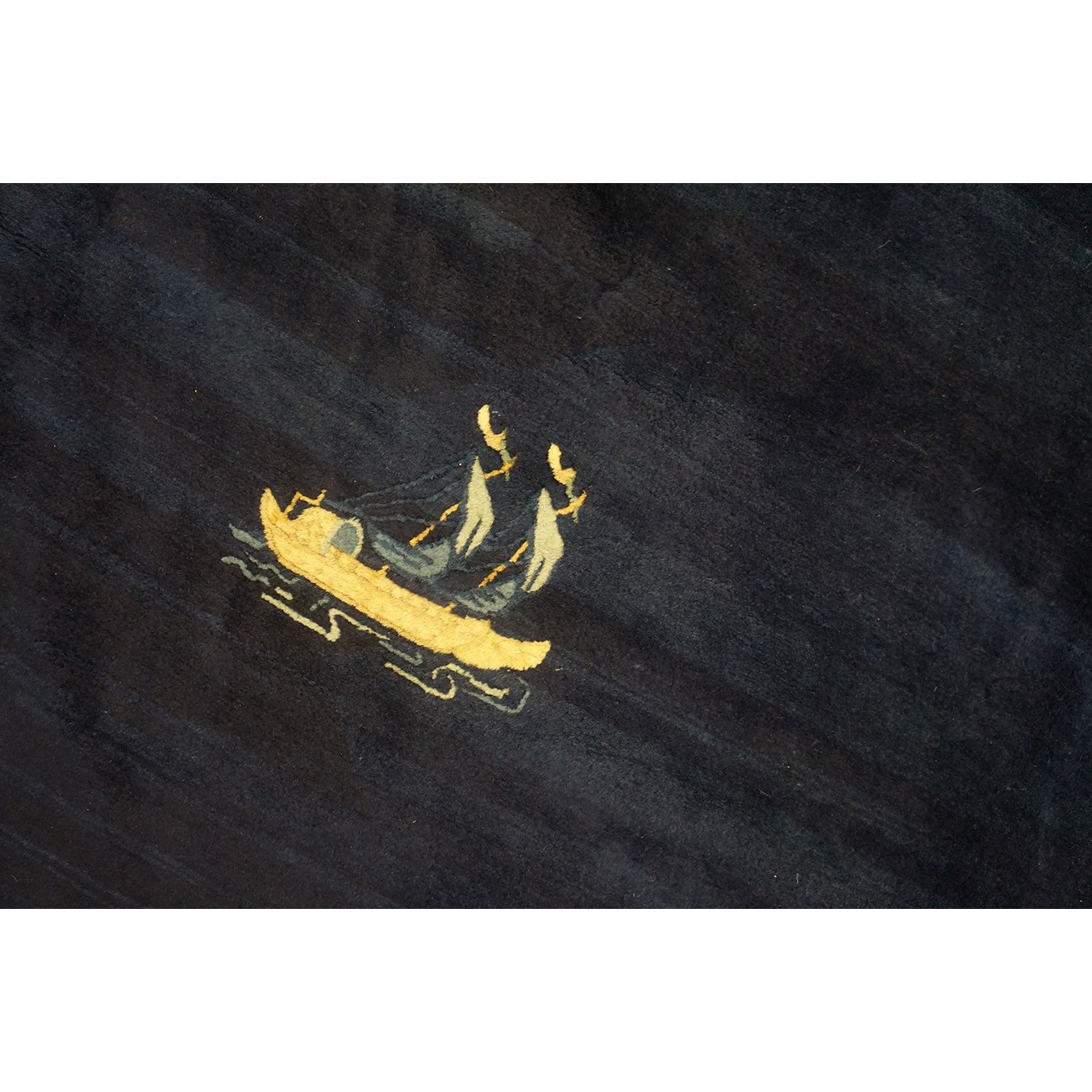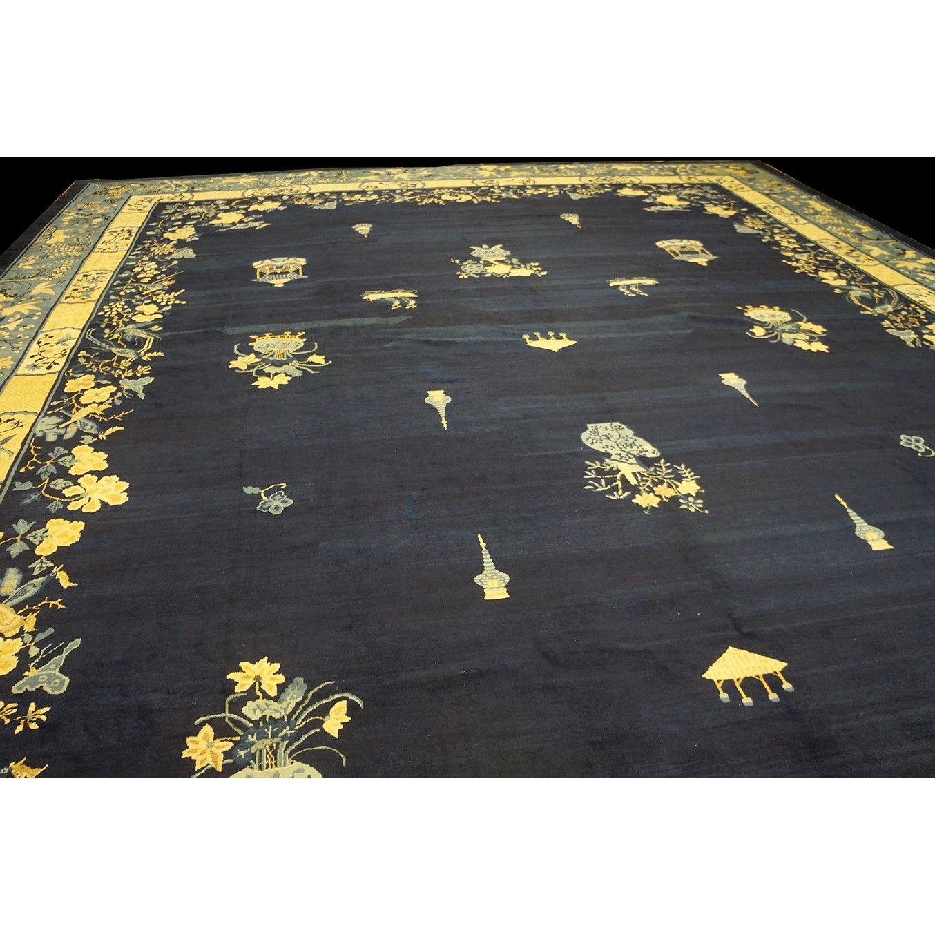 DescriptionChineseCarpets made in China proper. See entries Ningshia, Peking, Art Deco. Chinese - PekingThe commercial Peking carpet is a later 19th century development, begun by importing weaves from Ningshia (see entry) to create and export industry aimed at Western markets. The foundation is cotton and the pile is a good quality carpet wool which takes dyes particularly well. The neat medium weave is in Persian (asymmetric) knots. Designs are strictly Chinese and the whole motif repertoire of Chinese art is employed. Blue and white is the most popular color combination and red is particularly rare. Sizes tend to 9 x 12 and larger, and few small pieces appear. For a short time in the early 1920s Persian designs were woven to capitalize on the death of new Iranian goods. The industry decimated by the Communist Revolution relocated to the Pearl River area. There is a good supply of antique carpets at reasonable prices. | |