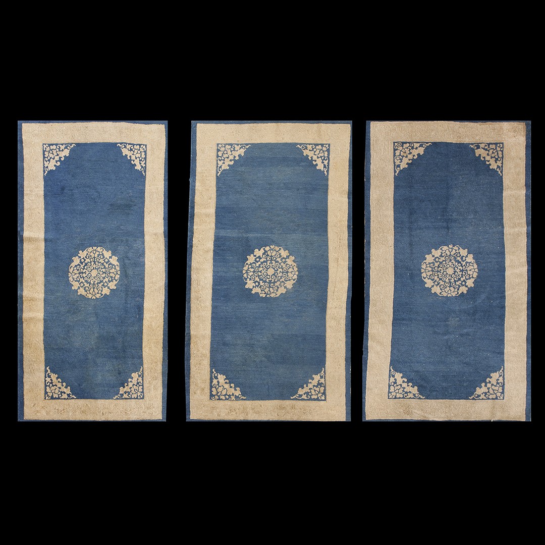 DescriptionChineseCarpets made in China proper. See entries Ningshia, Peking, Art Deco. Chinese - PekingThe commercial Peking carpet is a later 19th century development, begun by importing weaves from Ningshia (see entry) to create and export industry aimed at Western markets. The foundation is cotton and the pile is a good quality carpet wool which takes dyes particularly well. The neat medium weave is in Persian (asymmetric) knots. Designs are strictly Chinese and the whole motif repertoire of Chinese art is employed. Blue and white is the most popular color combination and red is particularly rare. Sizes tend to 9 x 12 and larger, and few small pieces appear. For a short time in the early 1920s Persian designs were woven to capitalize on the death of new Iranian goods. The industry decimated by the Communist Revolution relocated to the Pearl River area. There is a good supply of antique carpets at reasonable prices. | |