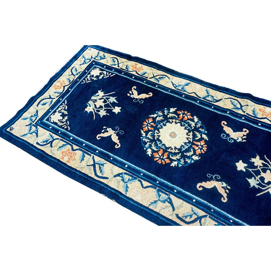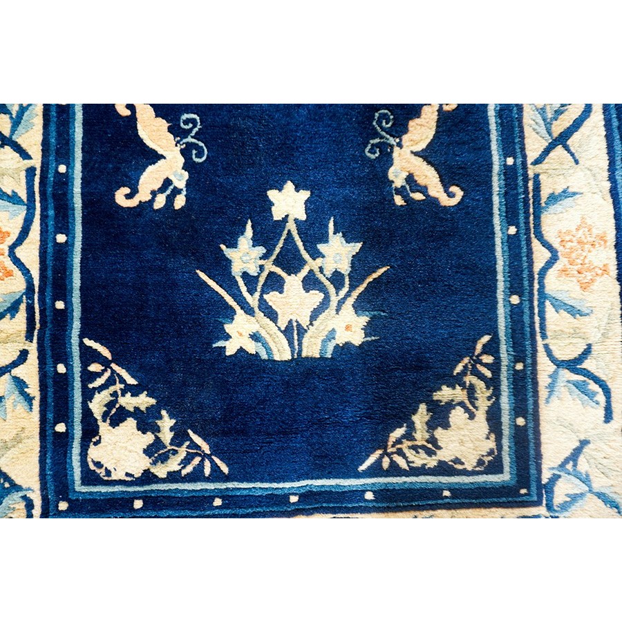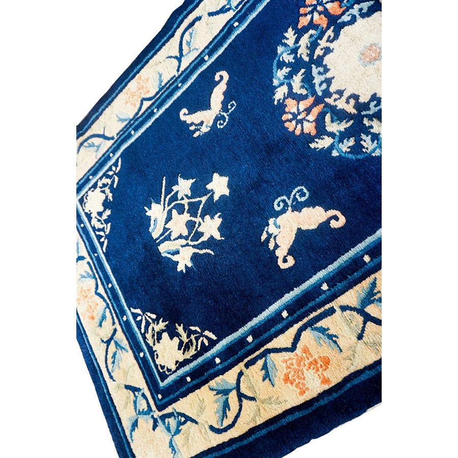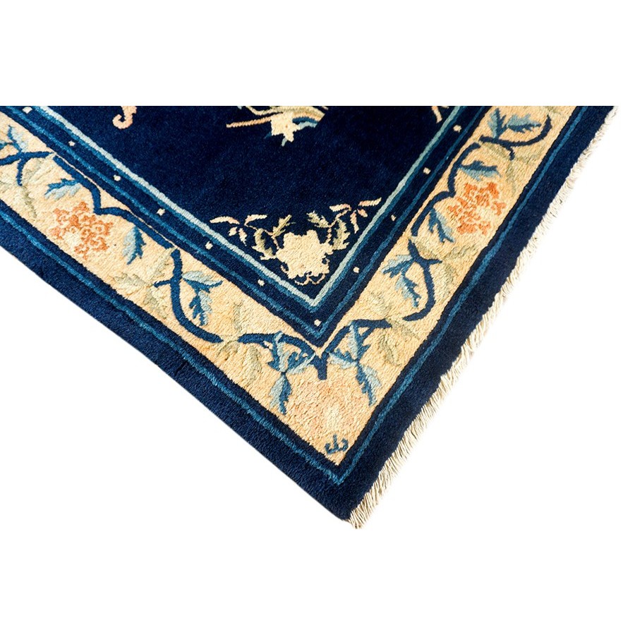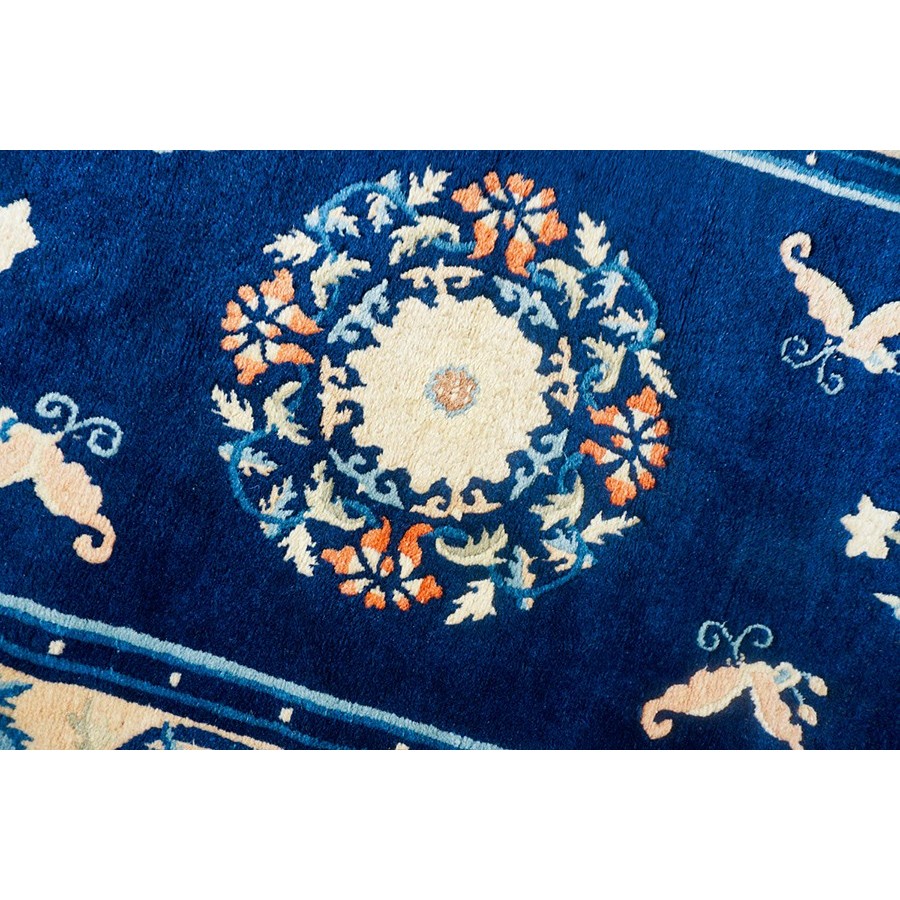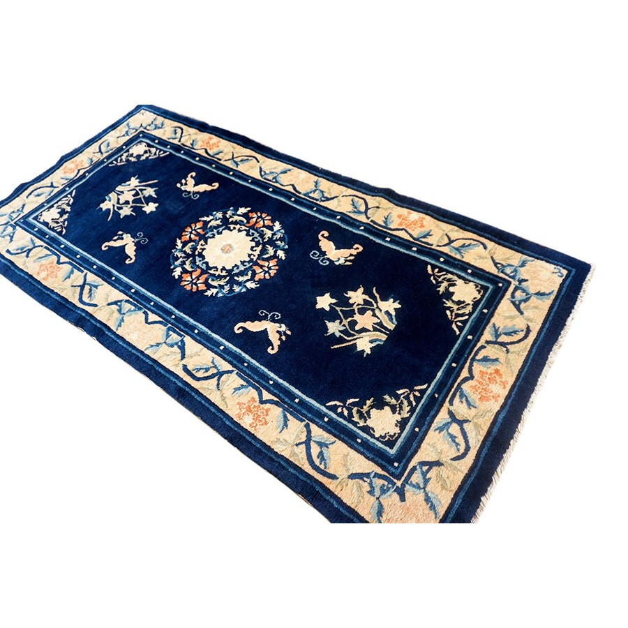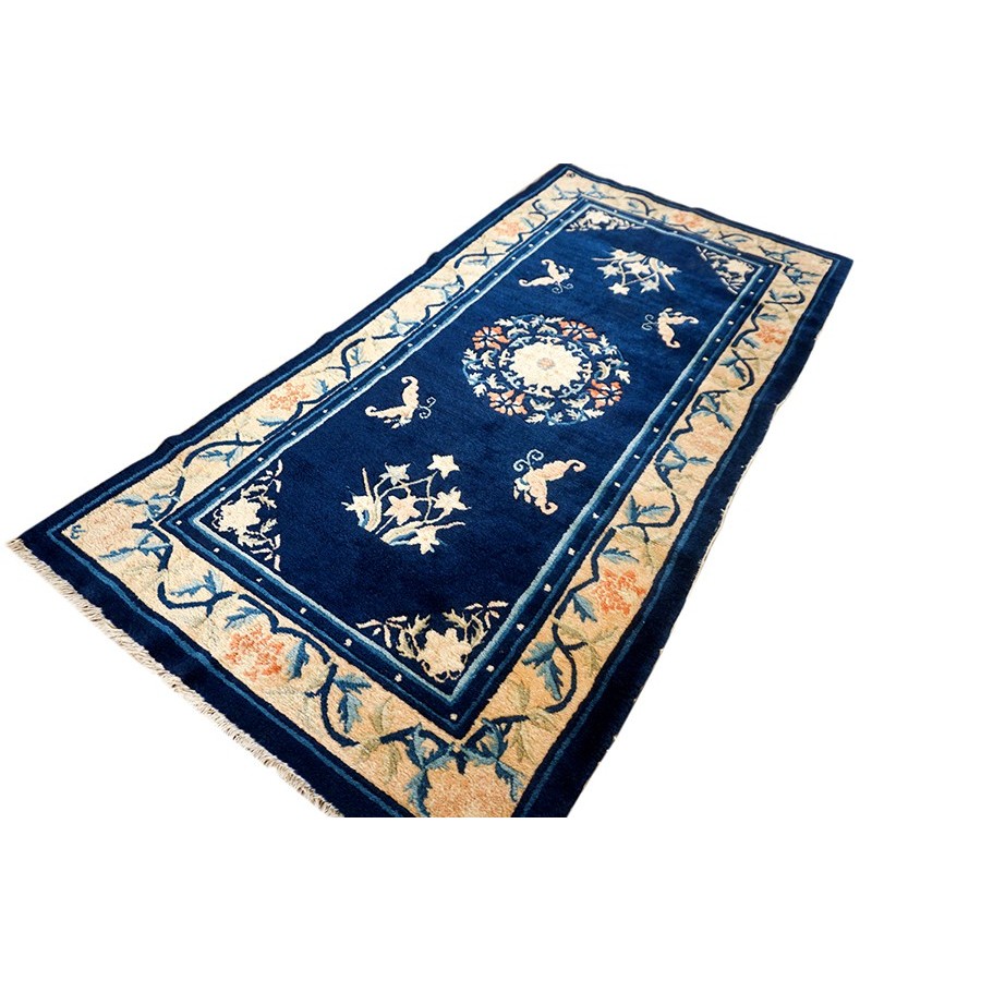 DescriptionChineseCarpets made in China proper. See entries Ningshia, Peking, Art Deco. Chinese - PekingThe commercial Peking carpet is a later 19th century development, begun by importing weaves from Ningshia (see entry) to create and export industry aimed at Western markets. The foundation is cotton and the pile is a good quality carpet wool which takes dyes particularly well. The neat medium weave is in Persian (asymmetric) knots. Designs are strictly Chinese and the whole motif repertoire of Chinese art is employed. Blue and white is the most popular color combination and red is particularly rare. Sizes tend to 9 x 12 and larger, and few small pieces appear. For a short time in the early 1920s Persian designs were woven to capitalize on the death of new Iranian goods. The industry decimated by the Communist Revolution relocated to the Pearl River area. There is a good supply of antique carpets at reasonable prices. | |