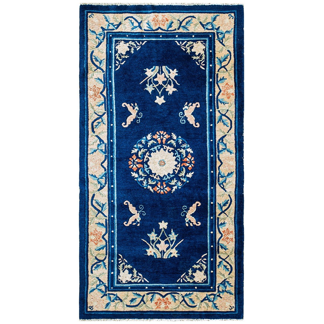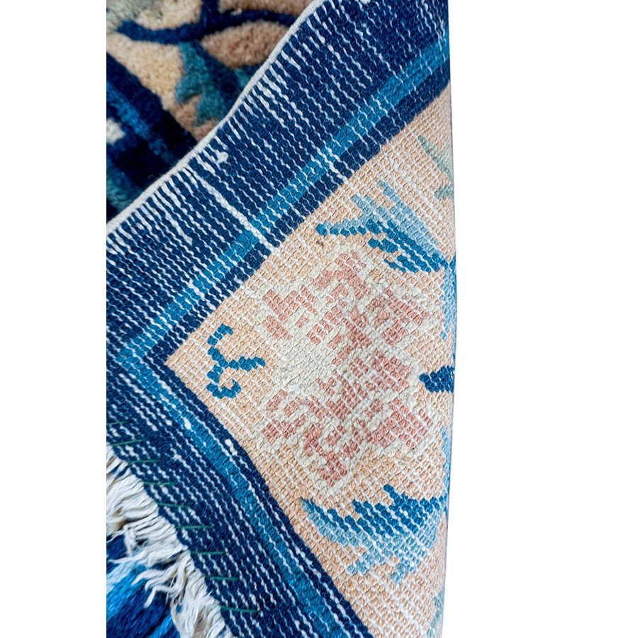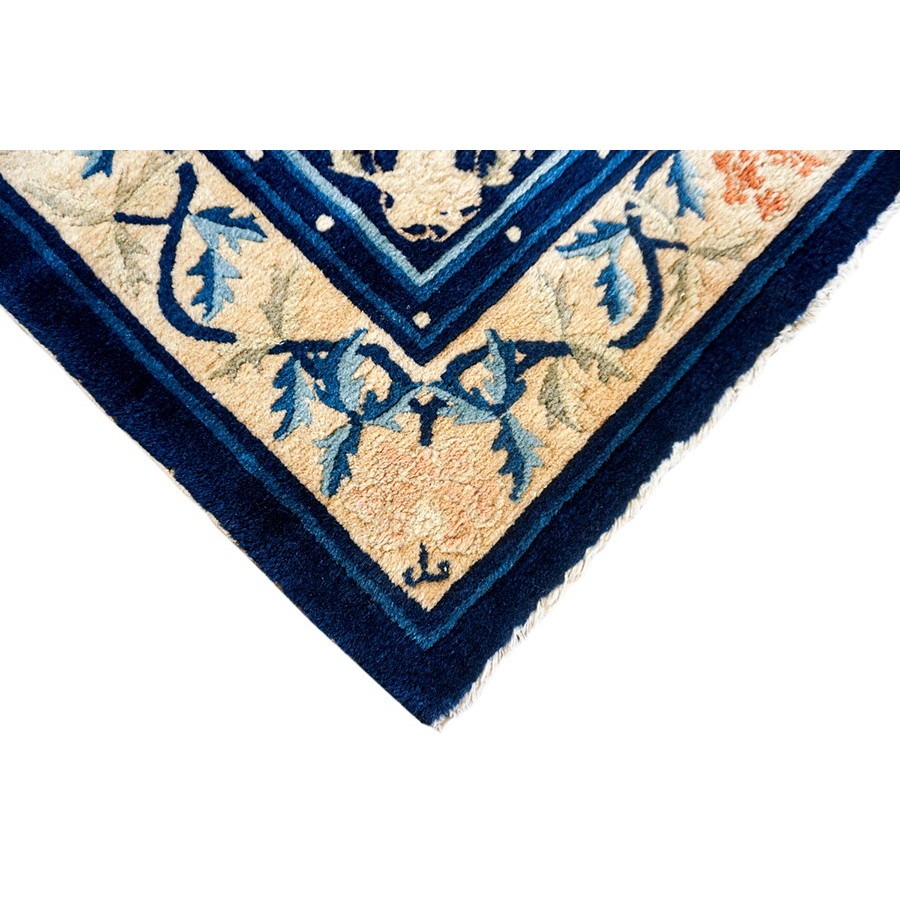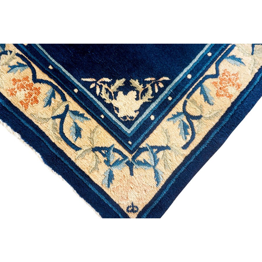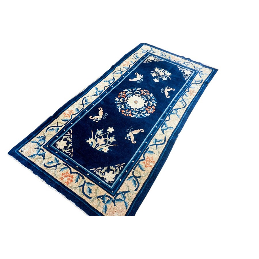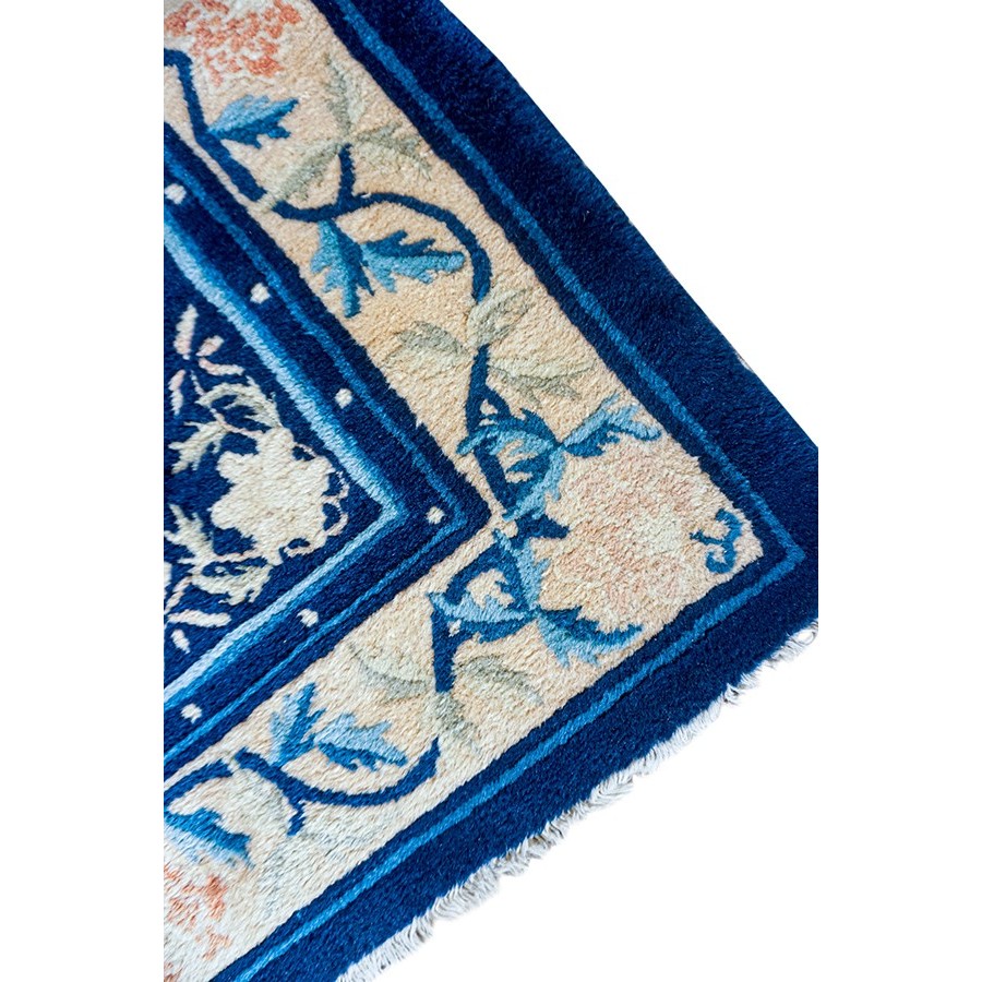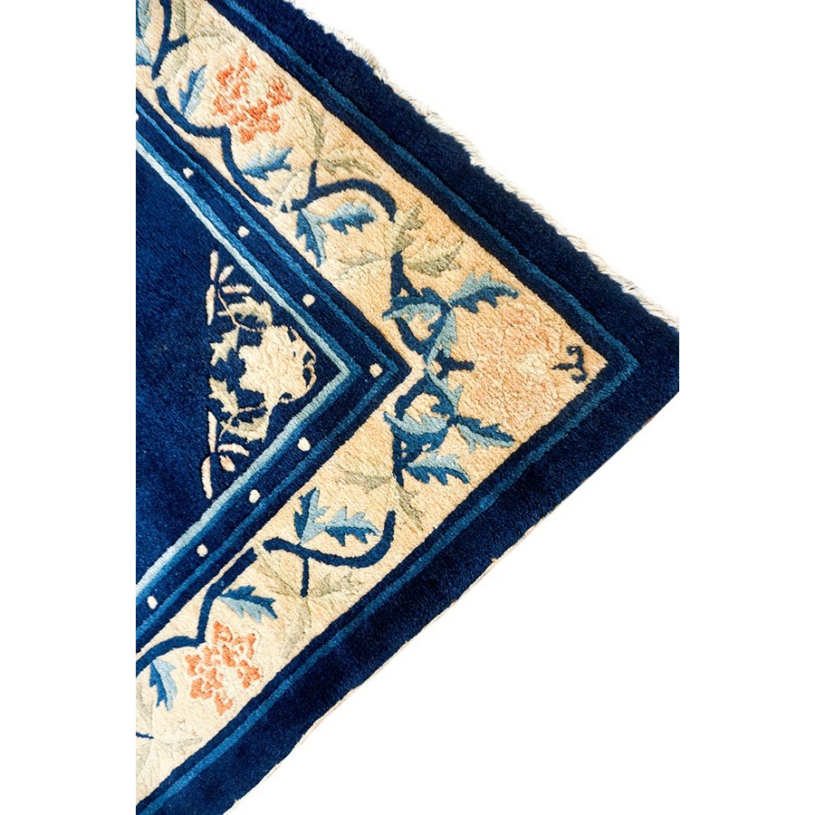 DescriptionChineseCarpets made in China proper. See entries Ningshia, Peking, Art Deco. Chinese - PekingThe commercial Peking carpet is a later 19th century development, begun by importing weaves from Ningshia (see entry) to create and export industry aimed at Western markets. The foundation is cotton and the pile is a good quality carpet wool which takes dyes particularly well. The neat medium weave is in Persian (asymmetric) knots. Designs are strictly Chinese and the whole motif repertoire of Chinese art is employed. Blue and white is the most popular color combination and red is particularly rare. Sizes tend to 9 x 12 and larger, and few small pieces appear. For a short time in the early 1920s Persian designs were woven to capitalize on the death of new Iranian goods. The industry decimated by the Communist Revolution relocated to the Pearl River area. There is a good supply of antique carpets at reasonable prices. | |