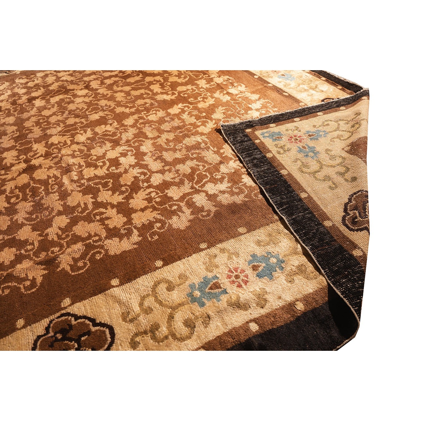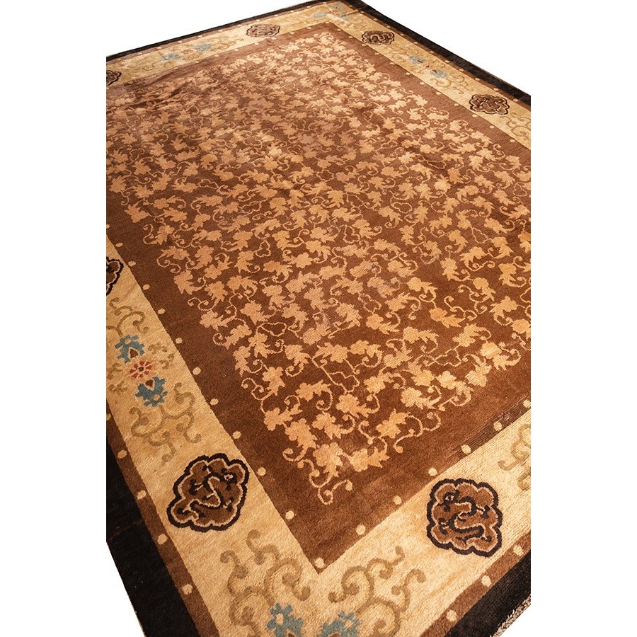 DescriptionChineseCarpets made in China proper. See entries Ningshia, Peking, Art Deco. Chinese - PekingThe commercial Peking carpet is a later 19th century development, begun by importing weaves from Ningshia (see entry) to create and export industry aimed at Western markets. The foundation is cotton and the pile is a good quality carpet wool which takes dyes particularly well. The neat medium weave is in Persian (asymmetric) knots. Designs are strictly Chinese and the whole motif repertoire of Chinese art is employed. Blue and white is the most popular color combination and red is particularly rare. Sizes tend to 9 x 12 and larger, and few small pieces appear. For a short time in the early 1920s Persian designs were woven to capitalize on the death of new Iranian goods. The industry decimated by the Communist Revolution relocated to the Pearl River area. There is a good supply of antique carpets at reasonable prices. | |