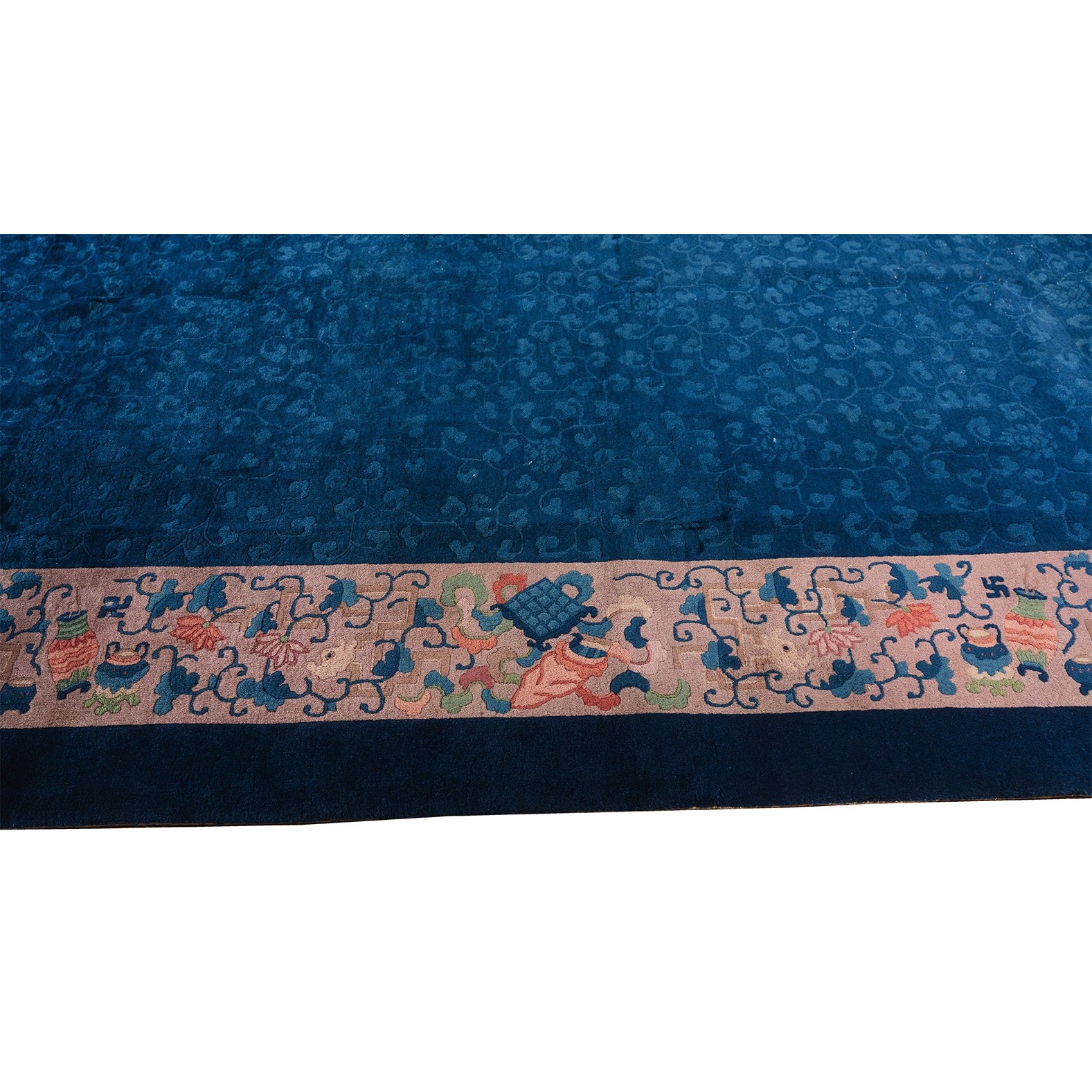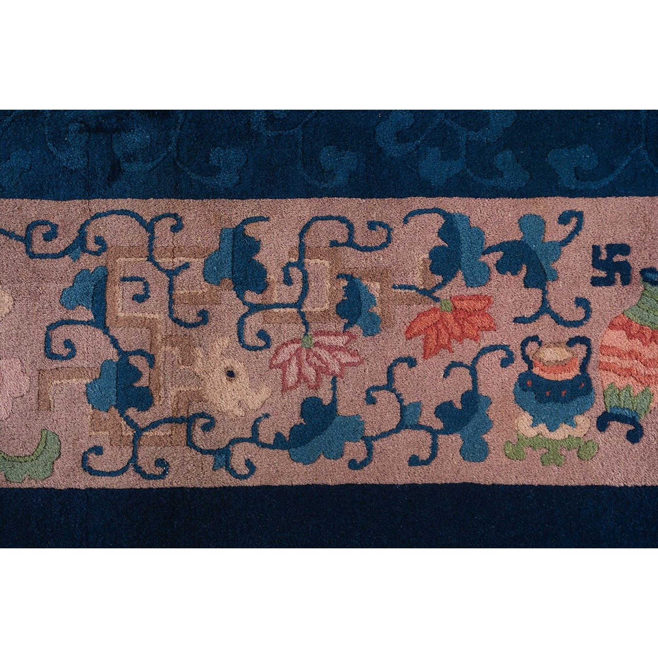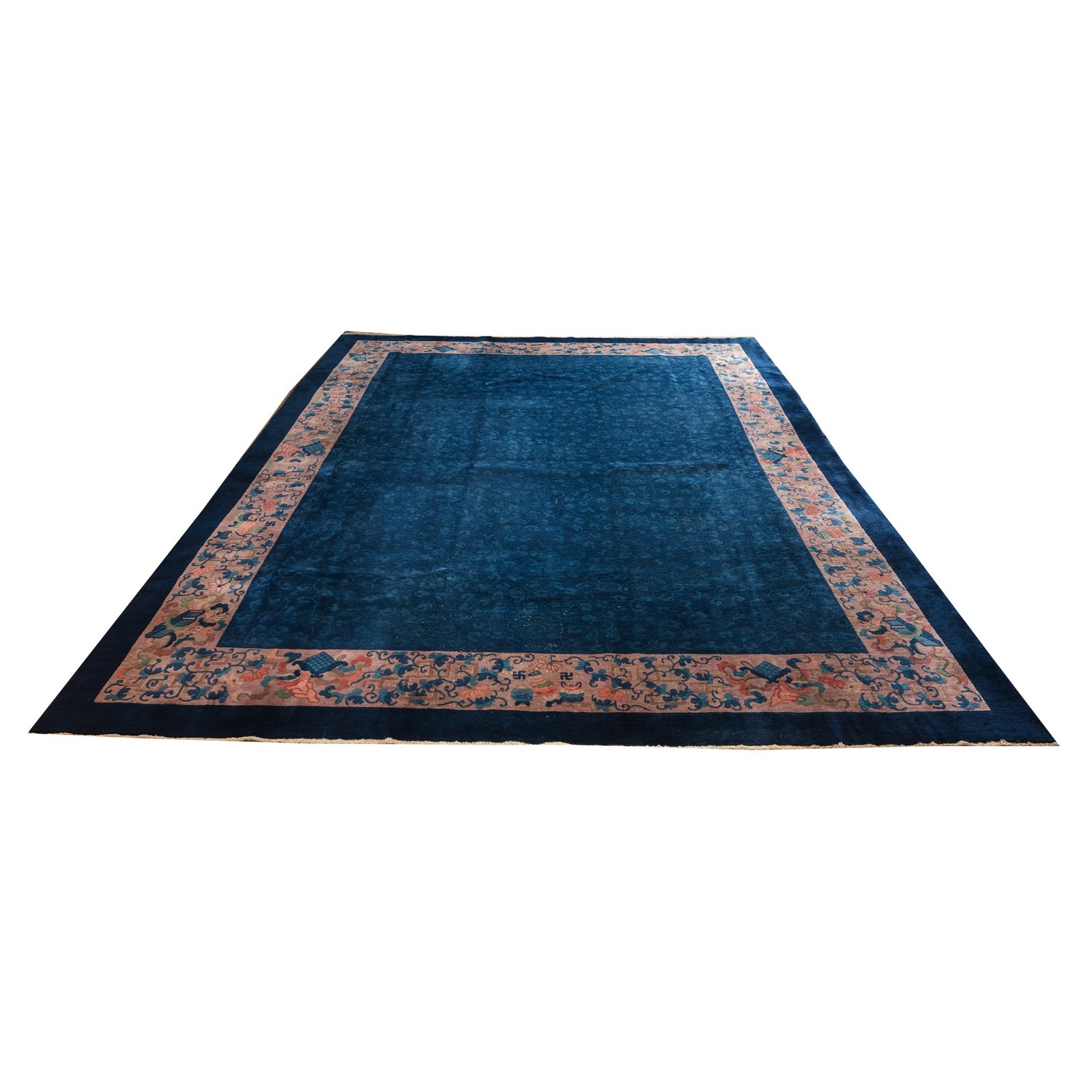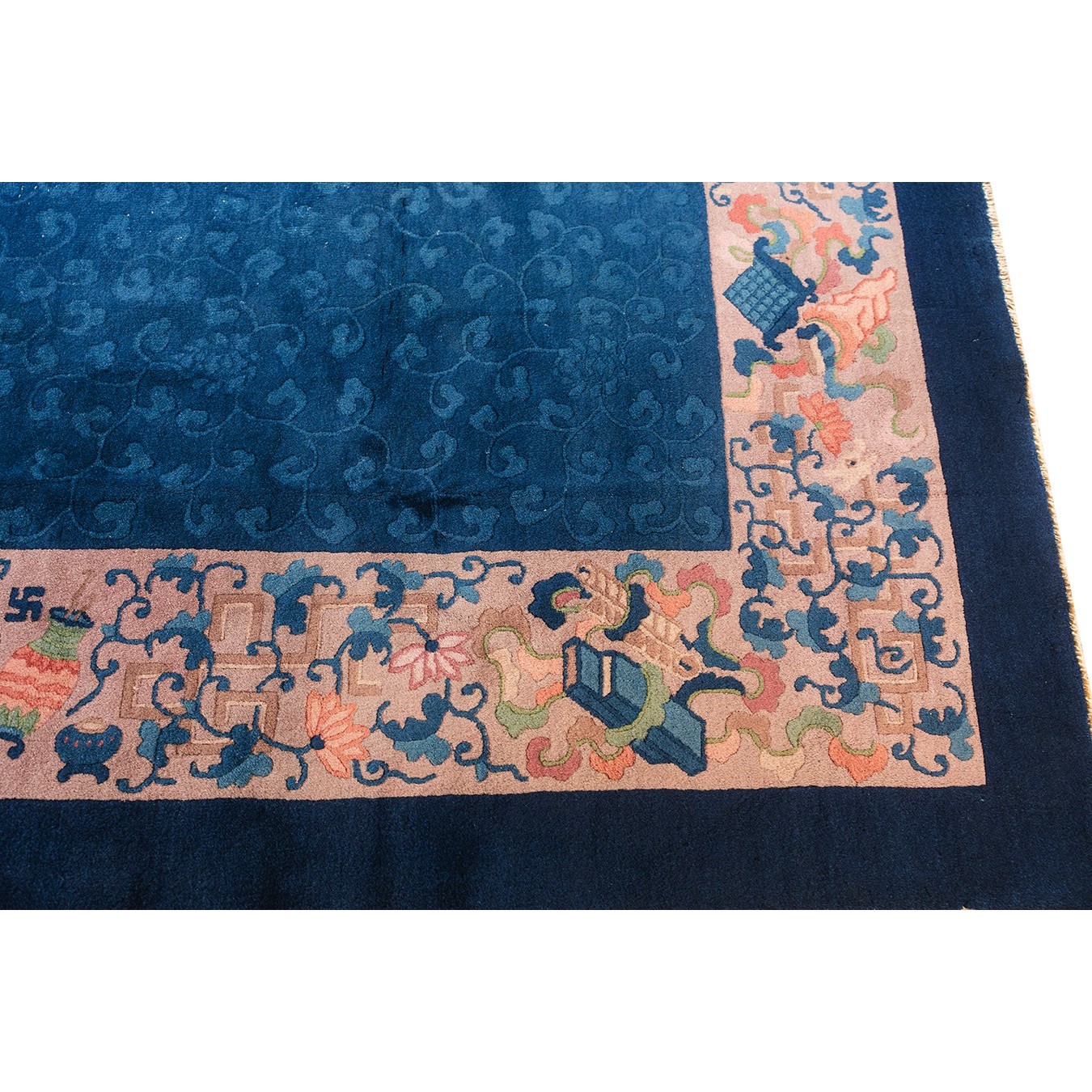 DescriptionChineseCarpets made in China proper. See entries Ningshia, Peking, Art Deco. Chinese - PekingThe commercial Peking carpet is a later 19th century development, begun by importing weaves from Ningshia (see entry) to create and export industry aimed at Western markets. The foundation is cotton and the pile is a good quality carpet wool which takes dyes particularly well. The neat medium weave is in Persian (asymmetric) knots. Designs are strictly Chinese and the whole motif repertoire of Chinese art is employed. Blue and white is the most popular color combination and red is particularly rare. Sizes tend to 9 x 12 and larger, and few small pieces appear. For a short time in the early 1920s Persian designs were woven to capitalize on the death of new Iranian goods. The industry decimated by the Communist Revolution relocated to the Pearl River area. There is a good supply of antique carpets at reasonable prices. | |