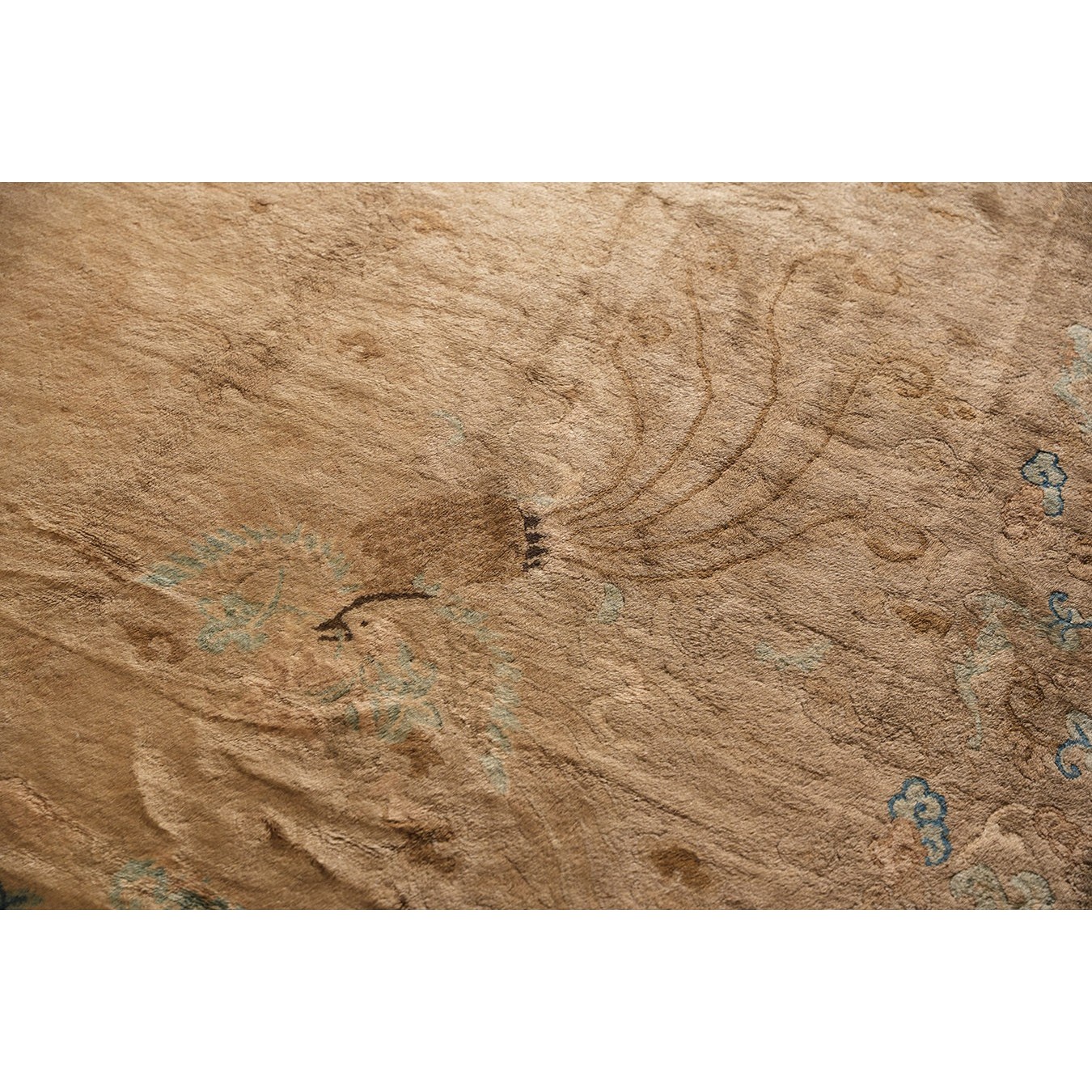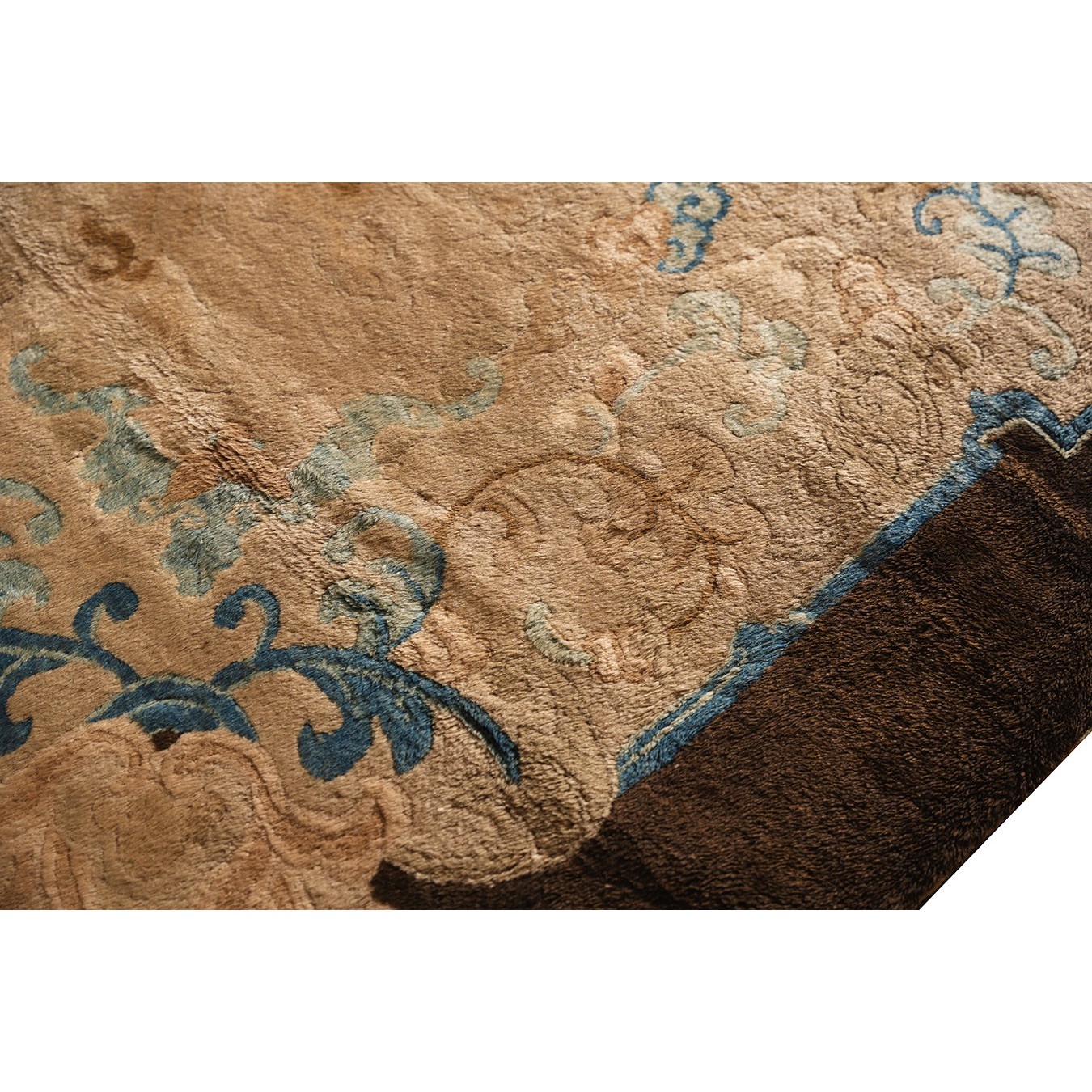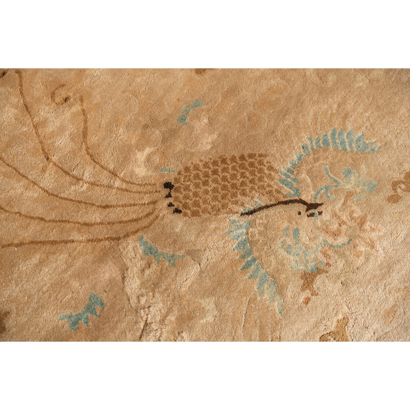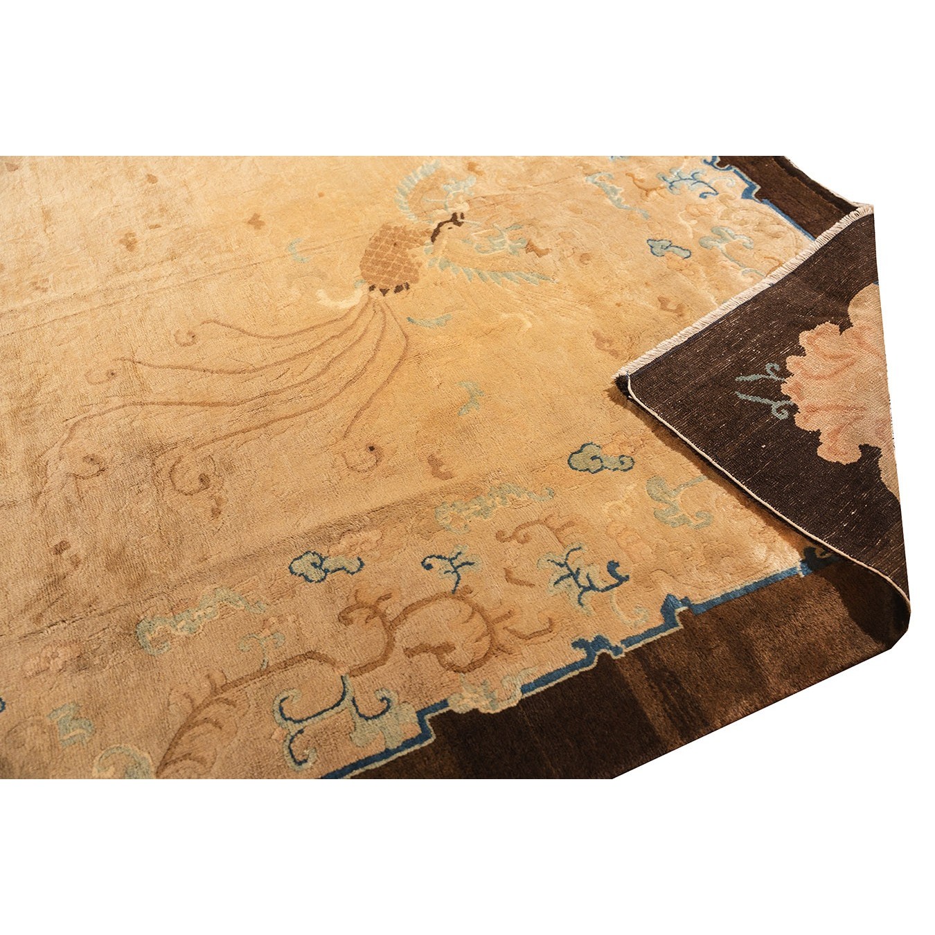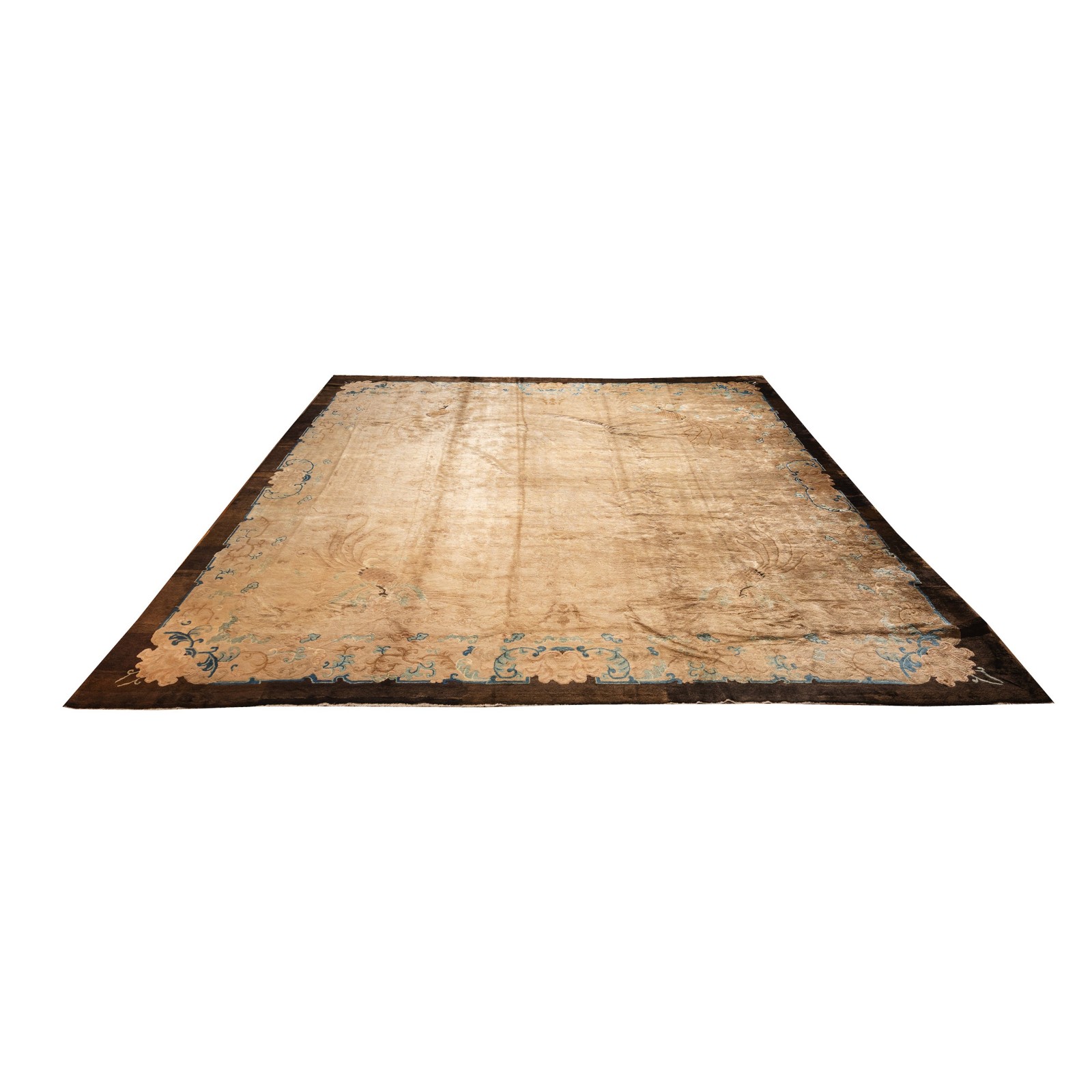 DescriptionChineseCarpets made in China proper. See entries Ningshia, Peking, Art Deco. Chinese - PekingThe commercial Peking carpet is a later 19th century development, begun by importing weaves from Ningshia (see entry) to create and export industry aimed at Western markets. The foundation is cotton and the pile is a good quality carpet wool which takes dyes particularly well. The neat medium weave is in Persian (asymmetric) knots. Designs are strictly Chinese and the whole motif repertoire of Chinese art is employed. Blue and white is the most popular color combination and red is particularly rare. Sizes tend to 9 x 12 and larger, and few small pieces appear. For a short time in the early 1920s Persian designs were woven to capitalize on the death of new Iranian goods. The industry decimated by the Communist Revolution relocated to the Pearl River area. There is a good supply of antique carpets at reasonable prices. | |