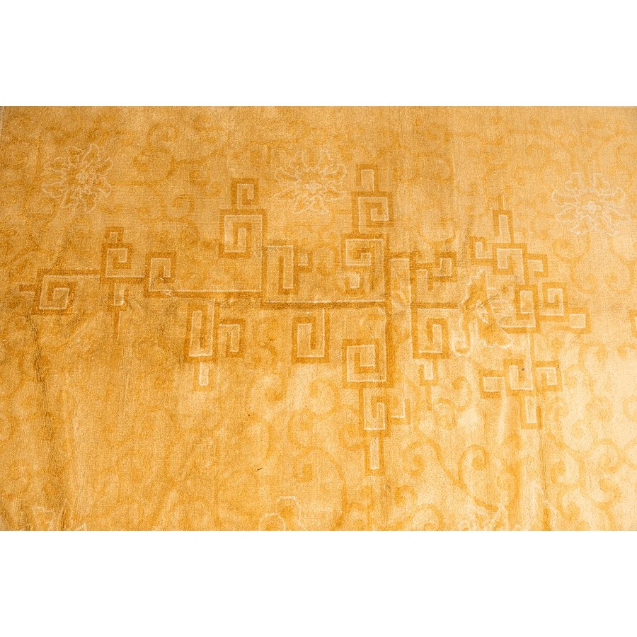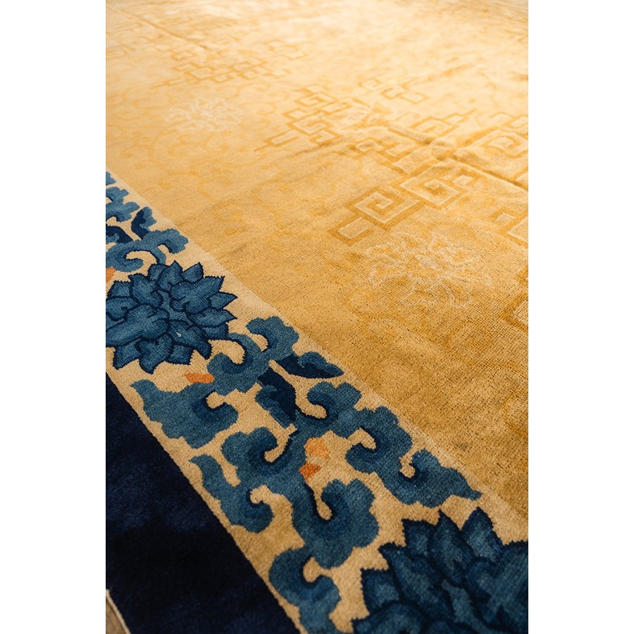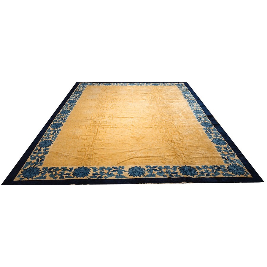 DescriptionChineseCarpets made in China proper. See entries Ningshia, Peking, Art Deco. Chinese - PekingThe commercial Peking carpet is a later 19th century development, begun by importing weaves from Ningshia (see entry) to create and export industry aimed at Western markets. The foundation is cotton and the pile is a good quality carpet wool which takes dyes particularly well. The neat medium weave is in Persian (asymmetric) knots. Designs are strictly Chinese and the whole motif repertoire of Chinese art is employed. Blue and white is the most popular color combination and red is particularly rare. Sizes tend to 9 x 12 and larger, and few small pieces appear. For a short time in the early 1920s Persian designs were woven to capitalize on the death of new Iranian goods. The industry decimated by the Communist Revolution relocated to the Pearl River area. There is a good supply of antique carpets at reasonable prices. | |
