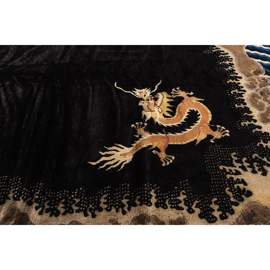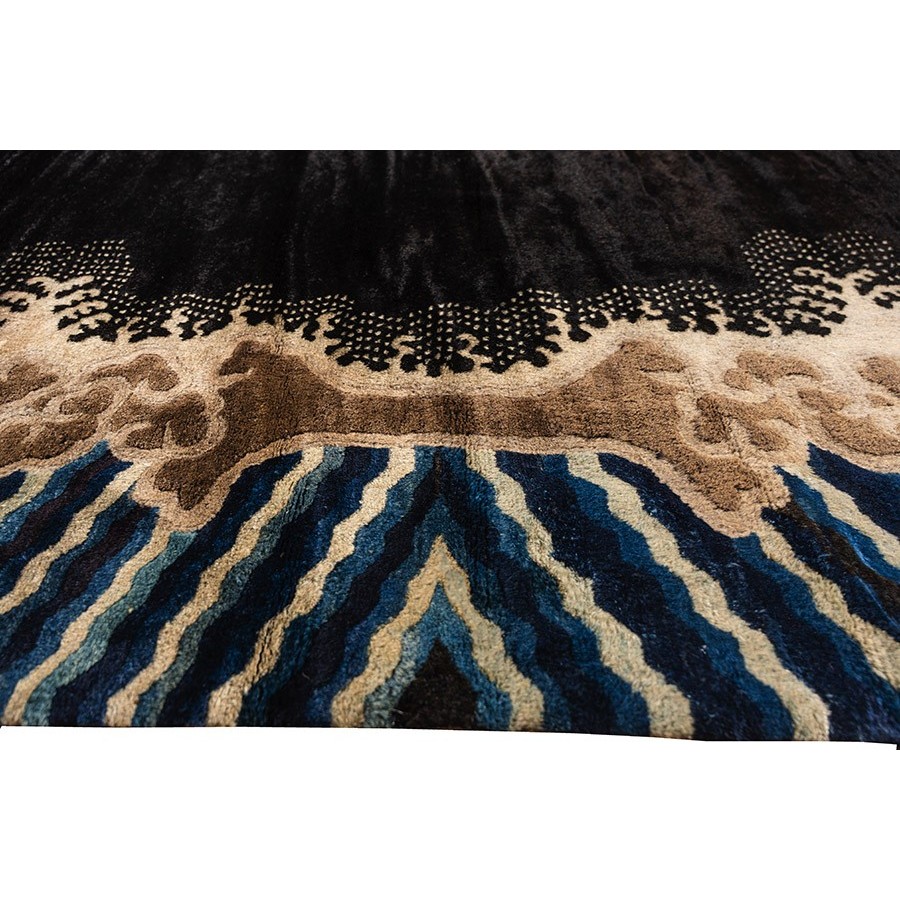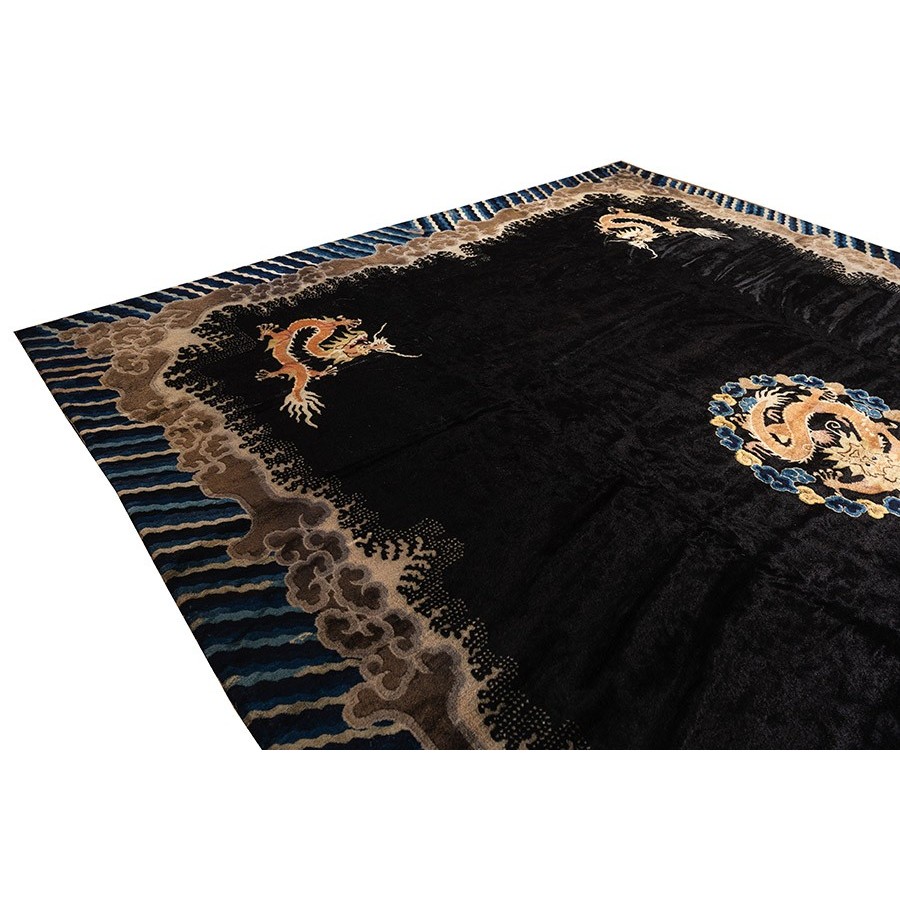 DescriptionChineseCarpets made in China proper. See entries Ningshia, Peking, Art Deco. Chinese - PekingThe commercial Peking carpet is a later 19th century development, begun by importing weaves from Ningshia (see entry) to create and export industry aimed at Western markets. The foundation is cotton and the pile is a good quality carpet wool which takes dyes particularly well. The neat medium weave is in Persian (asymmetric) knots. Designs are strictly Chinese and the whole motif repertoire of Chinese art is employed. Blue and white is the most popular color combination and red is particularly rare. Sizes tend to 9 x 12 and larger, and few small pieces appear. For a short time in the early 1920s Persian designs were woven to capitalize on the death of new Iranian goods. The industry decimated by the Communist Revolution relocated to the Pearl River area. There is a good supply of antique carpets at reasonable prices. | |