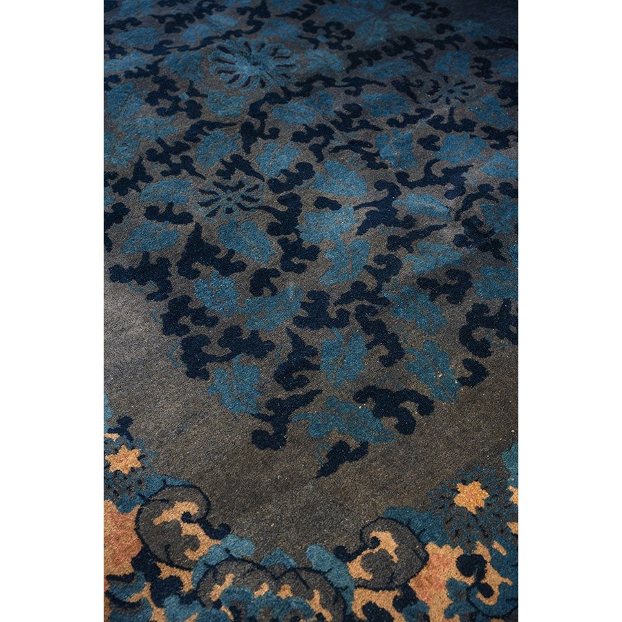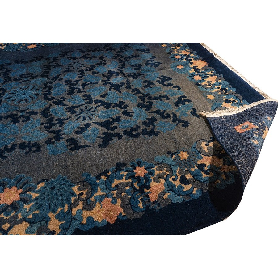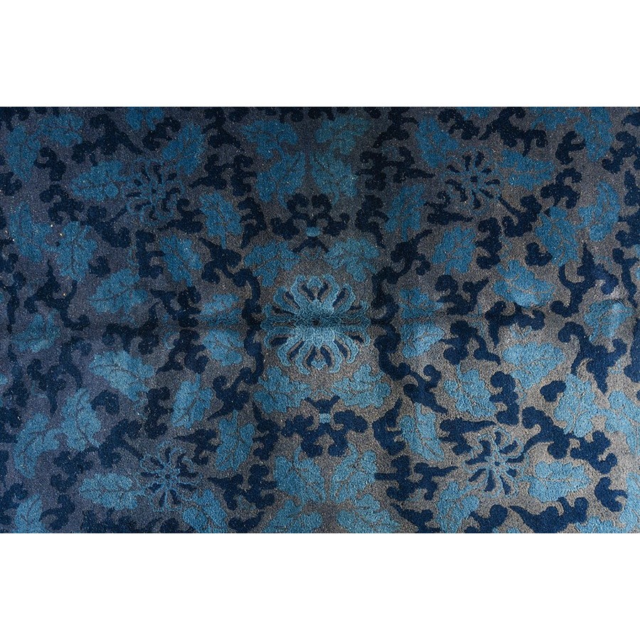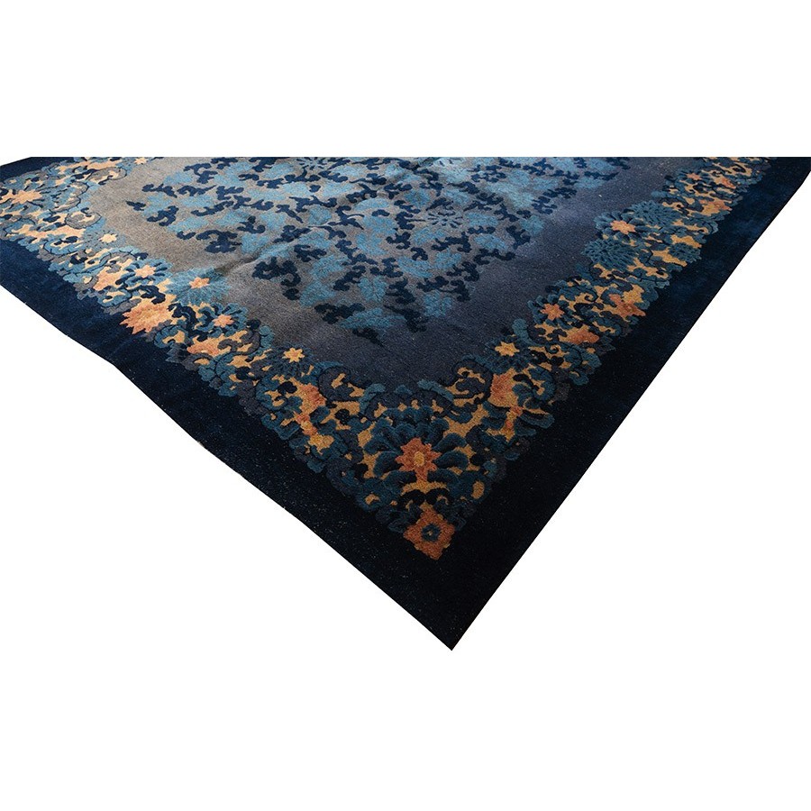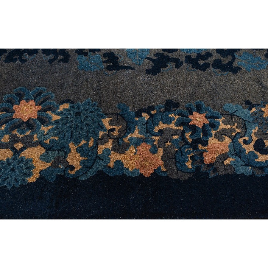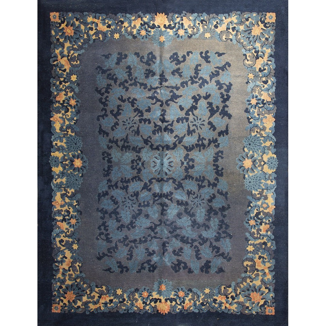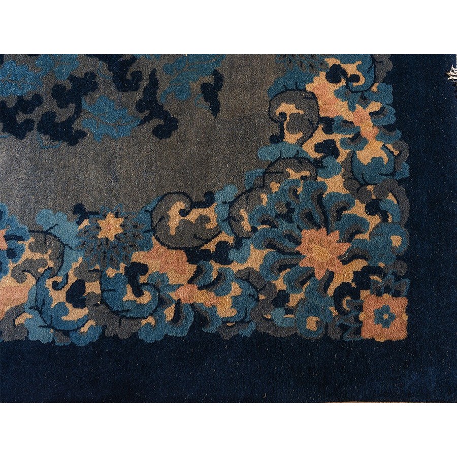DescriptionChineseCarpets made in China proper. See entries Ningshia, Peking, Art Deco. Chinese - PekingThe commercial Peking carpet is a later 19th century development, begun by importing weaves from Ningshia (see entry) to create and export industry aimed at Western markets. The foundation is cotton and the pile is a good quality carpet wool which takes dyes particularly well. The neat medium weave is in Persian (asymmetric) knots. Designs are strictly Chinese and the whole motif repertoire of Chinese art is employed. Blue and white is the most popular color combination and red is particularly rare. Sizes tend to 9 x 12 and larger, and few small pieces appear. For a short time in the early 1920s Persian designs were woven to capitalize on the death of new Iranian goods. The industry decimated by the Communist Revolution relocated to the Pearl River area. There is a good supply of antique carpets at reasonable prices. | |