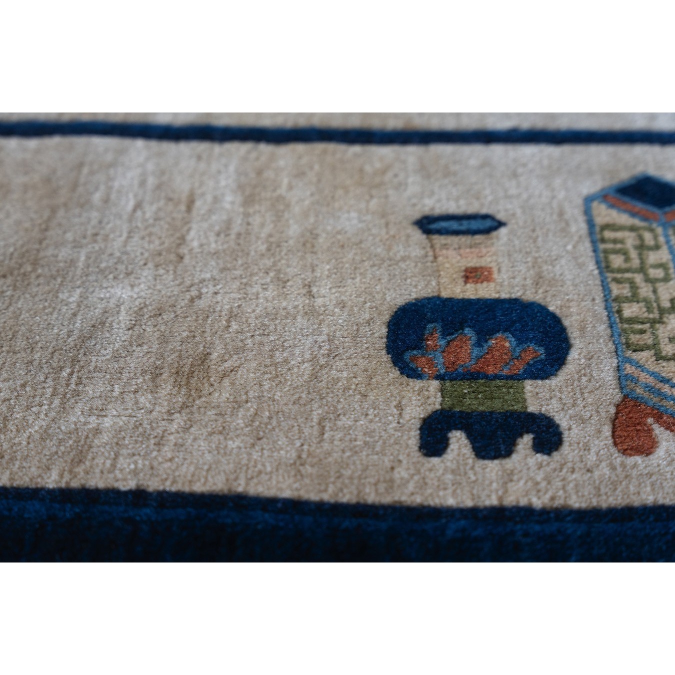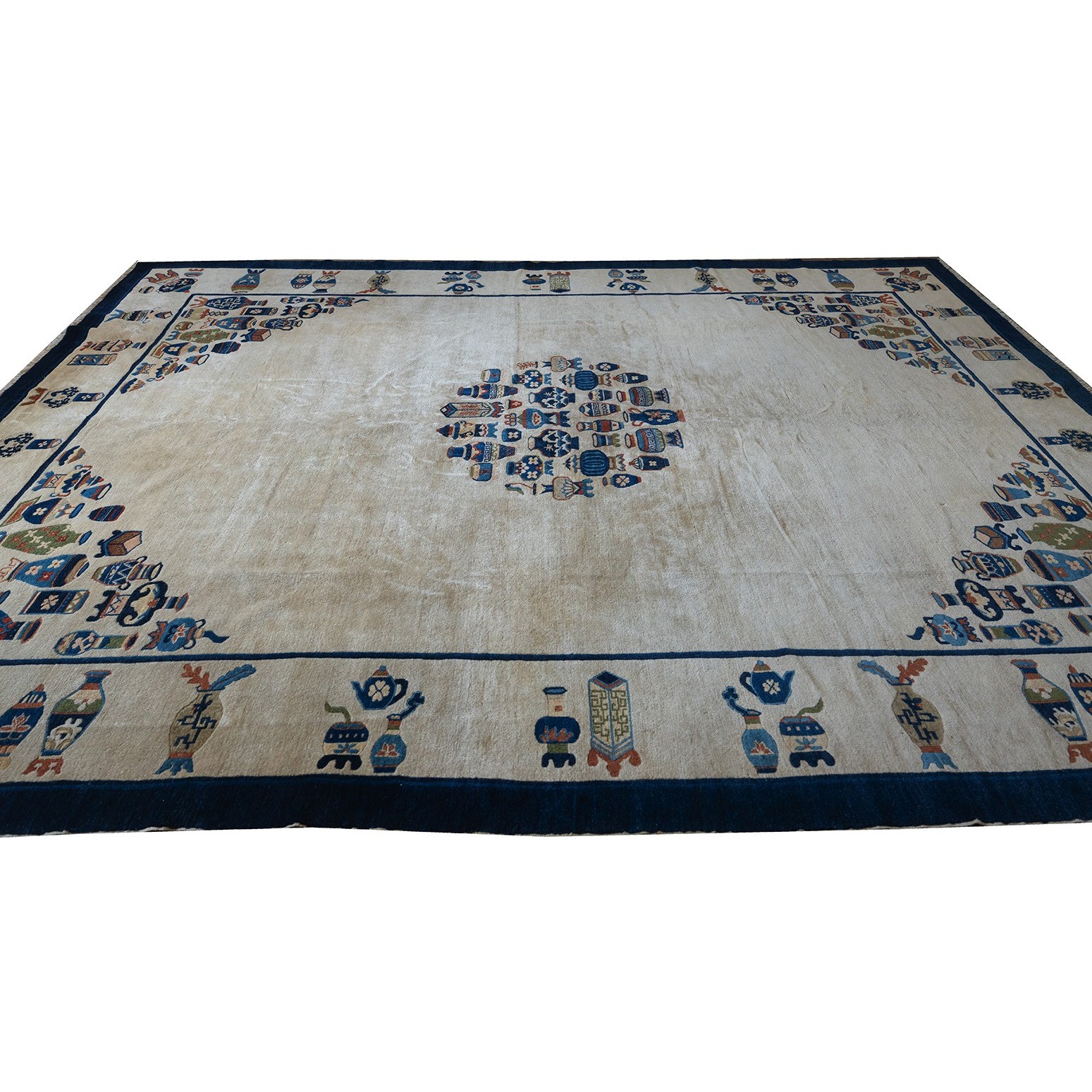 DescriptionChineseCarpets made in China proper. See entries Ningshia, Peking, Art Deco. Chinese - PekingThe commercial Peking carpet is a later 19th century development, begun by importing weaves from Ningshia (see entry) to create and export industry aimed at Western markets. The foundation is cotton and the pile is a good quality carpet wool which takes dyes particularly well. The neat medium weave is in Persian (asymmetric) knots. Designs are strictly Chinese and the whole motif repertoire of Chinese art is employed. Blue and white is the most popular color combination and red is particularly rare. Sizes tend to 9 x 12 and larger, and few small pieces appear. For a short time in the early 1920s Persian designs were woven to capitalize on the death of new Iranian goods. The industry decimated by the Communist Revolution relocated to the Pearl River area. There is a good supply of antique carpets at reasonable prices. | |