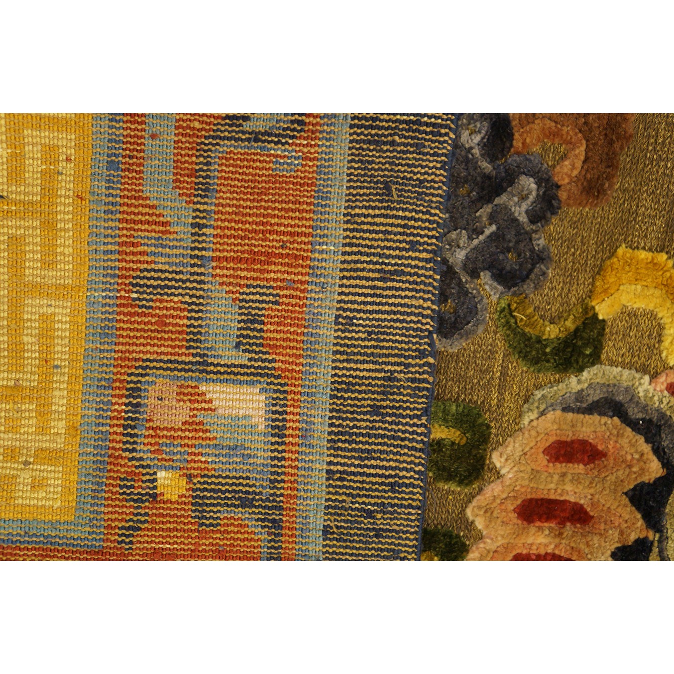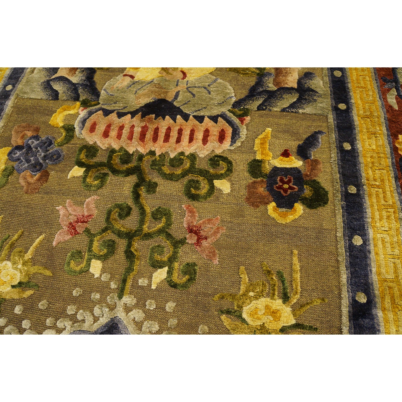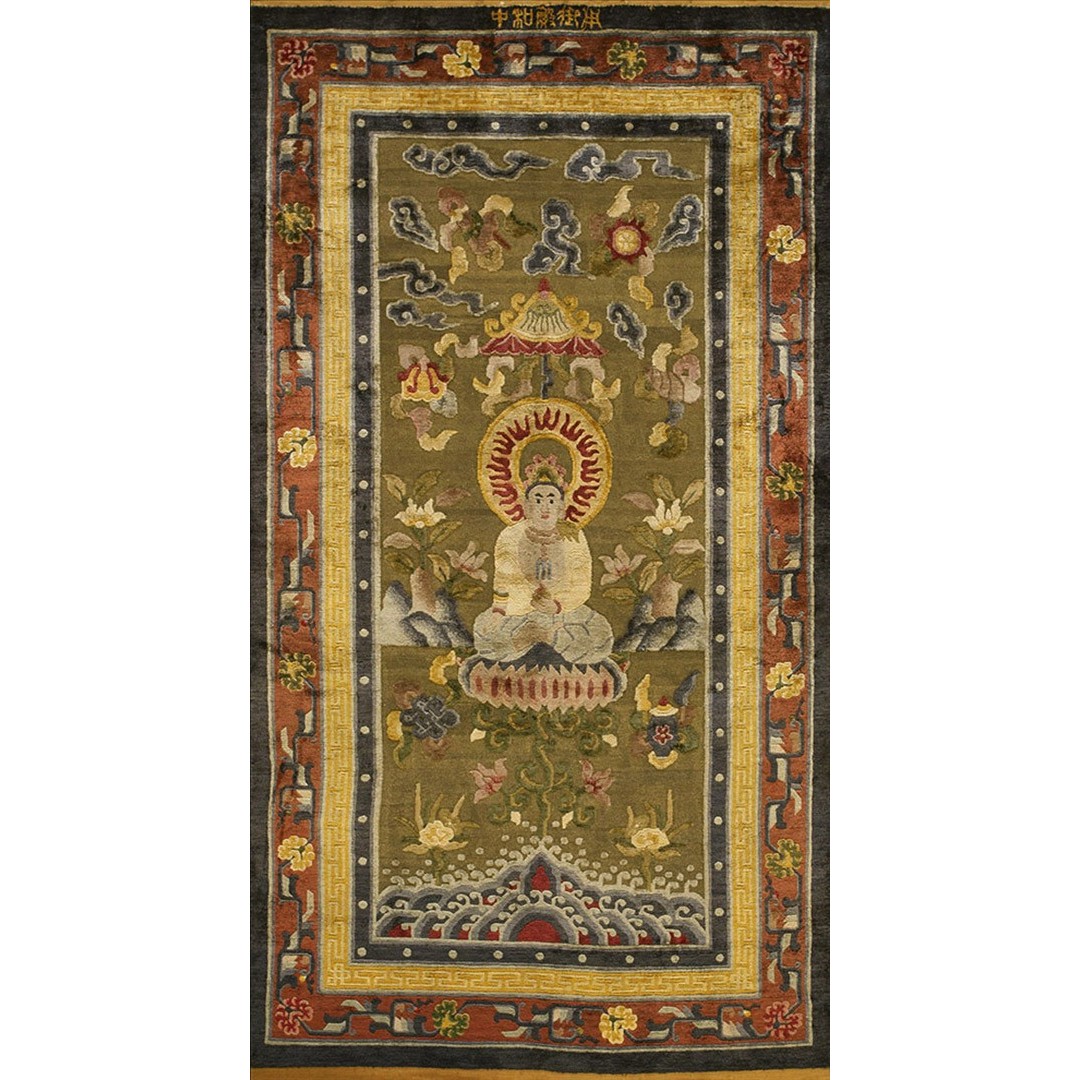 Most of the silk and metal thread rugs, ostensibly, according to their inscriptions, made for the Imperial palaces in the Forbidden City, display five writhing, scaly dragons, one central and full face, the others more in profile in the corners, all executed in knotted silk pile on flat-woven gold grounds This one, in perfect condition, shows a meditating Buddha with an enormous flaming halo, seated in a Lotus Position, between stipple shaded rocky mounds displaying irises/ peonies. Above is an umbrella signifying royalty, and scattered about are cloud bands, cloud knots and precious objects including: a cord knot, vase, wheel and scroll (?). At the bottom of the field is a scalloped and frothy sea with curling surf and droplets of foam. The usual stylized mountain rising from the waves is absent, replaced by a wave peak.