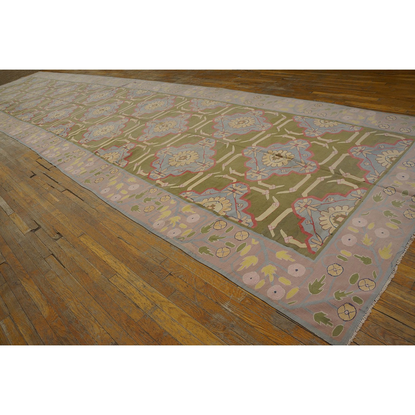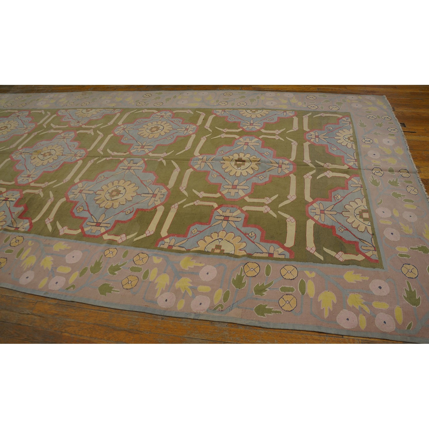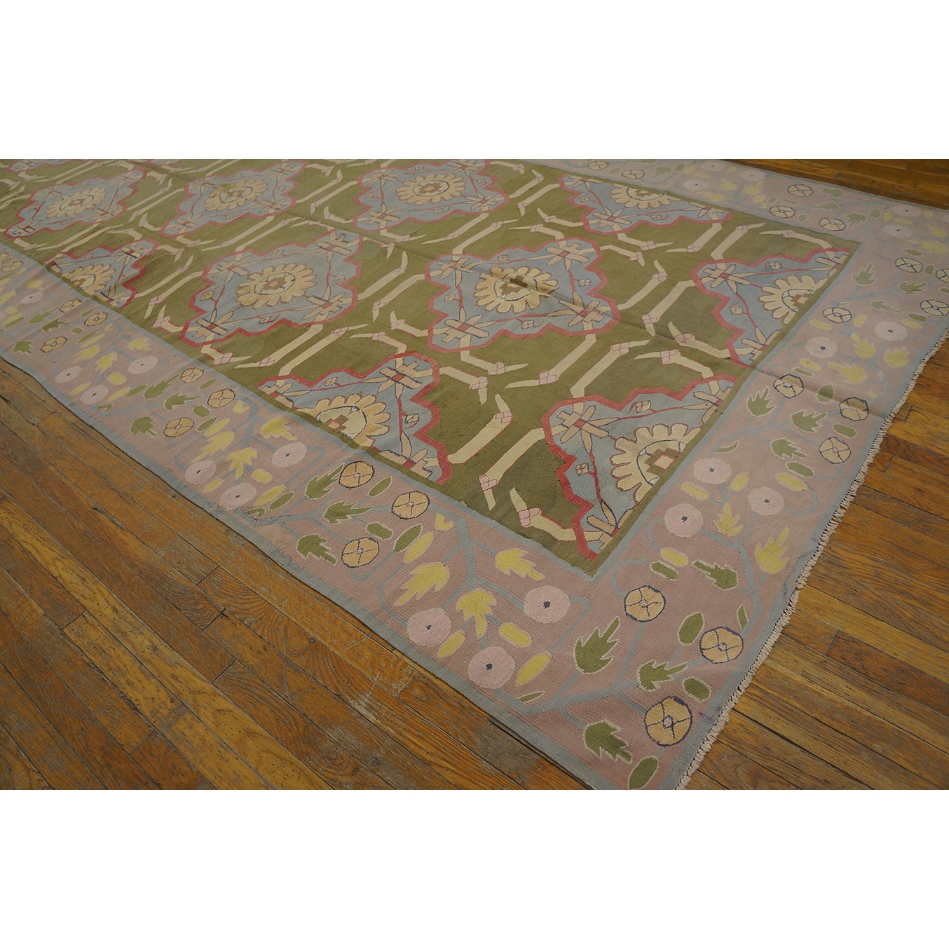 This antique all-cotton Indian flat-weave shows a grass green field with one central and two half side columns of pale blue lobed crosses with central pale salmon rosette centres, framed by a wide equally ice blue border with a bud and rosette design. An antique tapestry-woven piece in an unusual large size and in good condition.