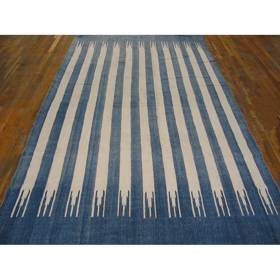 This long rug format cotton flat-weave shows eleven vertical (!) off-white stripes with split ends, all set on the delightful, denim blue ground. Clear figure/ground distinction. Vintage to antique, good condition.