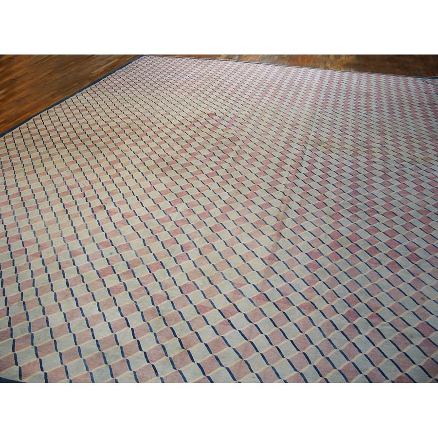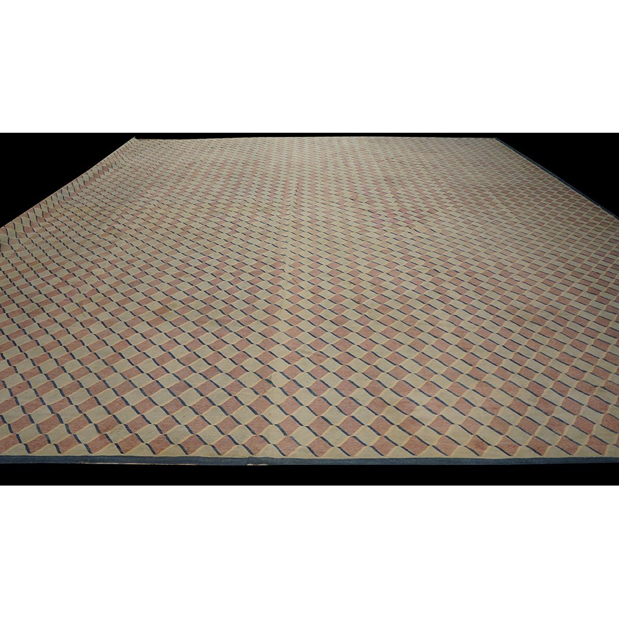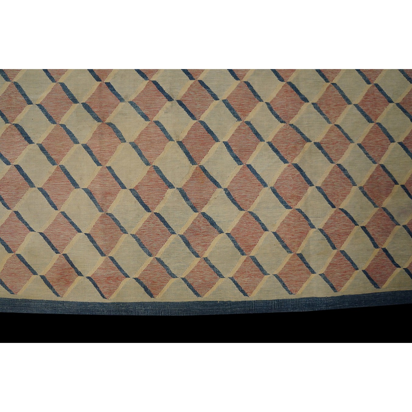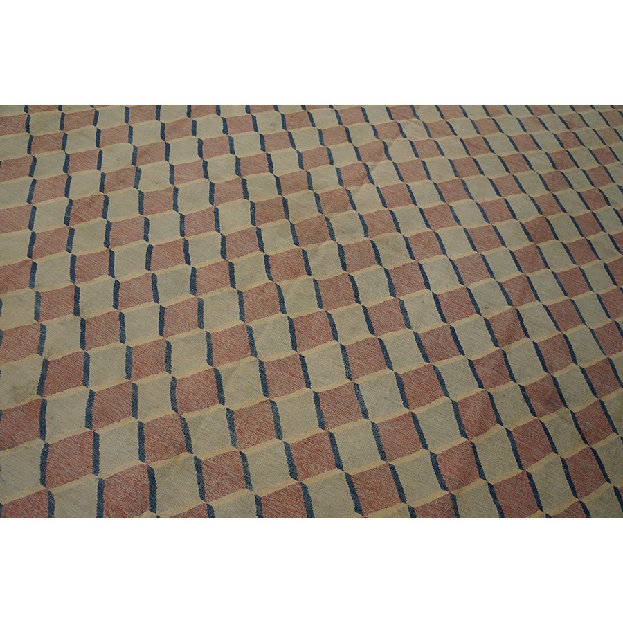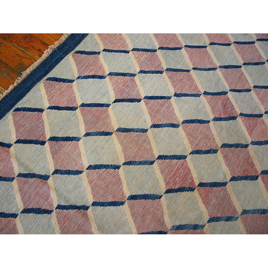 A trompe l’oeil pattern of lozenges in soft terracotta and pale green is definitely bounded by the unwashed denim indigo blue plain border. The dark blue and ecru edges of the lozenges appear to lift them out of the picture plane. Adjustable or divisible at your request. Good condition for this antique all-cotton Indian flat-woven carpet.