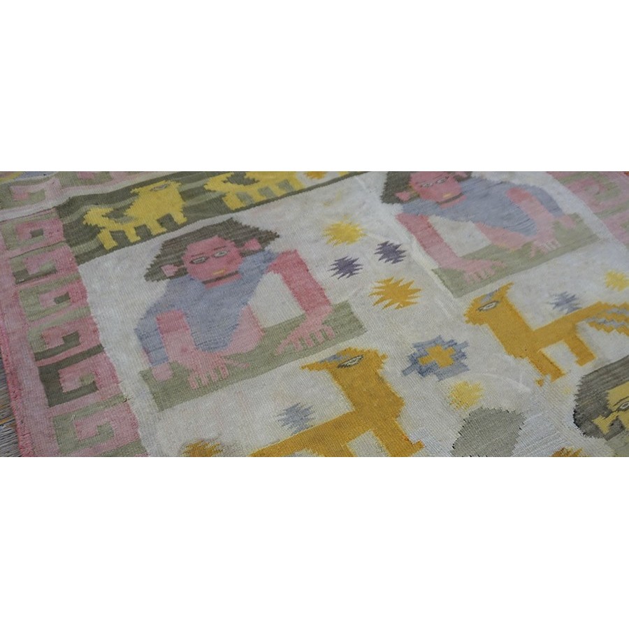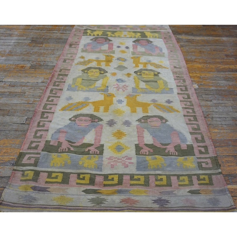 Pictorial dhurries of any age are quite rare. The sand field displays two columns each of three hands and-knees figures with peacocks (?) between, detailed in goldenrod, sky blue, brown and straw. Lions in the top border, otherwise frets on the other three. End panels decorated in ashiks and herringbone arrows. Totally unusual, perfect for a wall in a decorating scheme leaning toward the ethnic. Looks South American. Good condition unique antique.