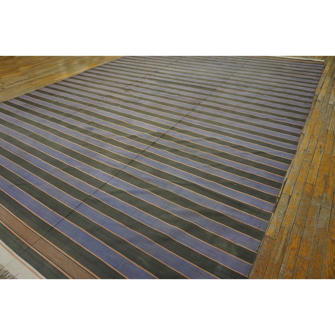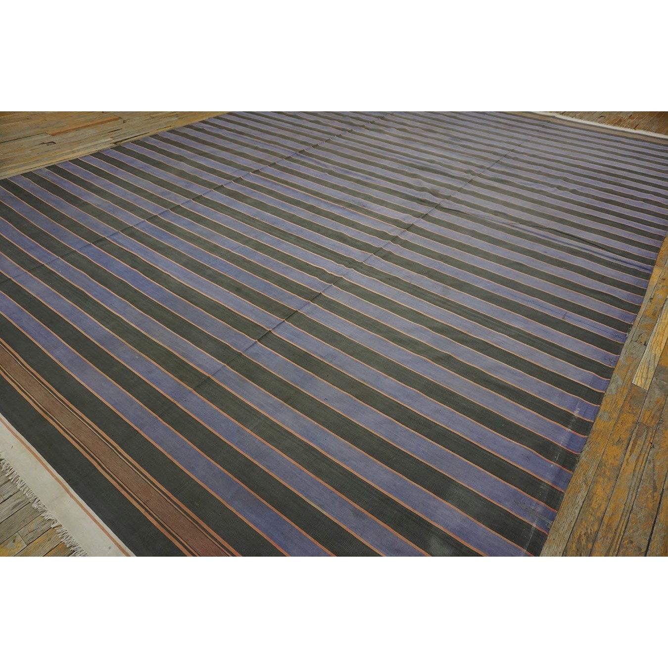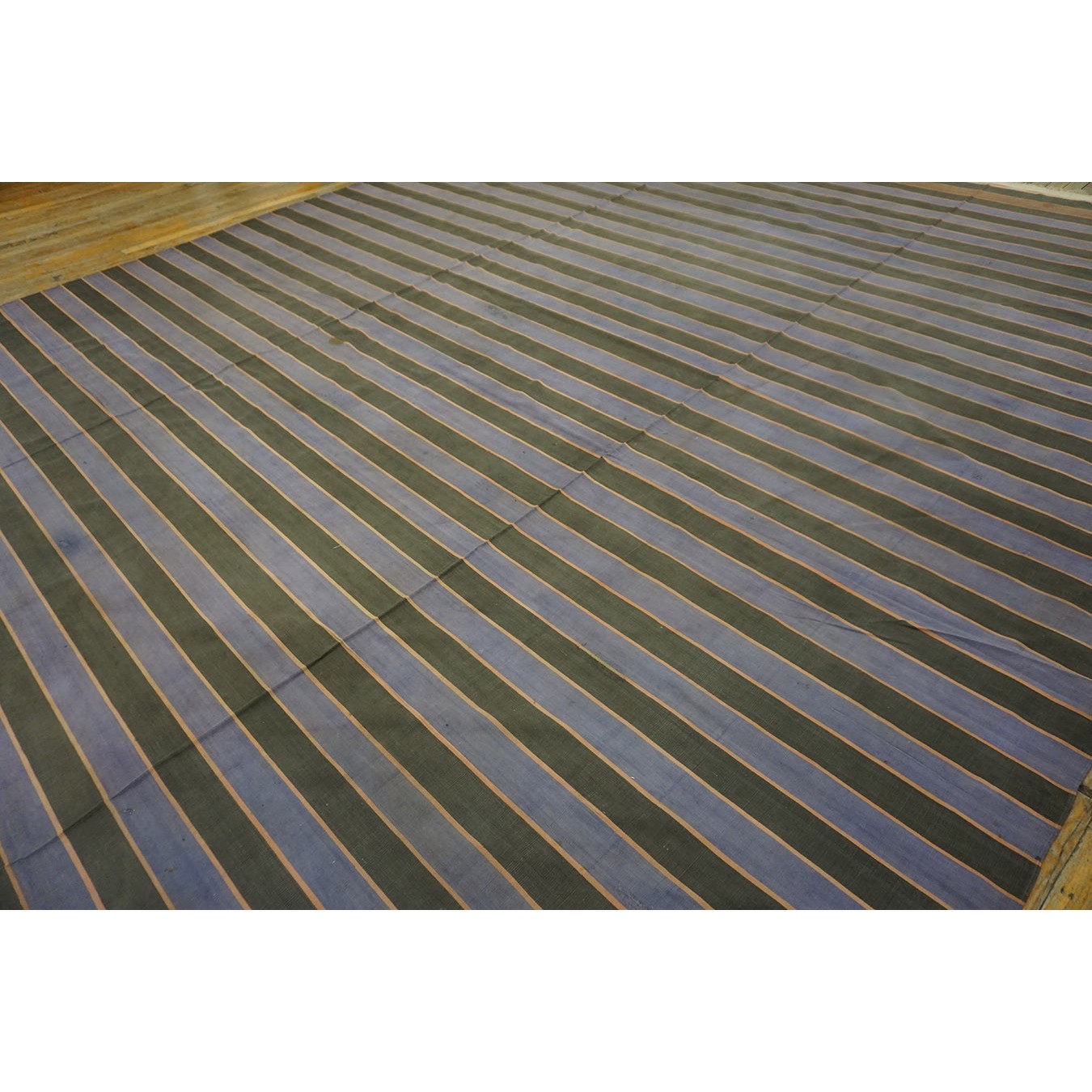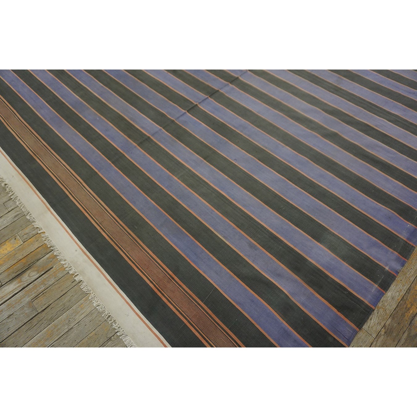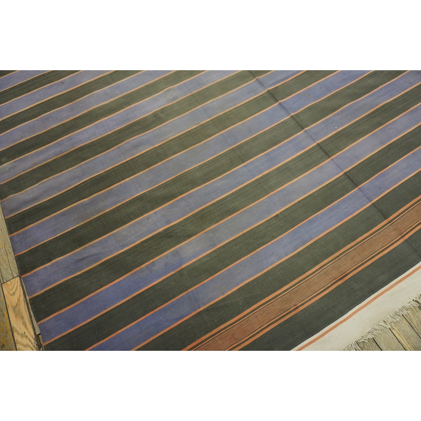 Not blue and white, but purple and light blue with an eggshell strip finishing the side-to-side banded pattern at each end. Any shade of purple is unusual for a Dhurrie and we are lucky to have this room sized example. This is a good condition antique piece ready for immediate use of careful modification.