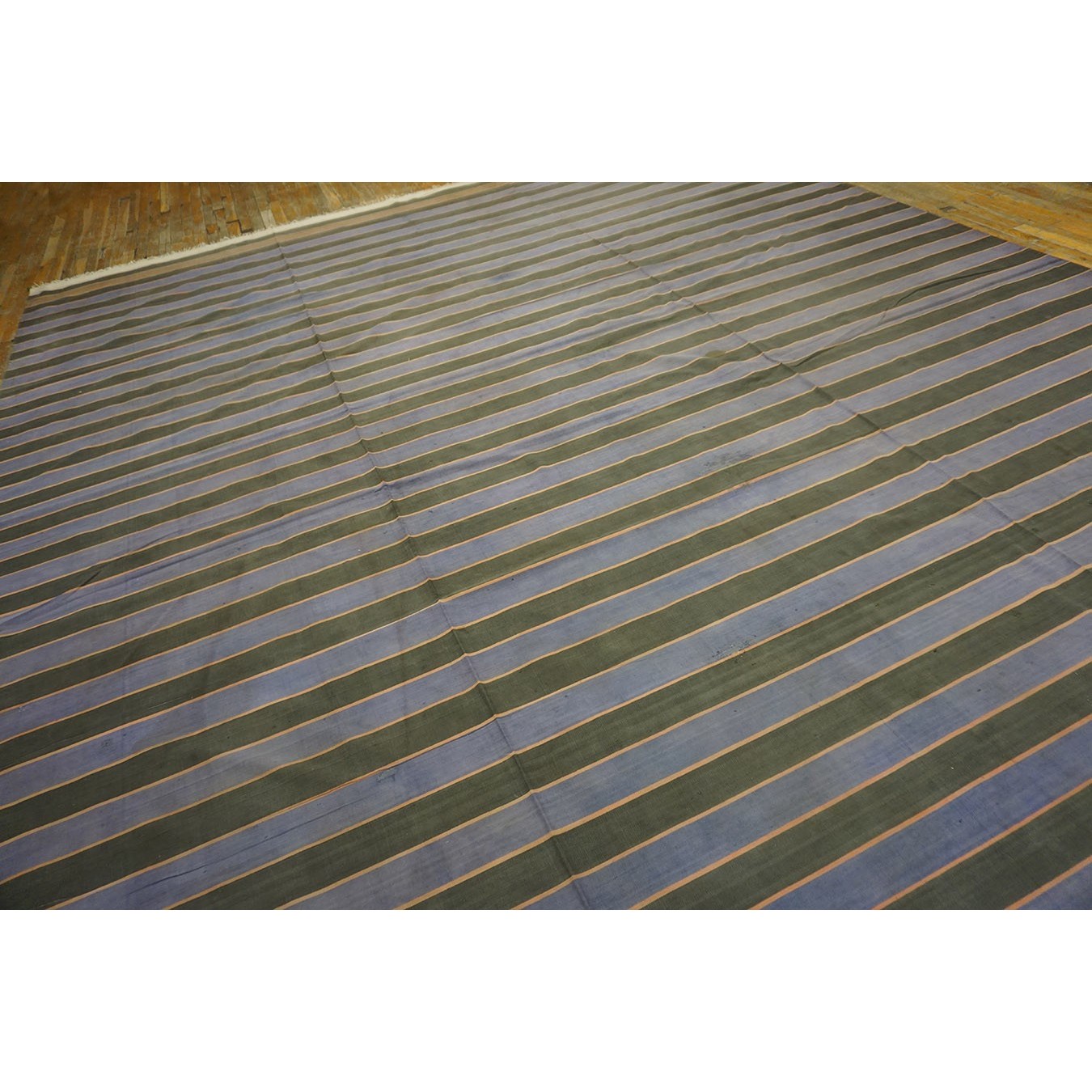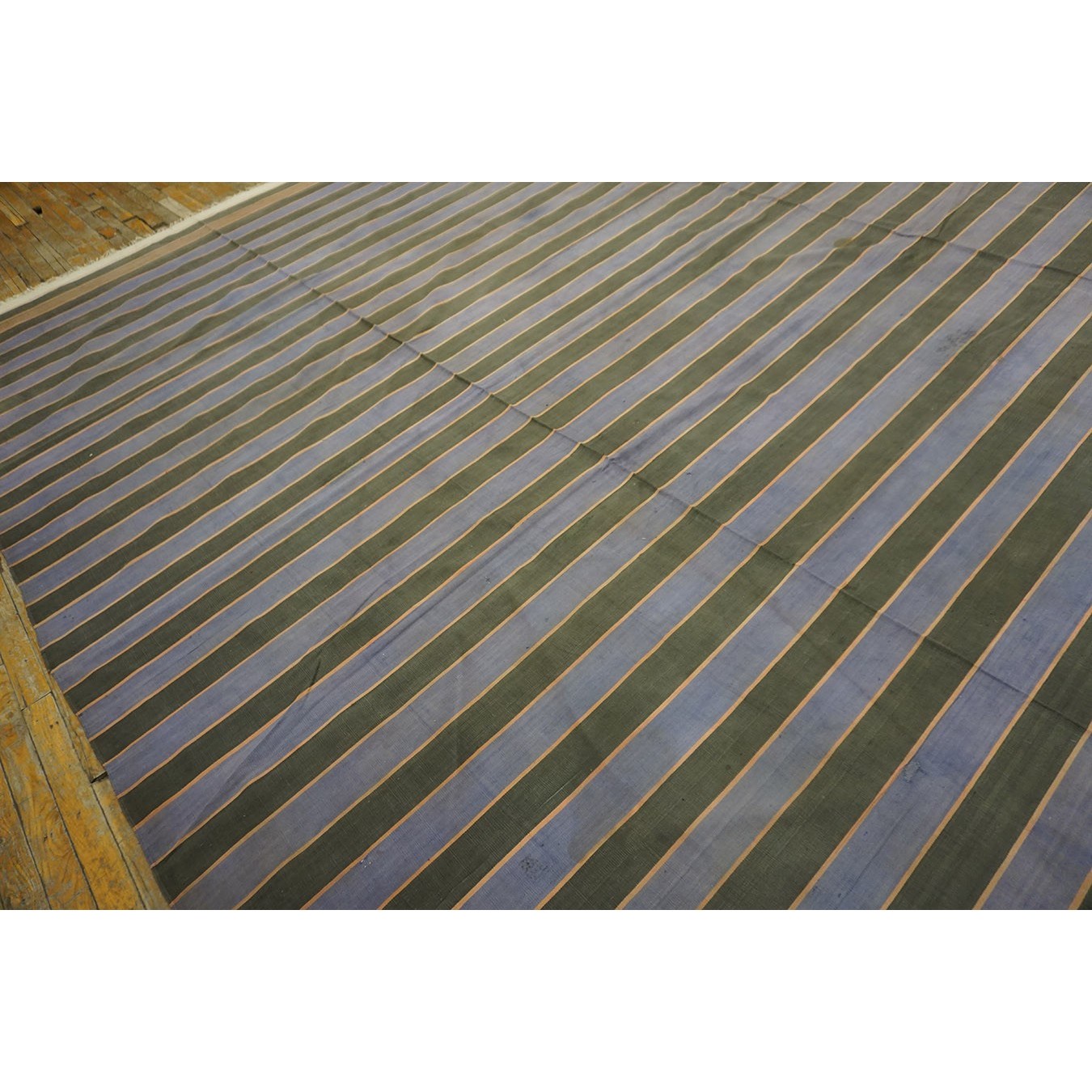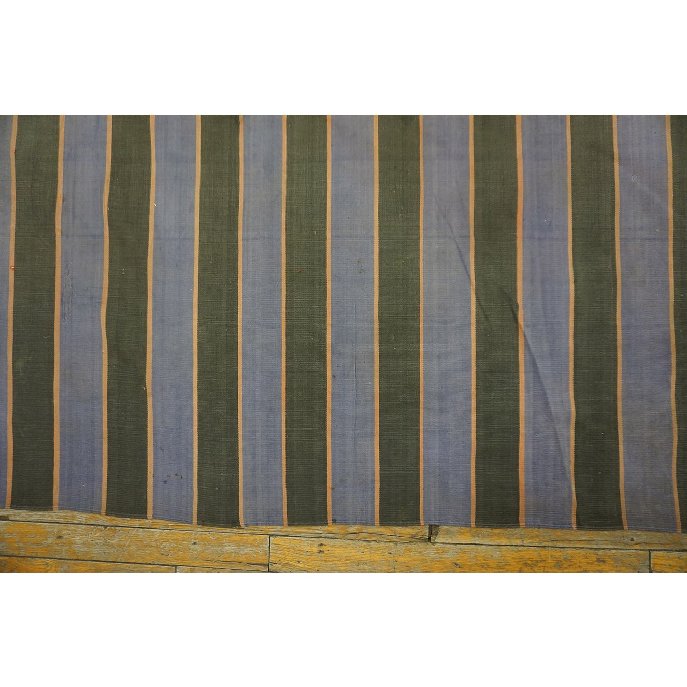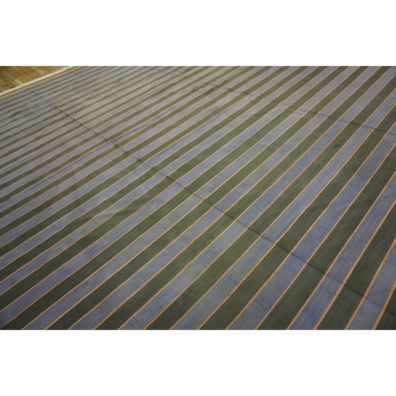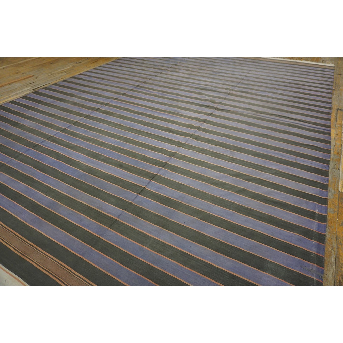 Not blue and white, but purple and light blue with an eggshell strip finishing the side-to-side banded pattern at each end. Any shade of purple is unusual for a Dhurrie and we are lucky to have this room sized example. This is a good condition antique piece ready for immediate use of careful modification.