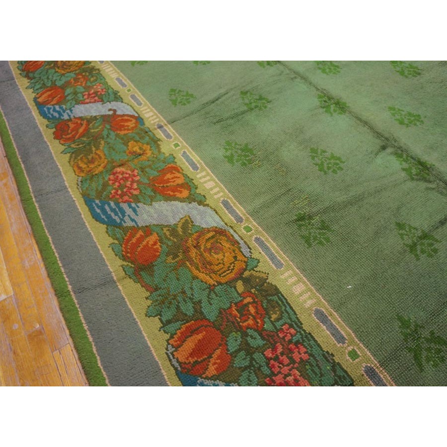 The Irish Guiness green field shows a widely spaced one way small red flower allover pattern. Although many Donegals show distinctly Celtic or Oushak designs, this example is more in the French Savonnerie manner. The unusual main border is quasi-three-dimensional, with a ribbon guillotine around a red and green rose and leaf continuous bouquet. The pile is lush and deep, with symmetric (Turkish) knots on an all-wool foundation.