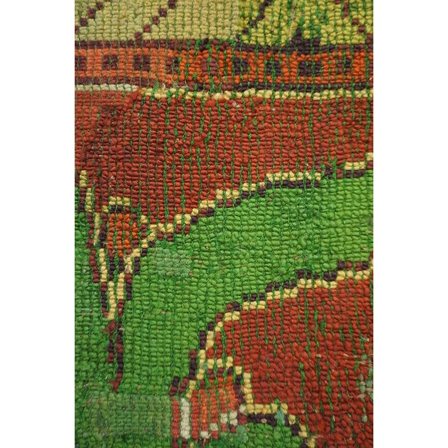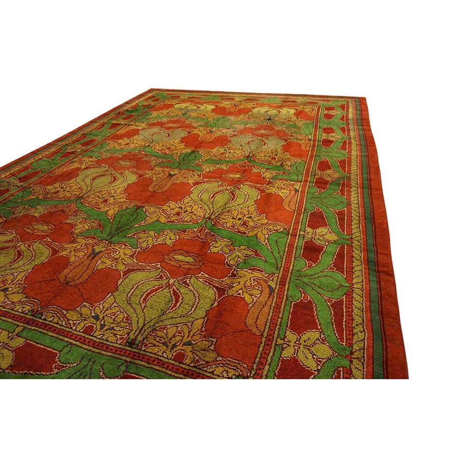 This is one of the most attractive of the Donegal Arts and Crafts carpets, the “Donnemara” here with a barely visible rust ground overlaid with three full and two partial lateral columns of fleshy, stenciled, compound palmettes. Turkish-style tulips adorn the central and side axes. Onion-style leaves support the red “batwing” palmettes in the two adjacent columns. The green border shows lotus palmettes controlled by a thick, plain strapwork arabesque. The style overall is neither Celtic Revival nor Oushak takeoff. The design is unidirectional. As in all Donegal weavings, they were executed by local women on vertical wooden looms, using local wool. A cartoon must have been necessary at the start, but the weavers quickly got the hang of it. This particularly large carpet probably took a team of five weavers six of seven months to complete. There are four distinct colourways known, And the sixes may vary with three pattern repeats. The Donnemara was retailed exclusively by Liberty of London. Any surviving carpets, no matter their present locations, must have initially passed through Liberty. Unlike the Oushak-style Donegals, the pattern is more textile-like and the field is almost entirely covered. This connects it more to the Morris Arts and Crafts tradition rather than to a historizing Celtic/Anatolian trend. Here there is no attempt at shading or layering of pattern, everything is flat, two-dimensional and without depth. The Donnemara type is one of the several designs woven exclusively for Liberty. All share this wall-paper style of drawing. The pile is thick and the rug is in good condition with no visible repairs.
