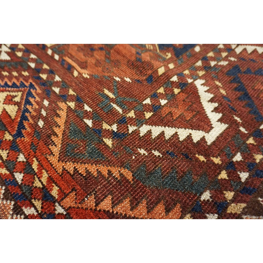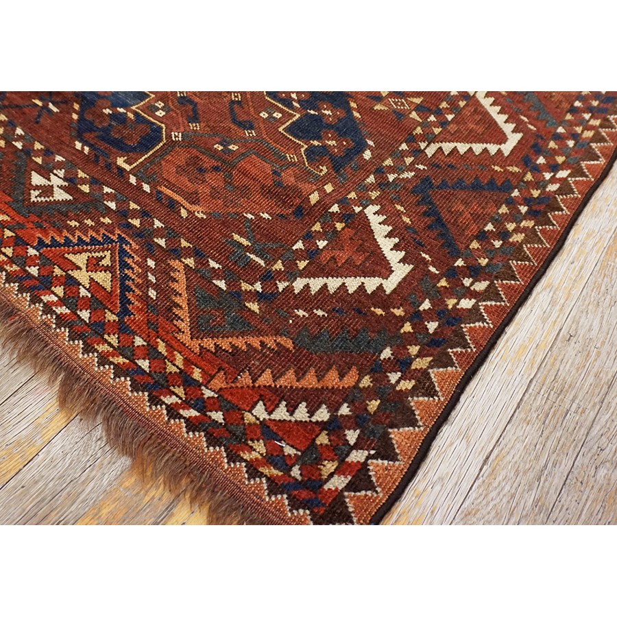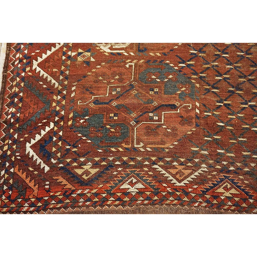 The brick ground is closely covered by a lattice of ivory and dark blue which flows easily around three columns of characteristic Turkoman nomadic guls in ivory, apricot and dark blue. The white zig-zag of the main border is particularly appealing as a frame. The background pattern of the field is particularly rare for Ersari Afghan carpets.C.1860