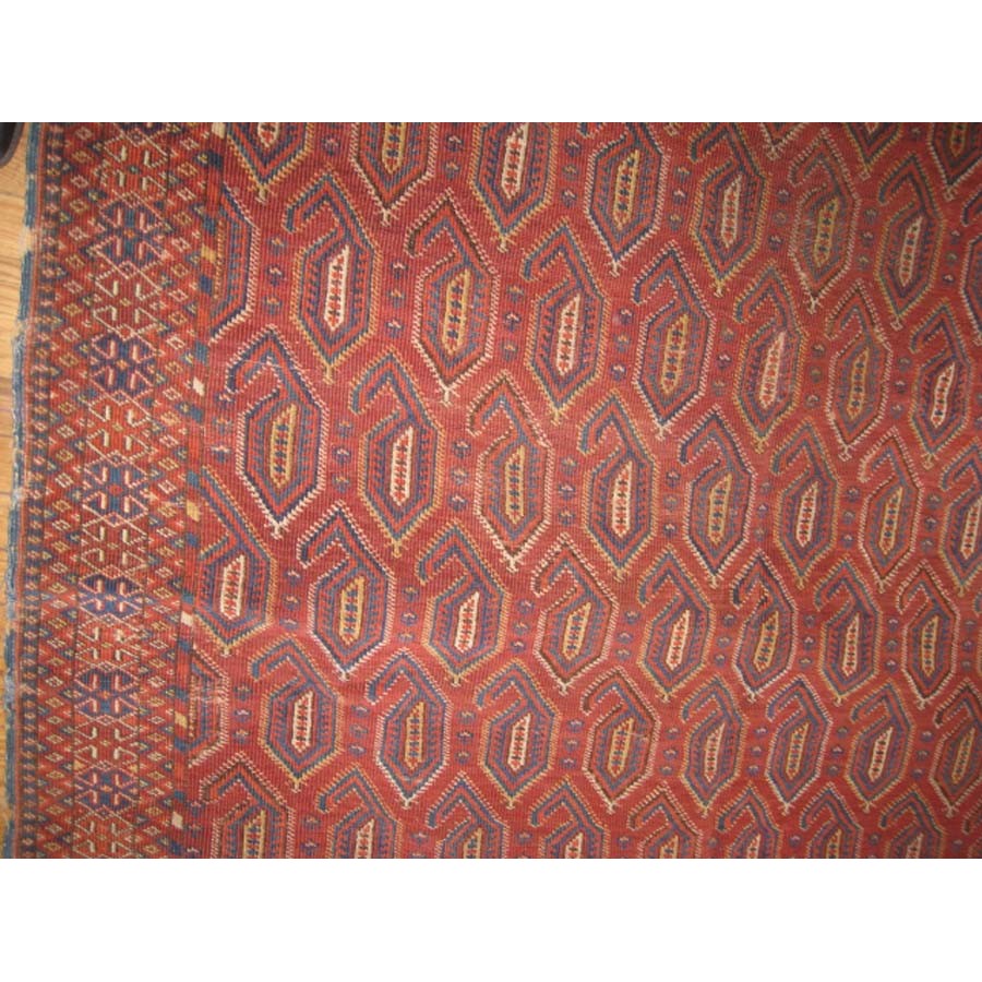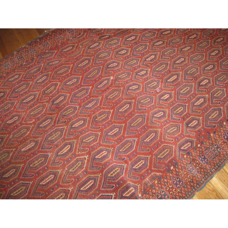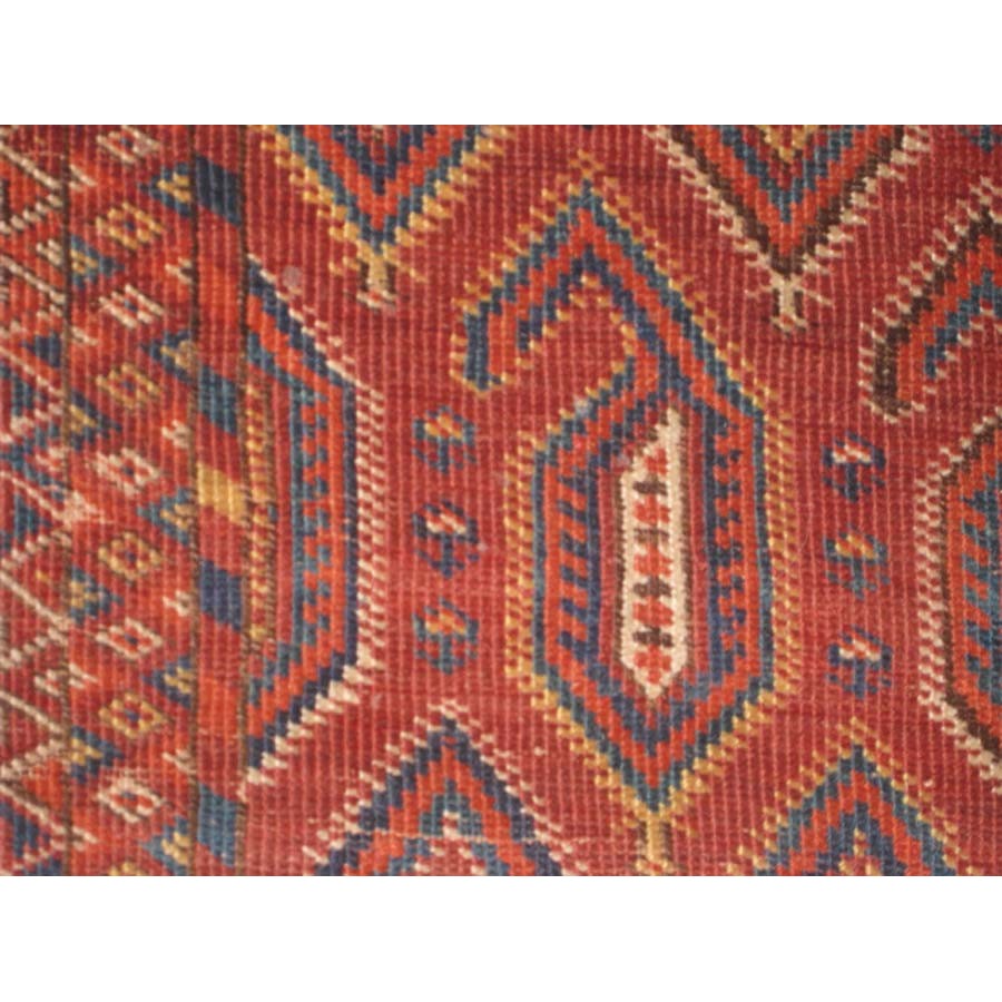DescriptionErsari - BeshirAll Beshirs are the work of the Ersari tribe along the Oxus River in what is now Uzbekistan, once the Khanate of Bokhara. Carpets tend to be long and narrow with semi-geometric designs or motives adapted from traditional Persian overall patterns. The ground color is a bright, clear red accented with yellow and blue. Too large for tribal use, they were made for houses and public buildings in and around the cities of the Khanate. All the good ones are 19th century. | |
