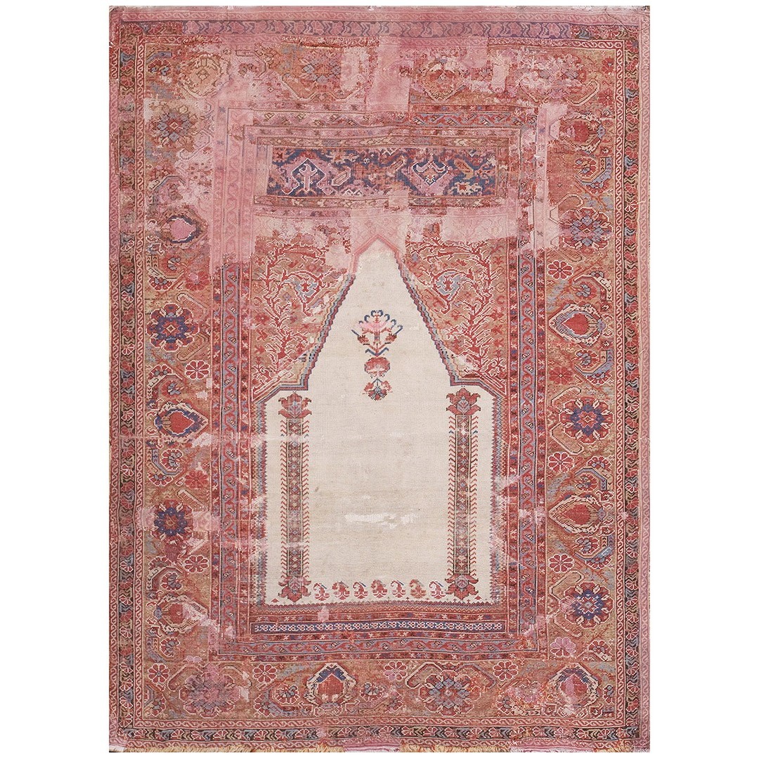 DescriptionGhiordesThe town of Ghiordes in Western Turkey has been making rugs for most of 4 centuries. Best known and most desirable are the finely knotted prayer rugs, often with open fields in blue, green, red or ivory, in weaves up to 250 knots per square inch. These are all 18th century and a few early, non-prayer format larger carpets are known. In the 19th century the weave became coarser and large carpets up to 25 square were woven for commercial sale. The type was most popular among collectors in the early 20th century and has recently become of interest to the connoisseur. | |