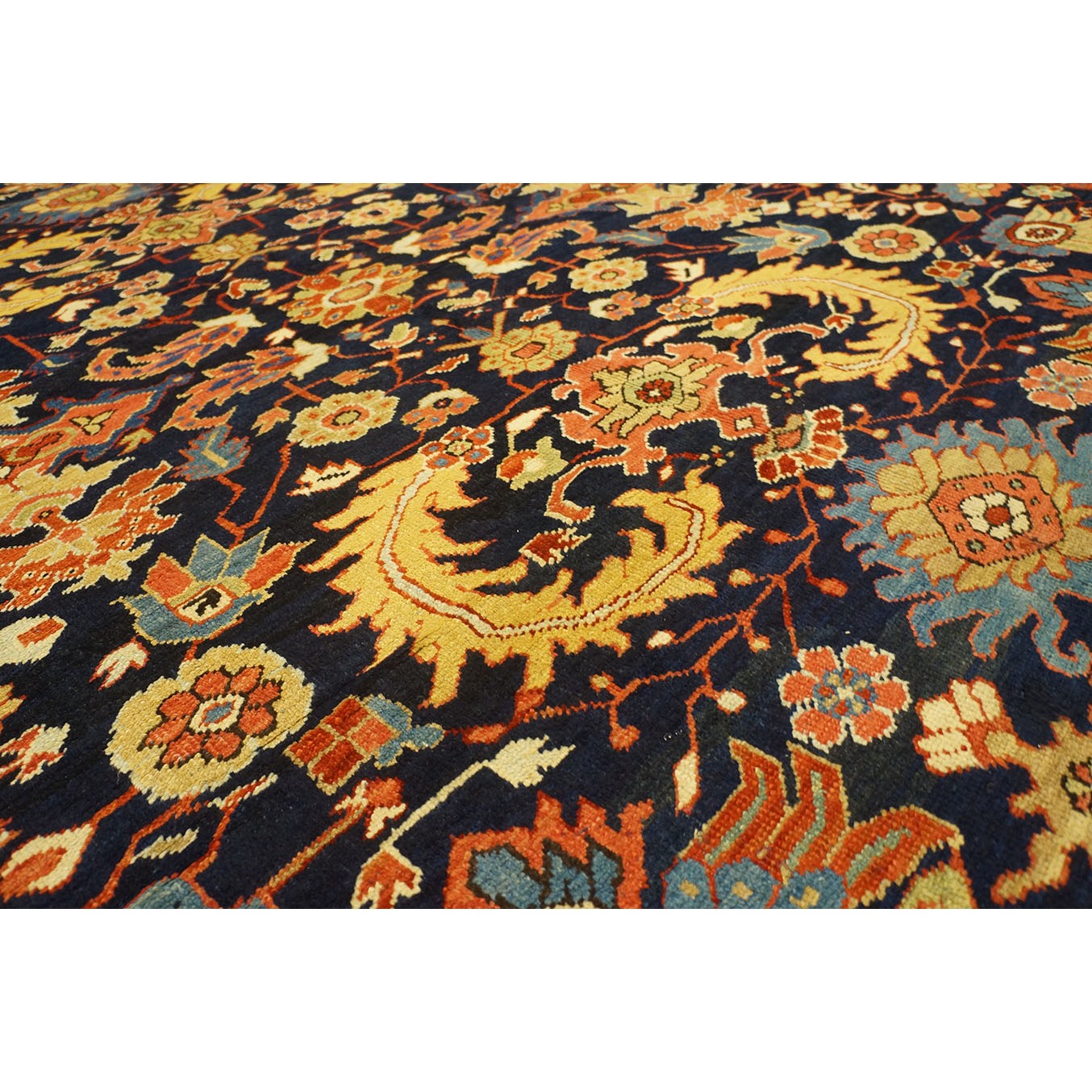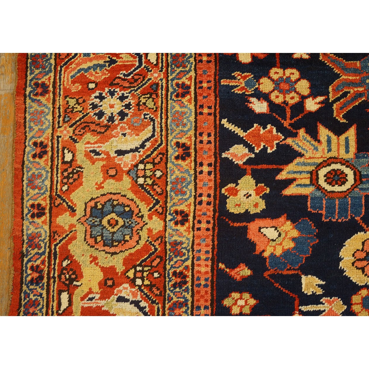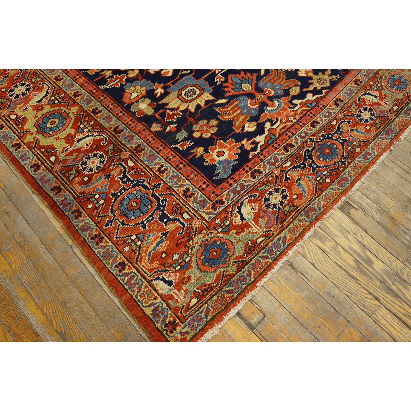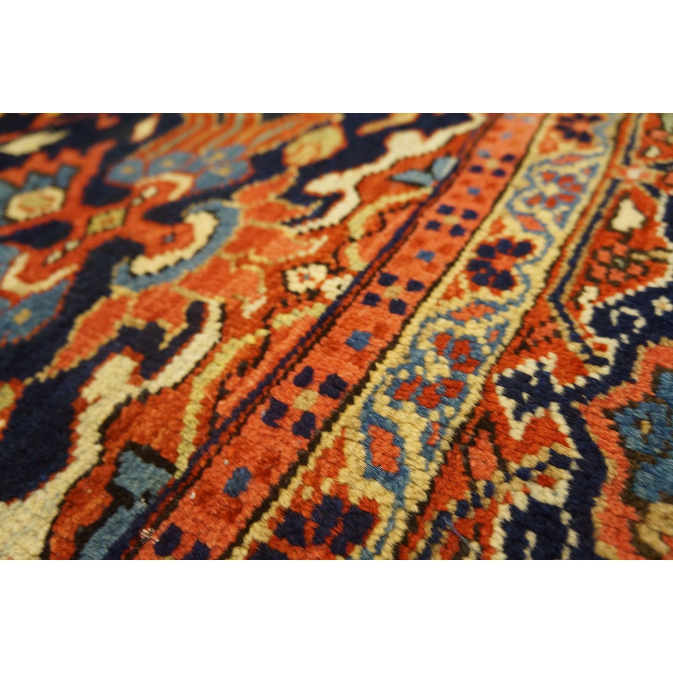 Although the majority of Heriz carpets from northwest Persia are in medallion styles, this example employs essentially an overall pattern of large lancet leaves, palmette assemblages and a colorful assortment of rosettes and geometric ornaments. This c.1910 carpet is moderately coarse in weave on an all cotton foundation with naturally sourced colors.