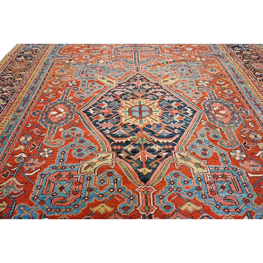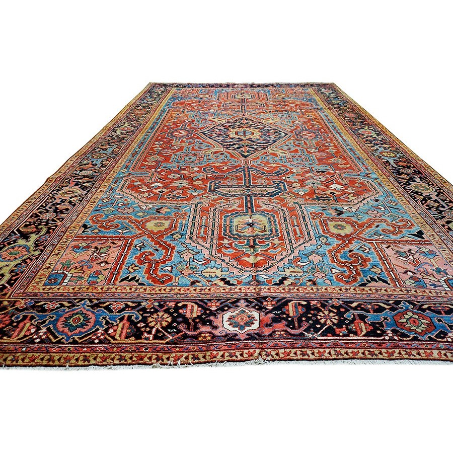 DescriptionHerizThe Heriz area in northern Azerbaijan Province (Iran) makes semi-geometric, strongly colored carpets in a variety of sizes from 2 x 3 up to 15 x 26, usually in medallion design, but formerly in a wide range of overall or centralized layouts. The area has been active for at least two centuries, with production expanding greatly in the late 19th century. Weave is medium to quite coarse but the dyes are excellent and vibrant. Silk rugs were made there in the 19th century, but production ceased by 1910. The Heriz carpet has been the most consistently popular and affordable oriental available for western consumption. | |