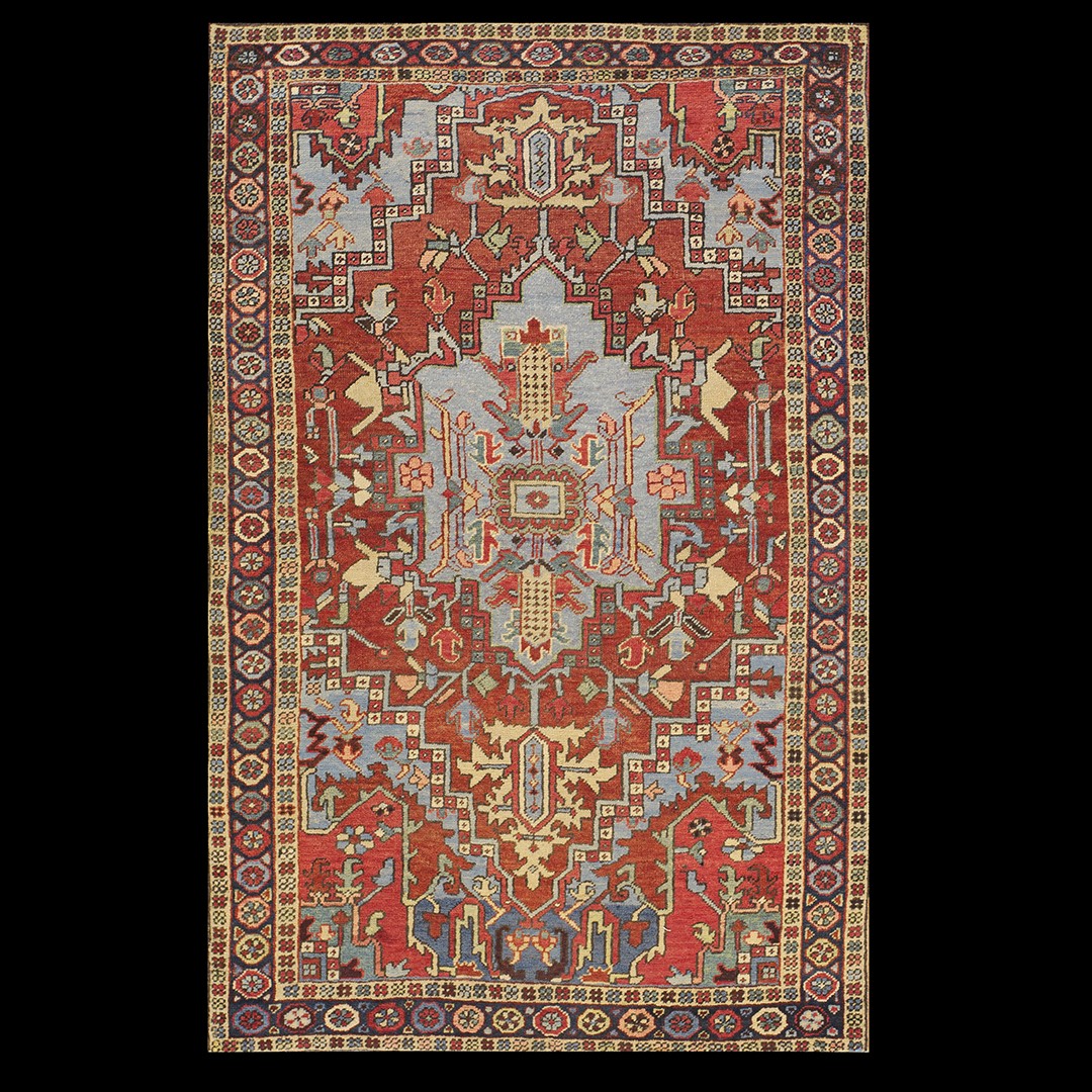 DescriptionHerizThe Heriz area in northern Azerbaijan Province (Iran) makes semi-geometric, strongly colored carpets in a variety of sizes from 2 x 3 up to 15 x 26, usually in medallion design, but formerly in a wide range of overall or centralized layouts. The area has been active for at least two centuries, with production expanding greatly in the late 19th century. Weave is medium to quite coarse but the dyes are excellent and vibrant. Silk rugs were made there in the 19th century, but production ceased by 1910. The Heriz carpet has been the most consistently popular and affordable oriental available for western consumption. | |