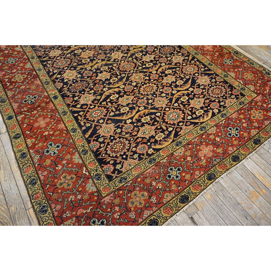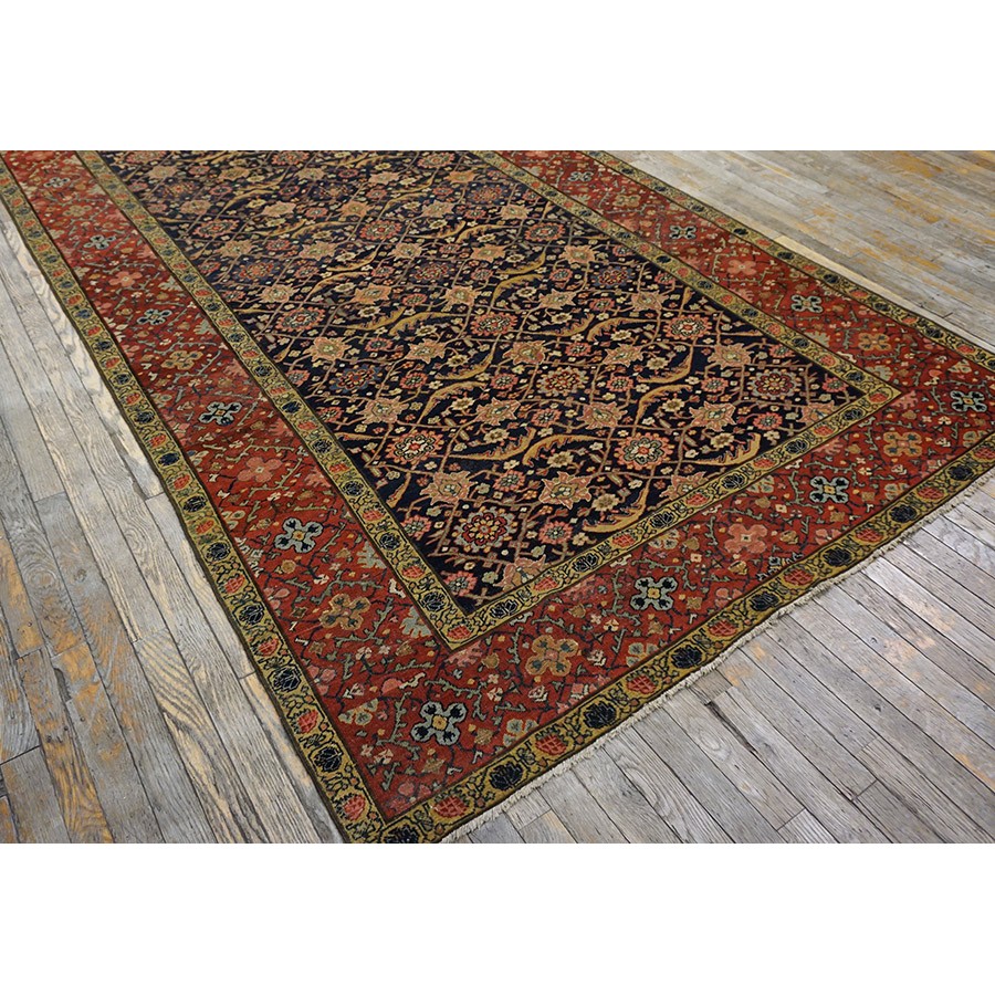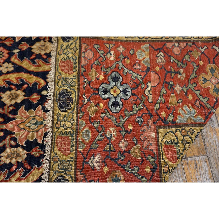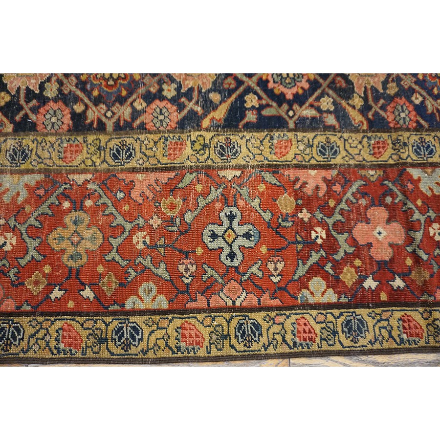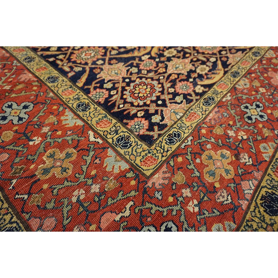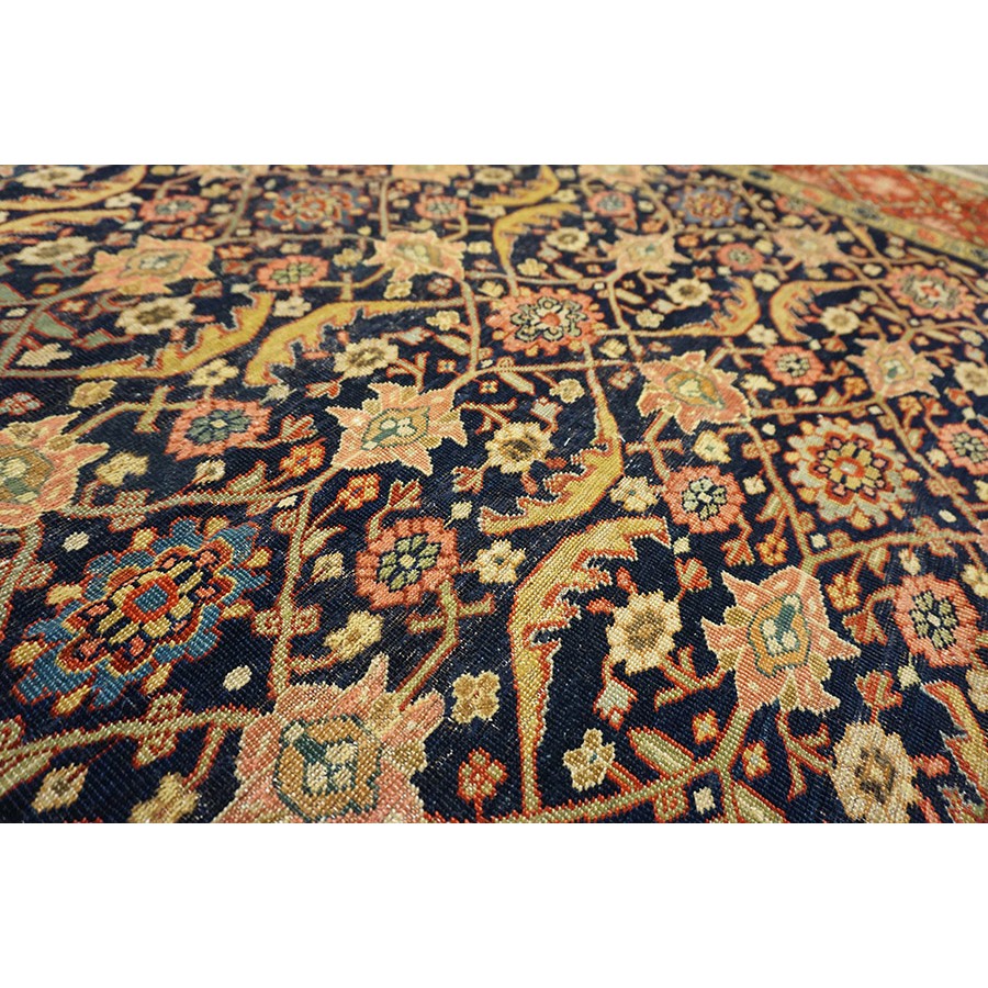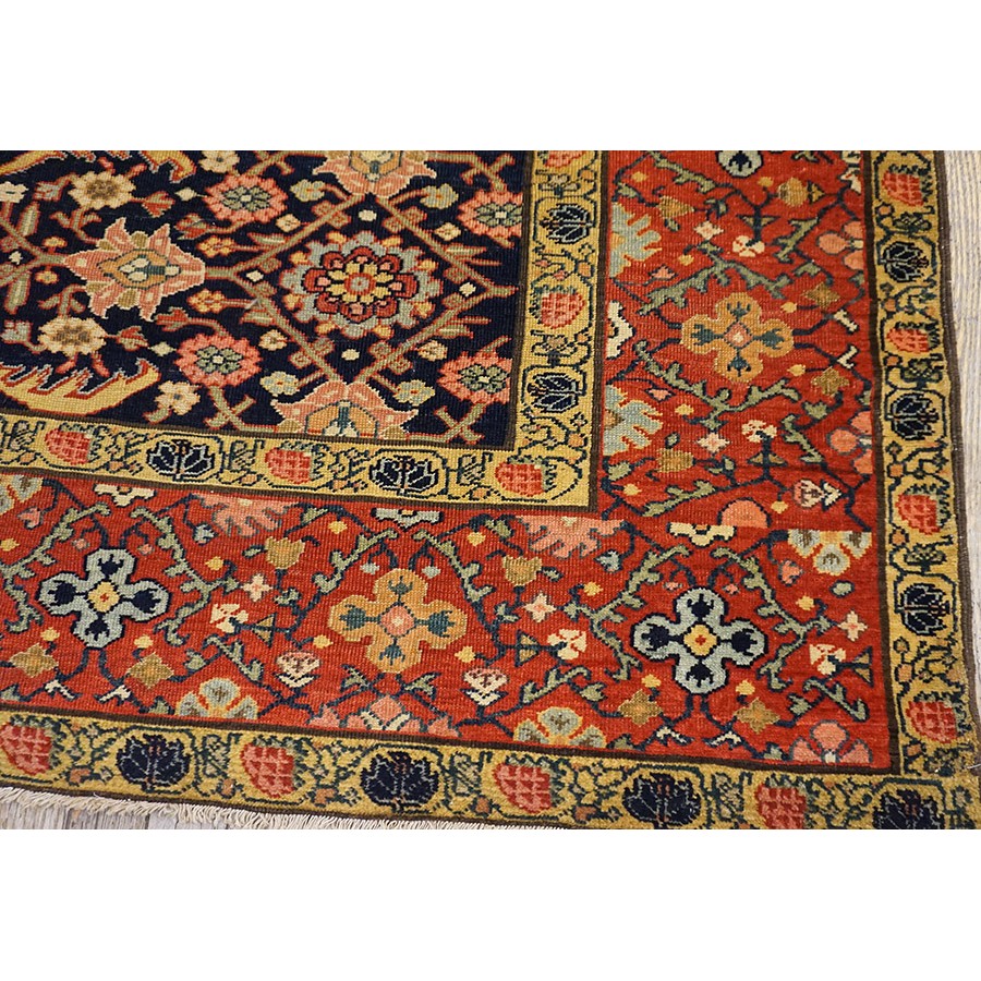 We have, for convenience’s sake, grouped other, comparable Southwest Persian weaving with the Ghashgaie. This early piece, c. 1800, represents high quality tribal work does in the urban style. The perfectly balanced herati pattern on a deep blue ground is framed by a red quatrefoil rosette and thin leaf pattern. The pile is low, the weave is very fine on this important survivor from as virtually unknown period of Persian rug weaving.
