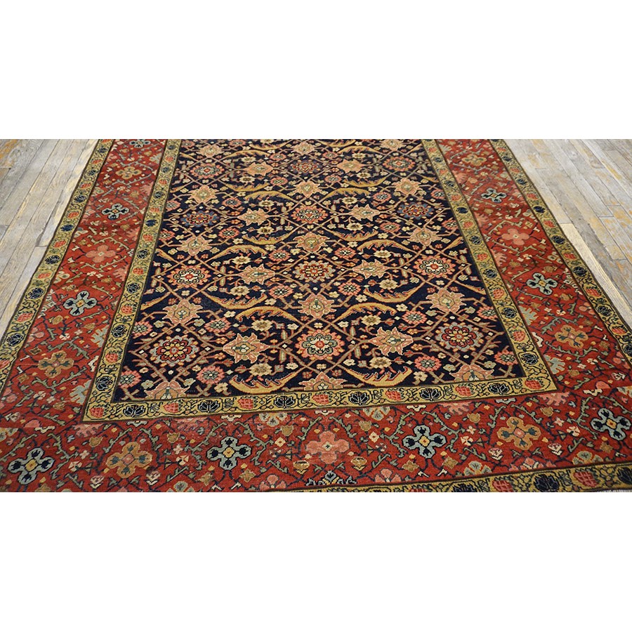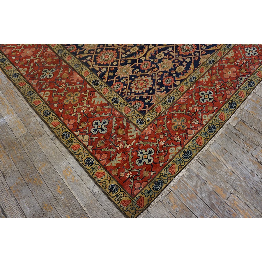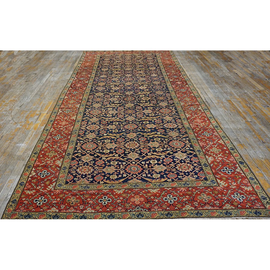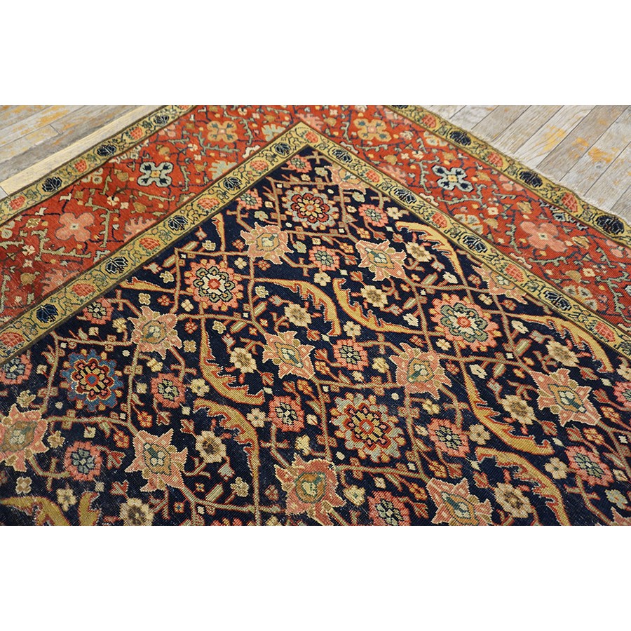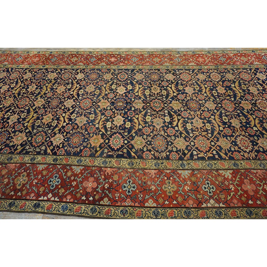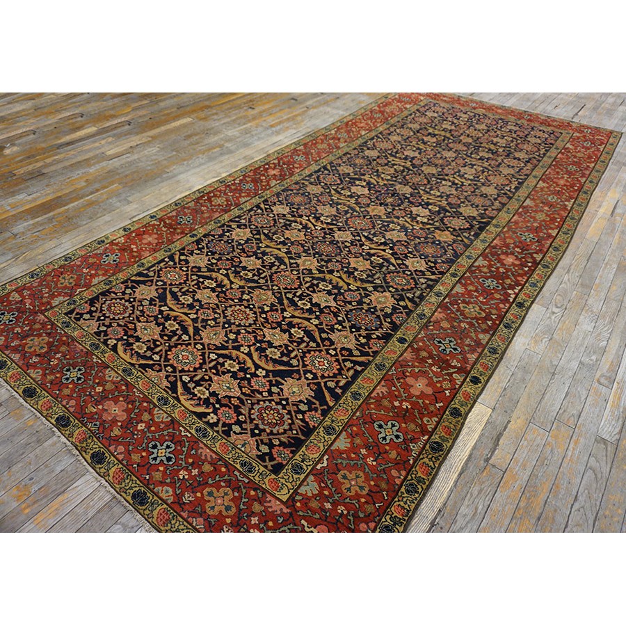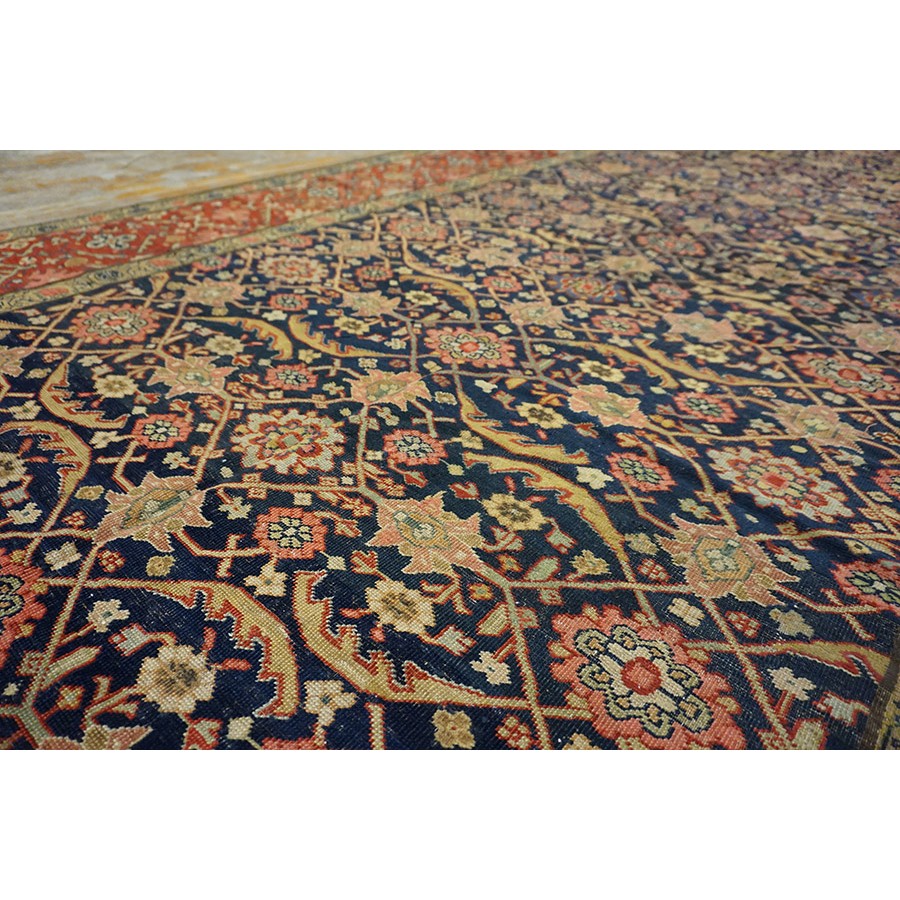 We have, for convenience’s sake, grouped other, comparable Southwest Persian weaving with the Ghashgaie. This early piece, c. 1800, represents high quality tribal work does in the urban style. The perfectly balanced herati pattern on a deep blue ground is framed by a red quatrefoil rosette and thin leaf pattern. The pile is low, the weave is very fine on this important survivor from as virtually unknown period of Persian rug weaving.
