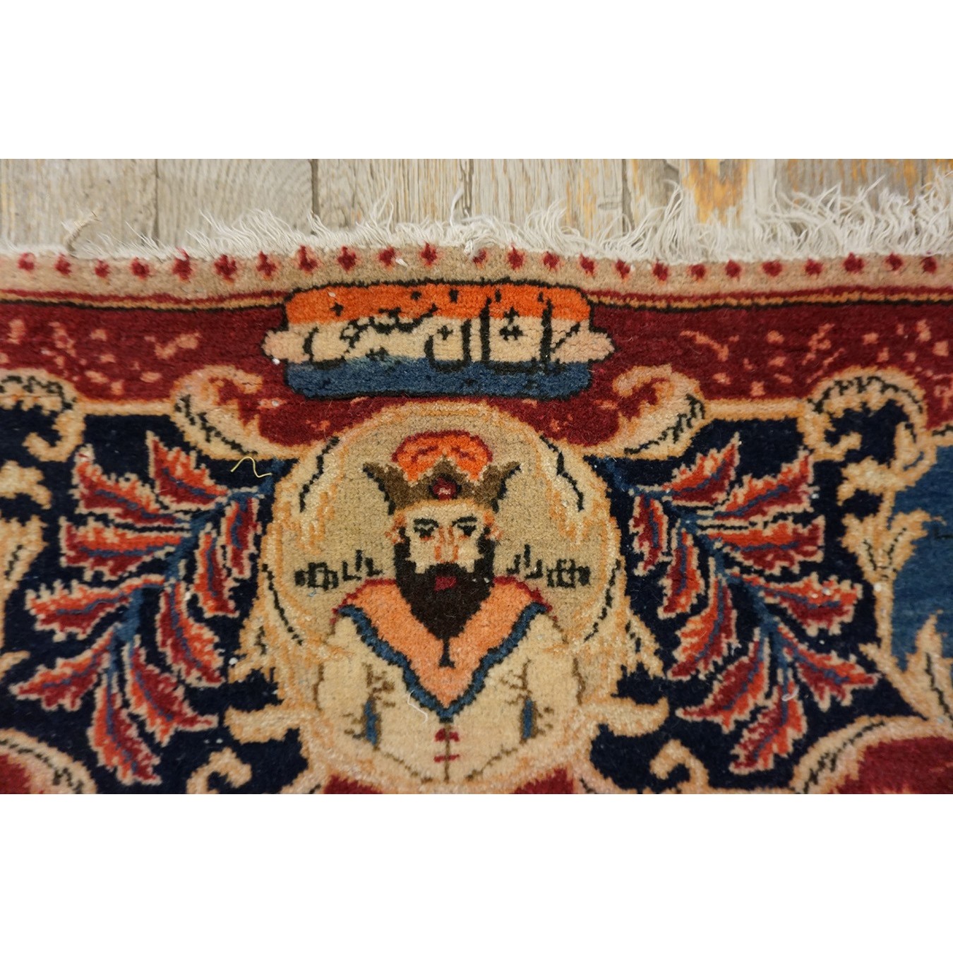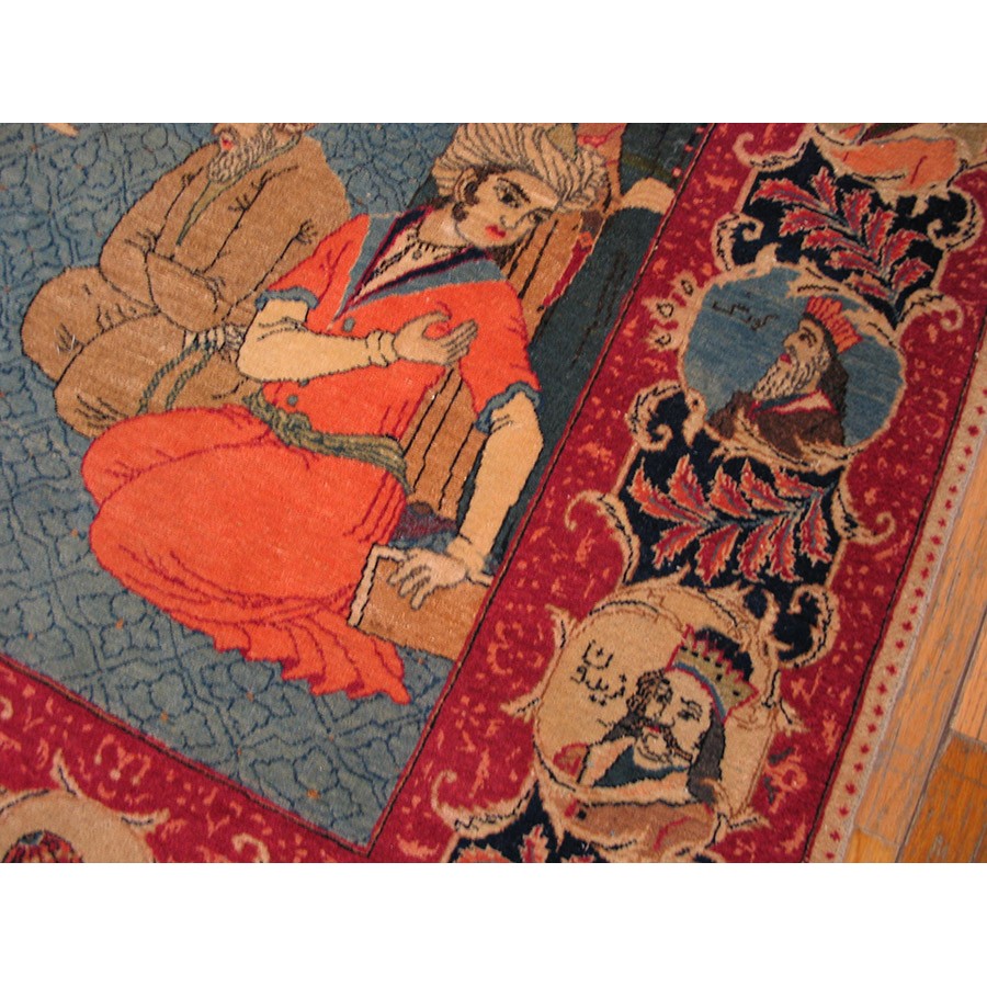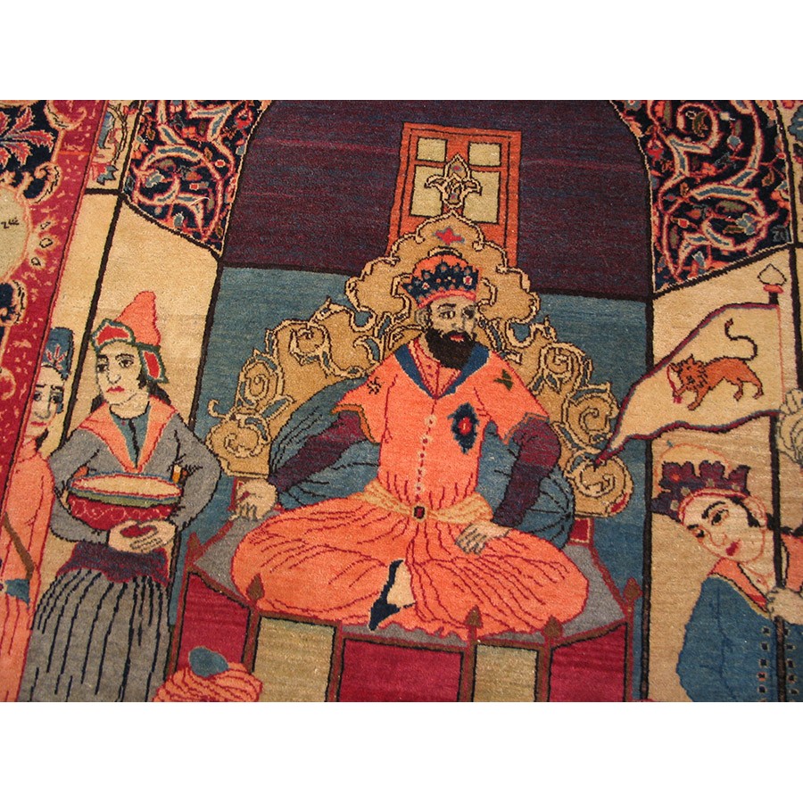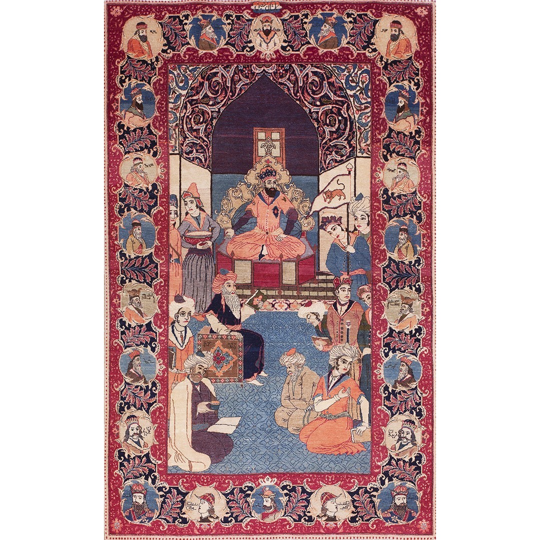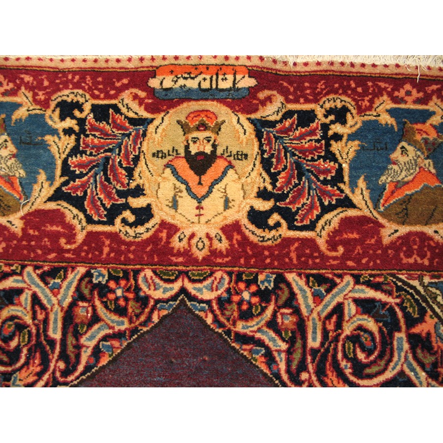 Besides the majority production of medallion carpets, Kashan also indulges in pictorial fantasies, as in this c. 1940 depiction of a royal court scene with an enthroned king under an arabesque filled ogee arch and a surrounding gaggle of courtiers and flunkies. The weave is very fine and the condition is excellent as befits a rug designed as a wall hanging. The top border inscription indicates a Kashan origin. Images of Persian kings fill the border medallions.