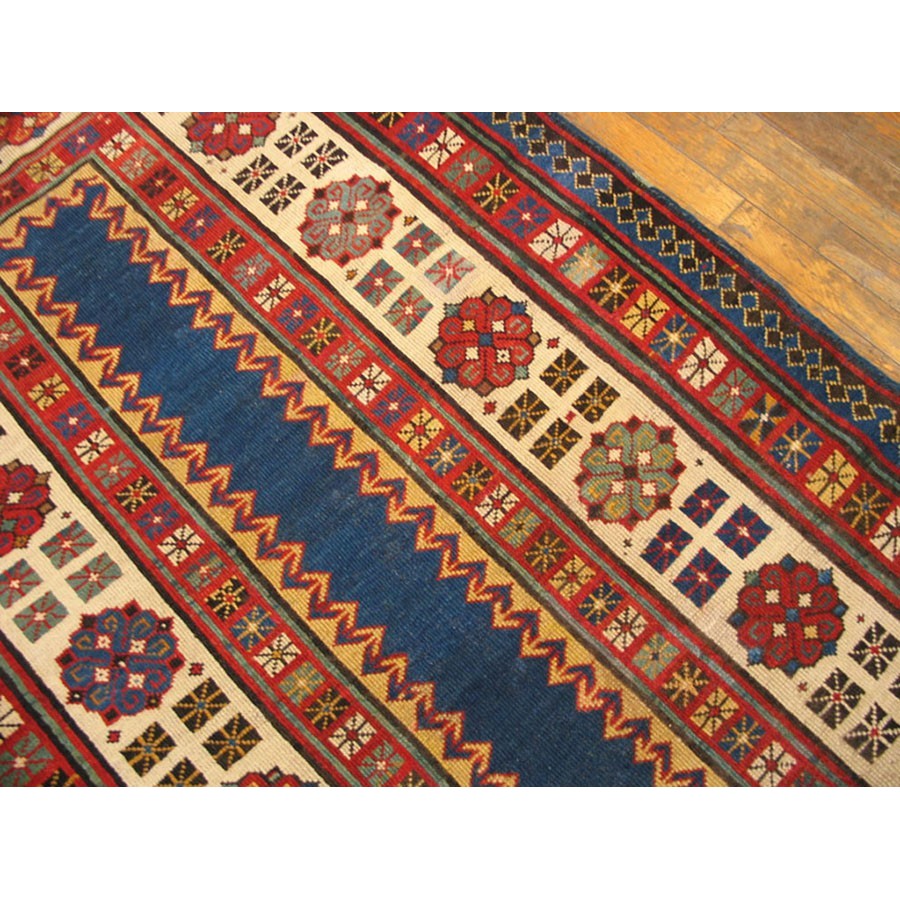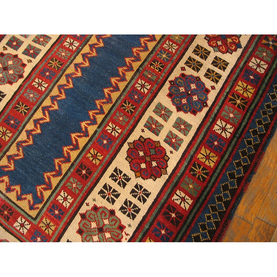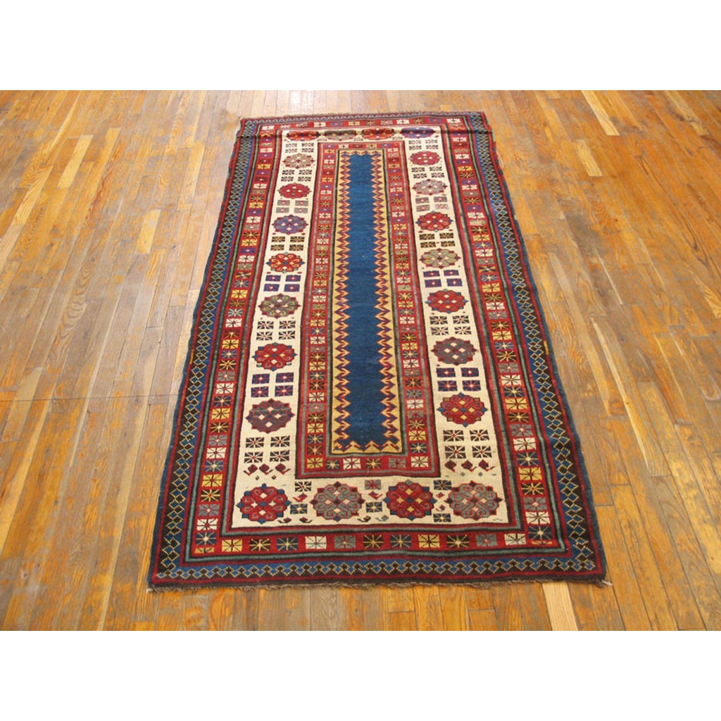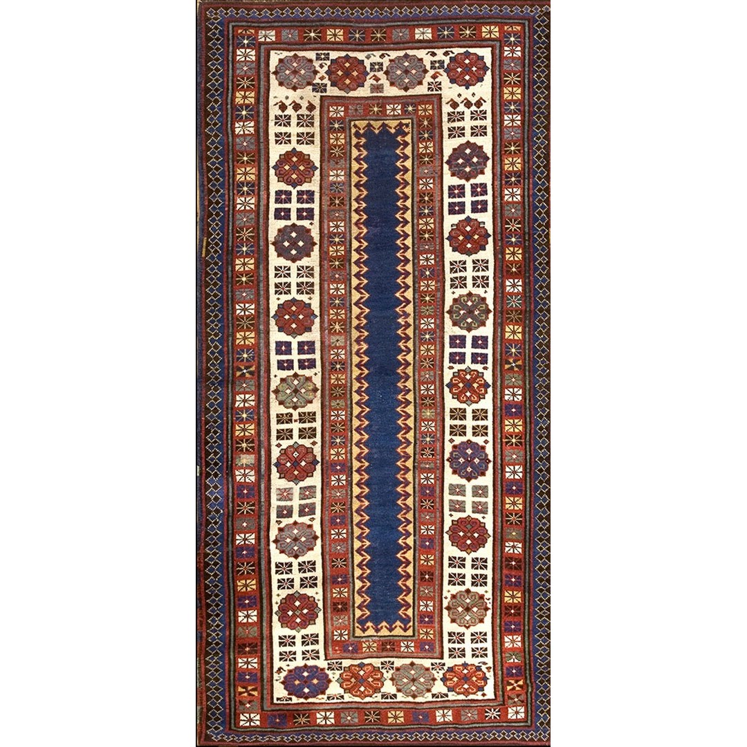 DescriptionCaucasianThis is the general heading for all rugs made in the Caucasus mountains and in the trans-Caucasus areas, north of the Arax River, and between the Black and Caspian Seas. This includes rugs from the Kazak, Karabagh, Gendje, Koghan, Talish, Akstafa, Shirvan, Baku, Kuba and hesghi districts and the variants and subtypes thereof. The rugs are usually in scatter sizes and of all wool construction, with bold colors and geometric patterns, from the 18th through 20th centuries. Prices range widely depending on rarity, color, design and condition. A strong collector market exists for the better examples. KazakThe thickly piled, boldy colored strongly geometric Caucasian rugs woven by villages in the Kars (Turkey) Tiflis (Georgia) Erivan (Armenia) triangle. Both prayer and non-directional formats abound and there are numerous subtypes depending on the town of origin as well as pattern similarities. Always popular with both collectors and decorators, the best examples were woven between 1840 and 1900 and rare exceed 6 x 10 in size. These are the most recognizable and paradigmatic of all Caucasian rugs, perennially popular in both Europe and America. | |