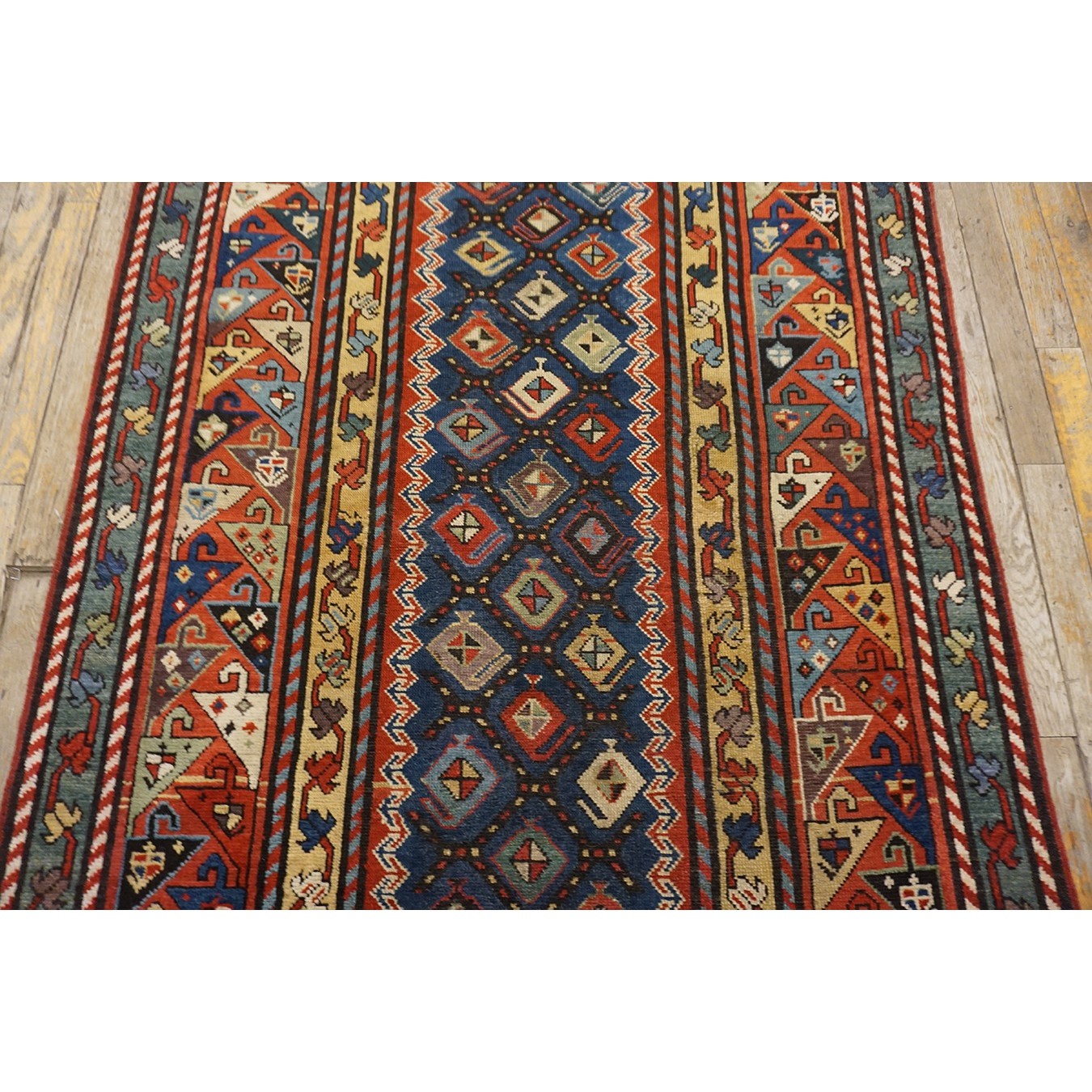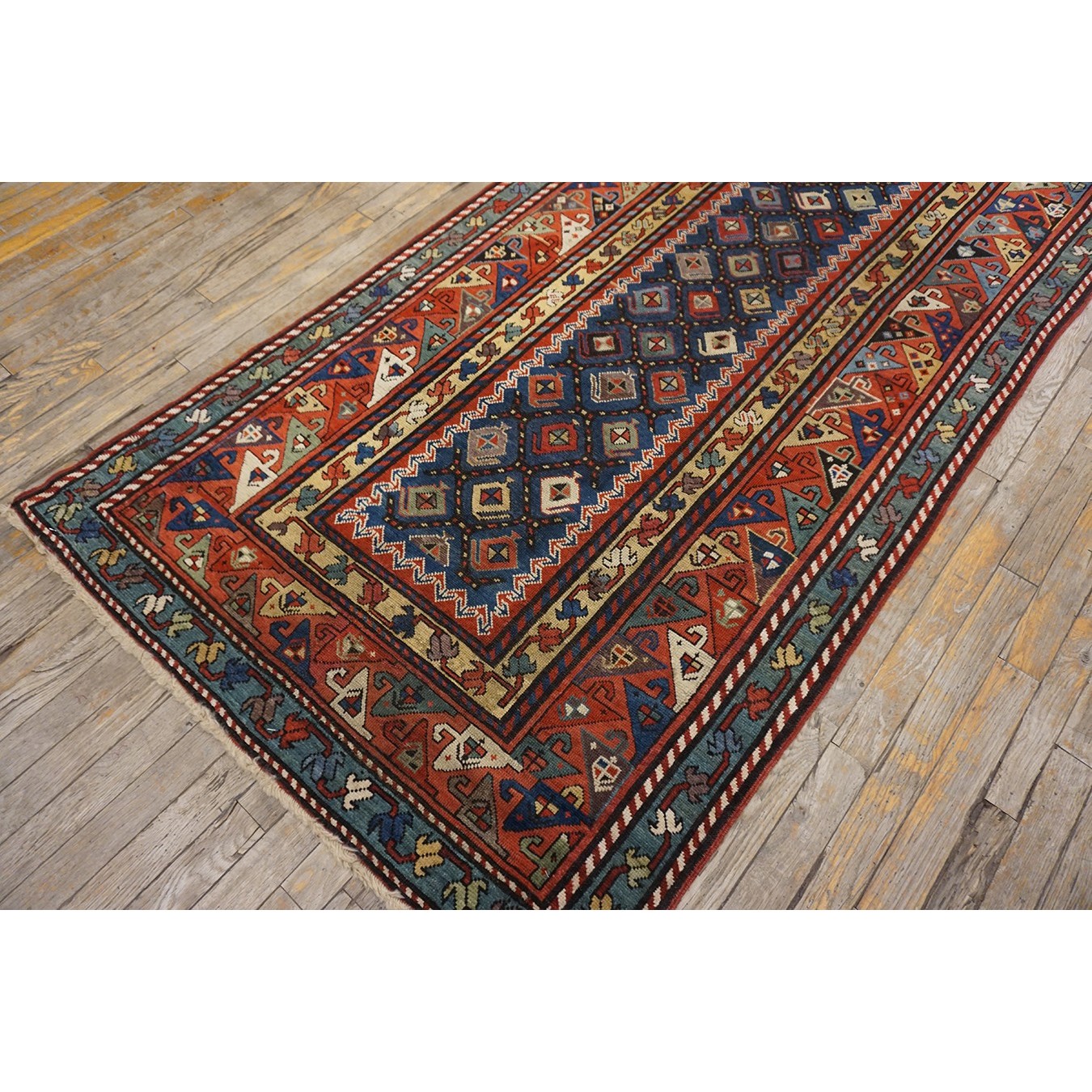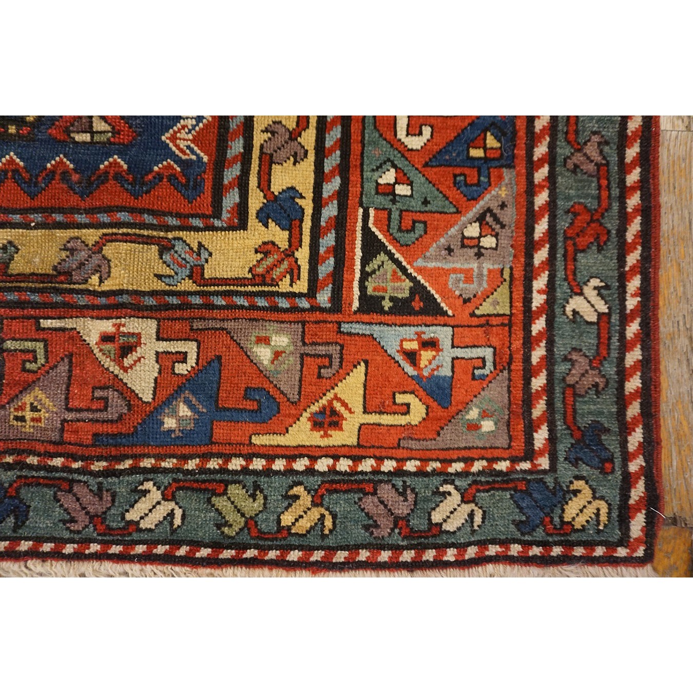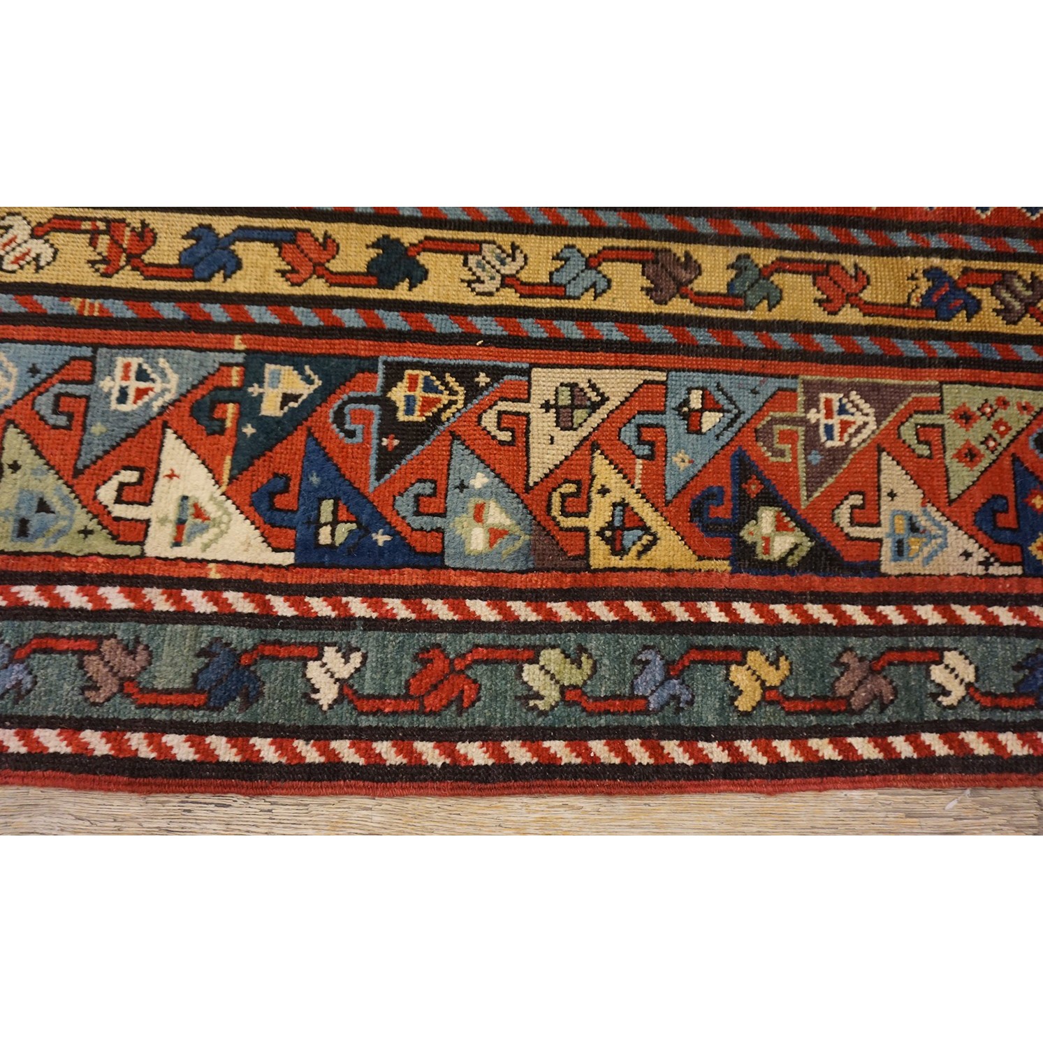 DescriptionCaucasianThis is the general heading for all rugs made in the Caucasus mountains and in the trans-Caucasus areas, north of the Arax River, and between the Black and Caspian Seas. This includes rugs from the Kazak, Karabagh, Gendje, Koghan, Talish, Akstafa, Shirvan, Baku, Kuba and hesghi districts and the variants and subtypes thereof. The rugs are usually in scatter sizes and of all wool construction, with bold colors and geometric patterns, from the 18th through 20th centuries. Prices range widely depending on rarity, color, design and condition. A strong collector market exists for the better examples. KazakThe thickly piled, boldy colored strongly geometric Caucasian rugs woven by villages in the Kars (Turkey) Tiflis (Georgia) Erivan (Armenia) triangle. Both prayer and non-directional formats abound and there are numerous subtypes depending on the town of origin as well as pattern similarities. Always popular with both collectors and decorators, the best examples were woven between 1840 and 1900 and rare exceed 6 x 10 in size. These are the most recognizable and paradigmatic of all Caucasian rugs, perennially popular in both Europe and America. | |