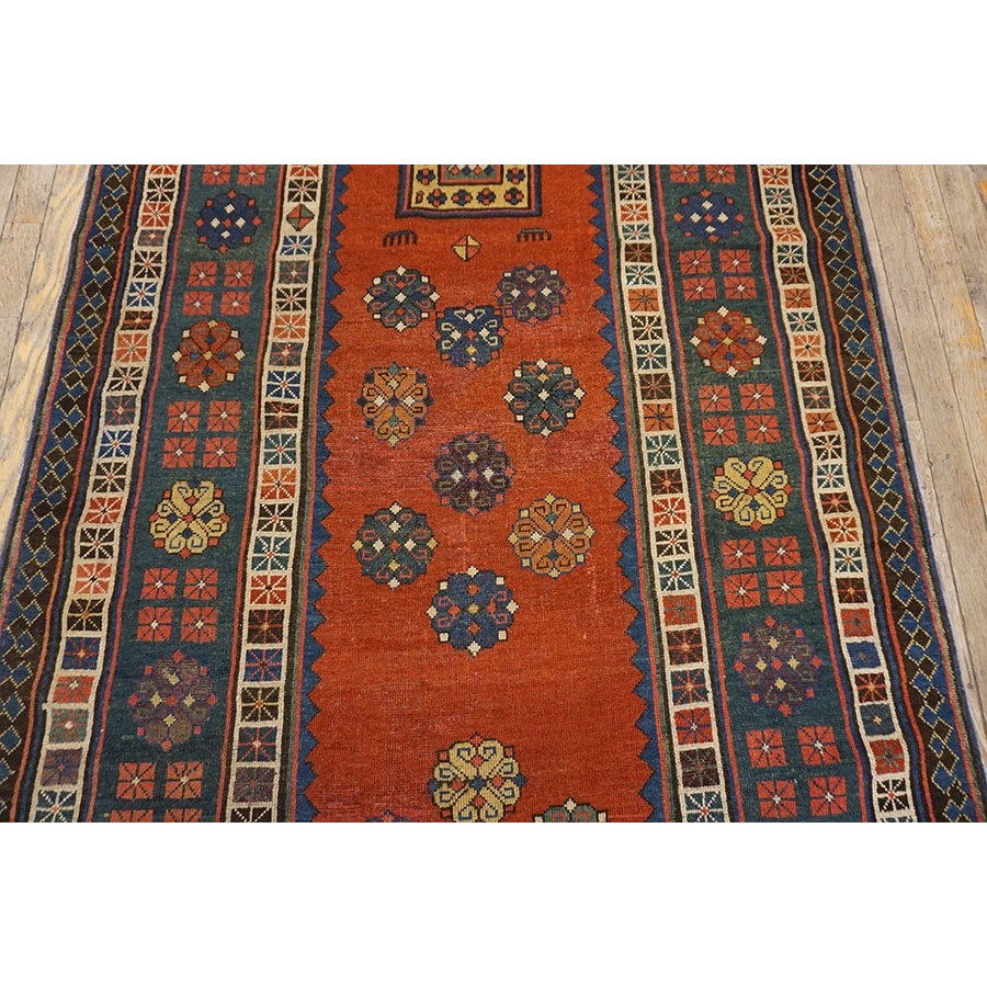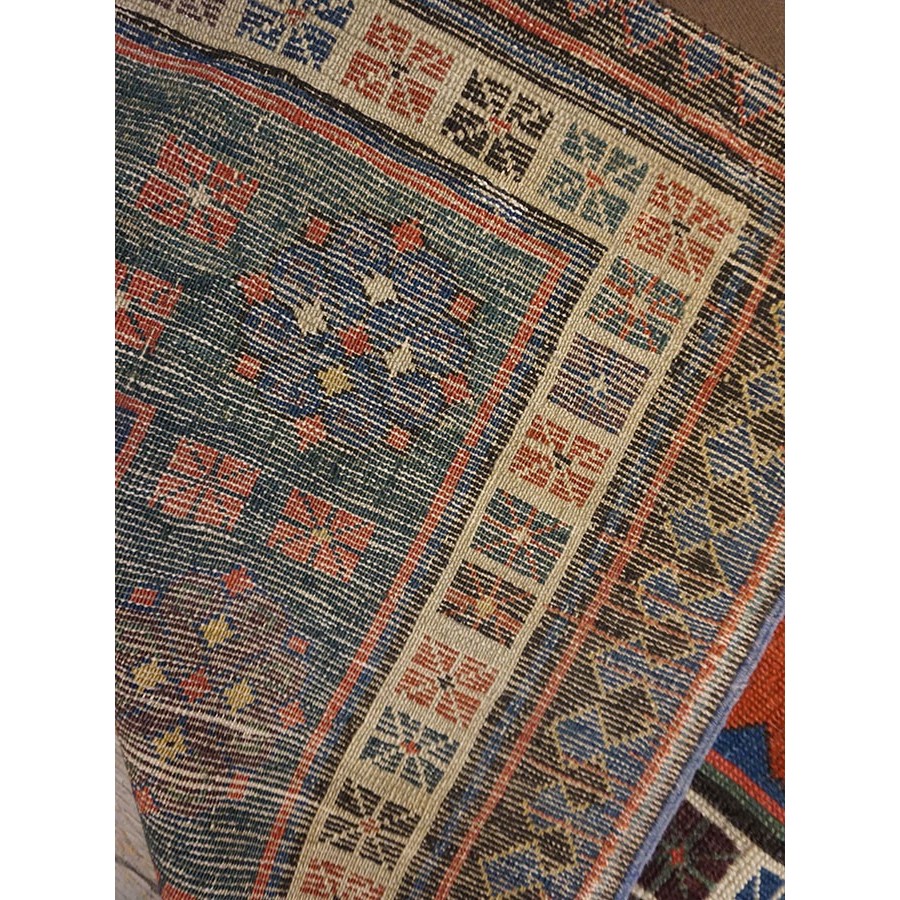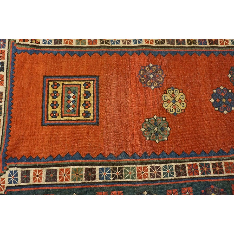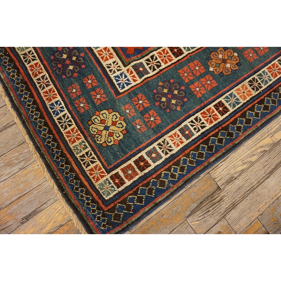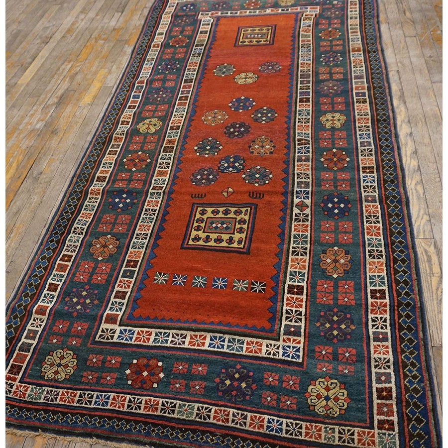 DescriptionCaucasianThis is the general heading for all rugs made in the Caucasus mountains and in the trans-Caucasus areas, north of the Arax River, and between the Black and Caspian Seas. This includes rugs from the Kazak, Karabagh, Gendje, Koghan, Talish, Akstafa, Shirvan, Baku, Kuba and hesghi districts and the variants and subtypes thereof. The rugs are usually in scatter sizes and of all wool construction, with bold colors and geometric patterns, from the 18th through 20th centuries. Prices range widely depending on rarity, color, design and condition. A strong collector market exists for the better examples. KazakThe thickly piled, boldy colored strongly geometric Caucasian rugs woven by villages in the Kars (Turkey) Tiflis (Georgia) Erivan (Armenia) triangle. Both prayer and non-directional formats abound and there are numerous subtypes depending on the town of origin as well as pattern similarities. Always popular with both collectors and decorators, the best examples were woven between 1840 and 1900 and rare exceed 6 x 10 in size. These are the most recognizable and paradigmatic of all Caucasian rugs, perennially popular in both Europe and America. | |